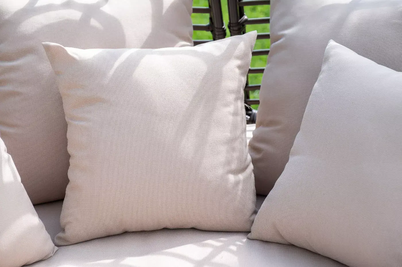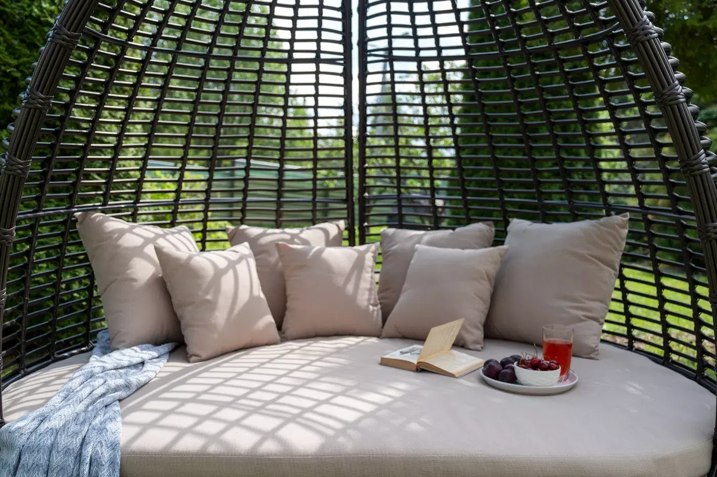 Функциональная полукруглая кровать выполнена плетением вручную из искусственного ротанга. Конструкция усилена алюминиевым каркасом.