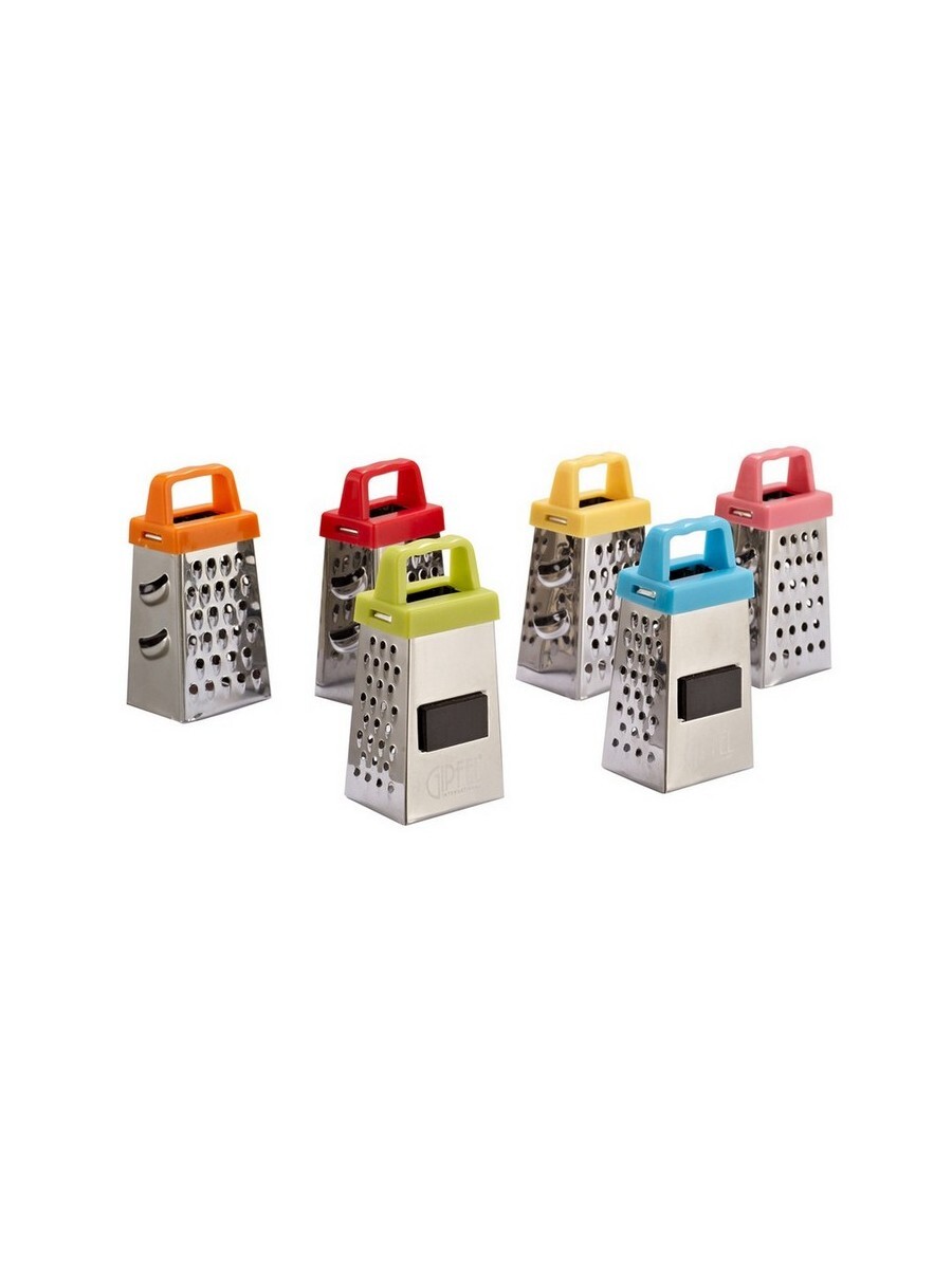 Терка Gipfel MINIMI 9842. Терка четырехсторонняя, с крупными и мелкими зубьями, а также с ножами для нарезания продуктов слайсами для чипсов и запеканок. С одной стороны у терки магнит, ее можно повесить на холодильник или другую металлическую поверхность. Терка имеет компактный размер, всего 7,5 см, что создает удобство при хранении. Сделана из нержавеющей стали. Толщина: 0,25 мм.