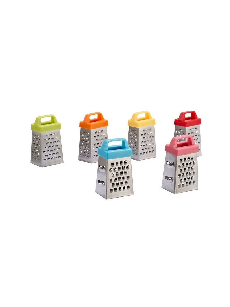 Терка Gipfel MINIMI 9843. Терка четырехсторонняя, с крупными и мелкими зубьями, а также с ножами для нарезания продуктов слайсами для чипсов и запеканок. Терка имеет компактный размер, всего 6 см, что создает удобство при хранении. Сделана из нержавеющей стали. Толщина: 0,25мм.