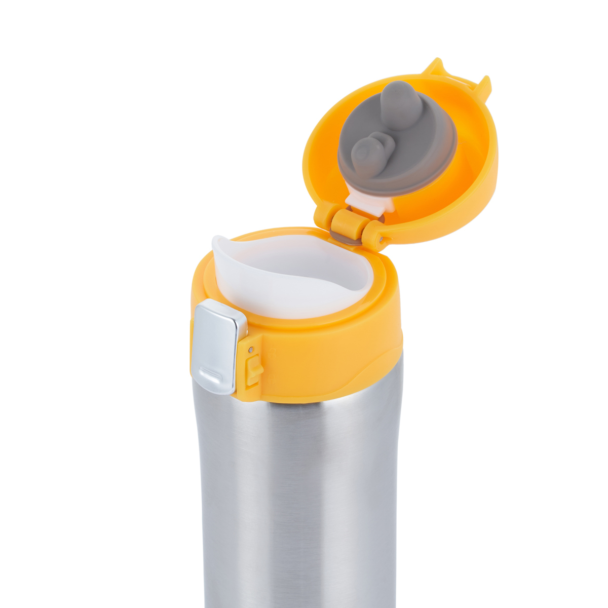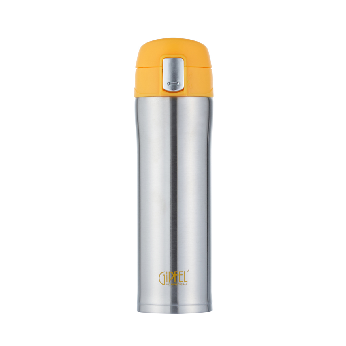 Термокружка вакуумная Gipfel BONN 51045. Объем 430 мл. Высота термокружки 23,5 см. Диаметр 6,5 см. У термокружки герметичная крышка на замке. Под крышкой силиконовый уплотнитель. Корпус сделан из нержавеющей стали 304. Крышка пластиковая желтого цвета. Термокружка упакована в фирменную коробку.