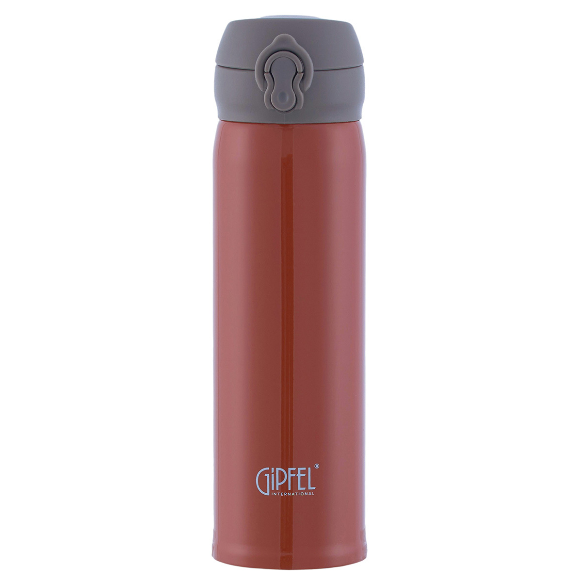 У кружки оригинальный дизайн. Она выполнена в стальном цвете с крышкой красного цвета. На корпус нанесен логотип Gipfel.