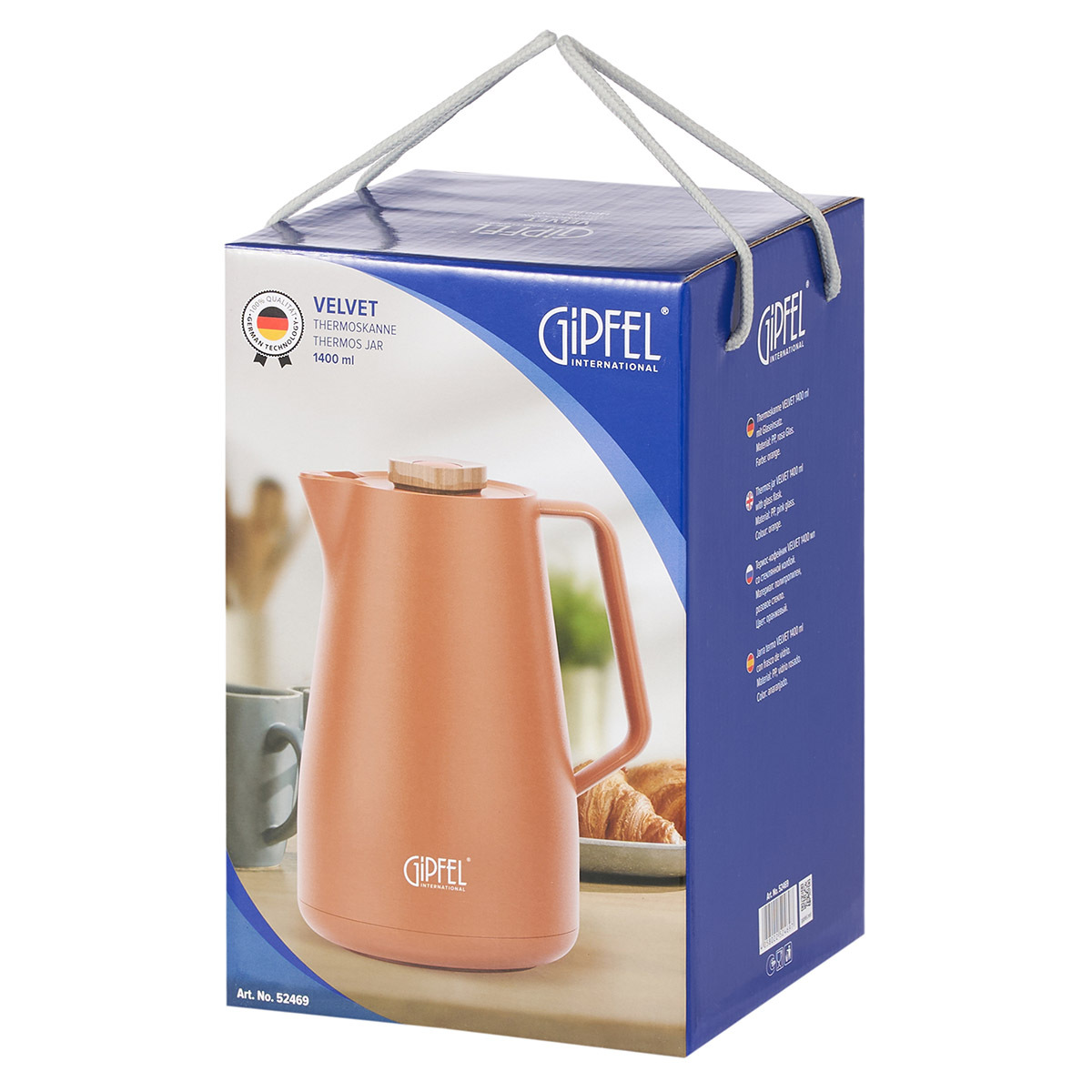 Термос-кофейник Gipfel Velvet 52469 1,4 л со стеклянной колбой. Размеры: высота 26 см, диаметр дна 15 см, диаметр горлышка внутри 5 см, ширина от носика до ручки 18 см.