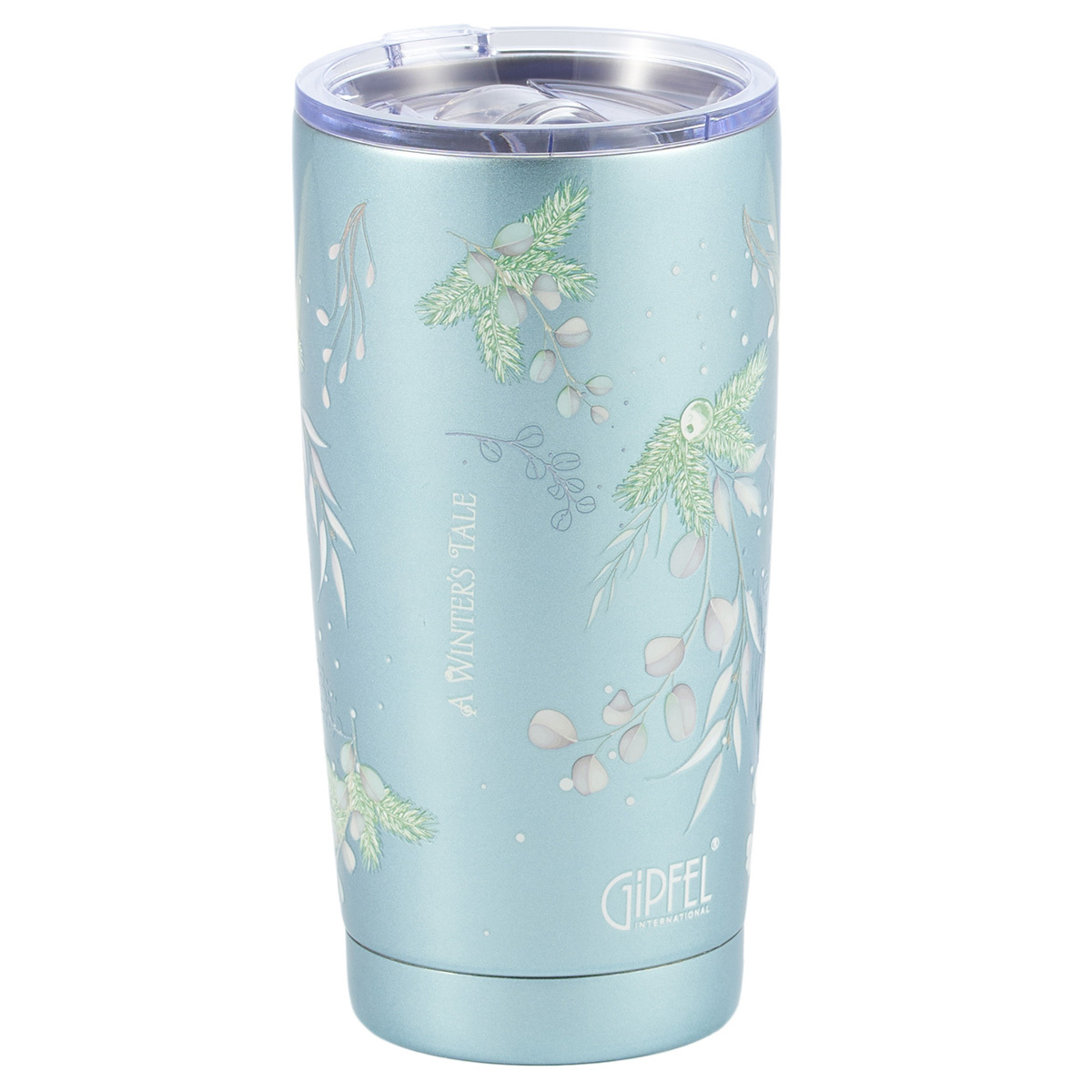 У стакана праздничный новогодний дизайн. Он выполнен в мятно-зеленом цвете и декорирован рисунком из белых снежинок и веточек, с надписью "A winter tale" и логотипом Gipfel.