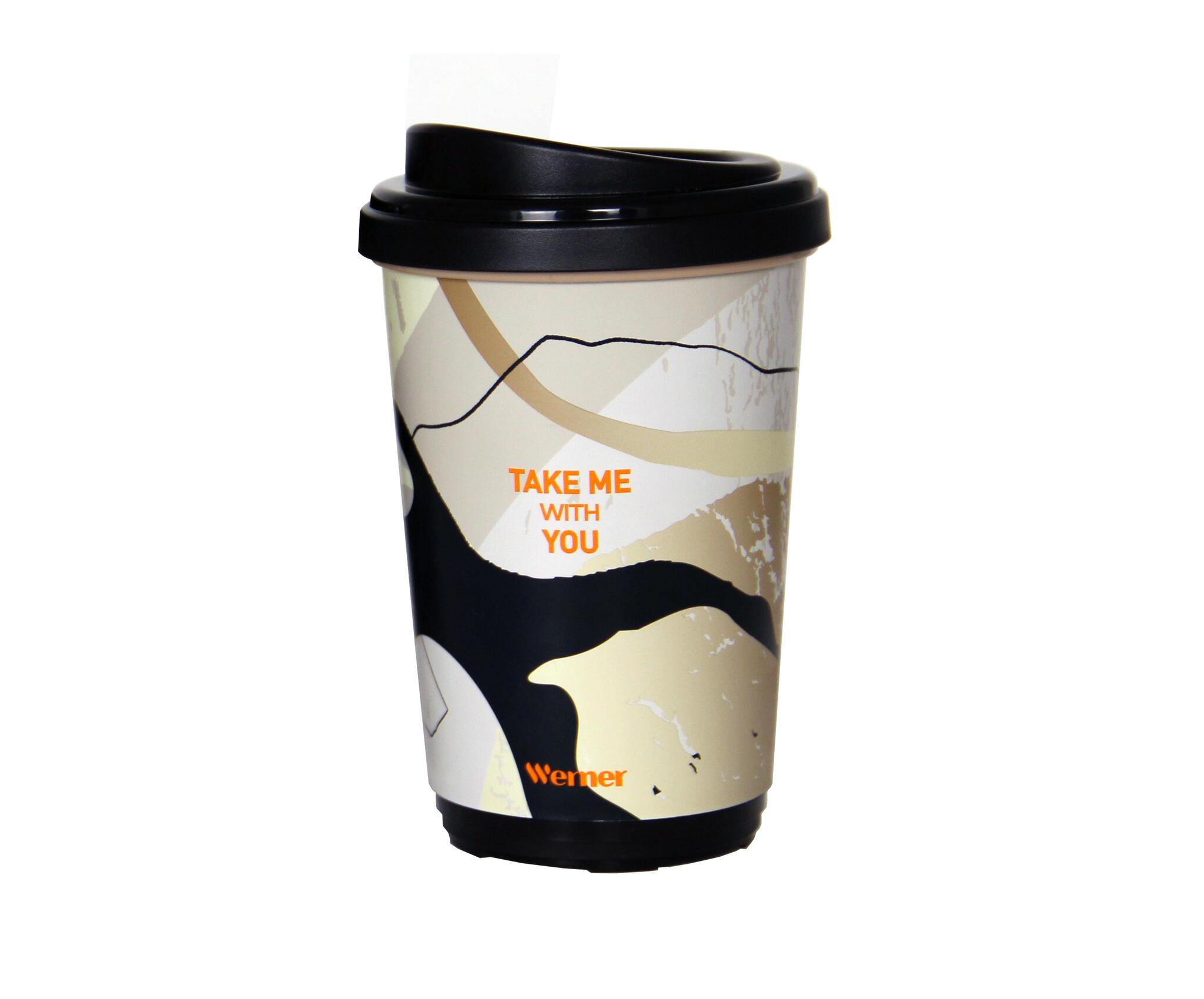 Термостакан с двойными стенками и крышкой Werner 51484. Объем стакана 400 мл. Двуслойный термостакан - идеальное решение для энергичной жизни в большом городе. Воздушная прослойка между стенками сохраняет тепло напитка до двух часов: стакан удобно взять с собой на прогулку, в поездку на автомобиле или на работу. Термостакан изготавливается из безопасного полипропилена, и не содержит бисфенол А, фталаты, меламин и другие вредные вещества (в отличие от одноразовых стаканов).