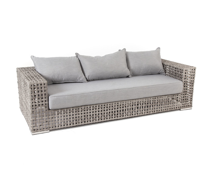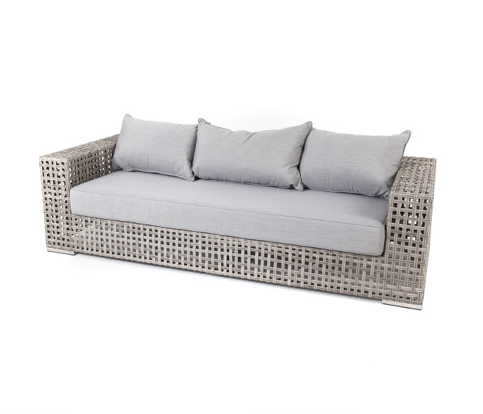 Размер модели – 2280×920×610 мм. Каркас оплетен вручную с помощью плоского искусственного ротанга. Мебель выполнена в сером оттенке.
