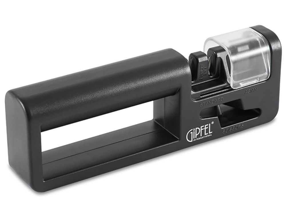 Точило для ножей Gipfel 2924. Размер 19,5х3,5х6,5 см. В точиле есть функция заточки ножниц. Материал: керамика, карбид вольфрама, силикон, пластик. Точило черного цвета с прозрачной крышечкой над поверхностью для заточки.