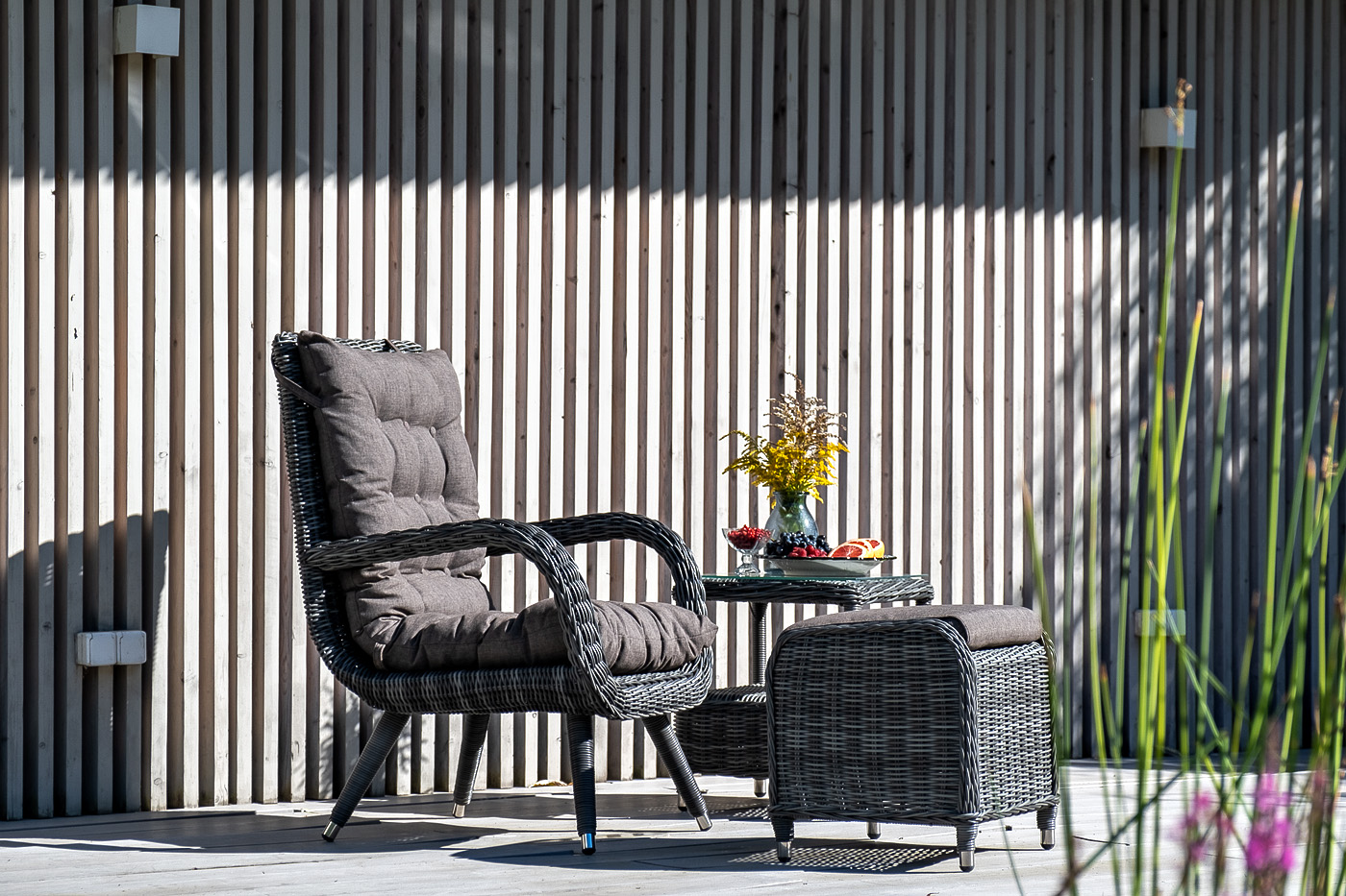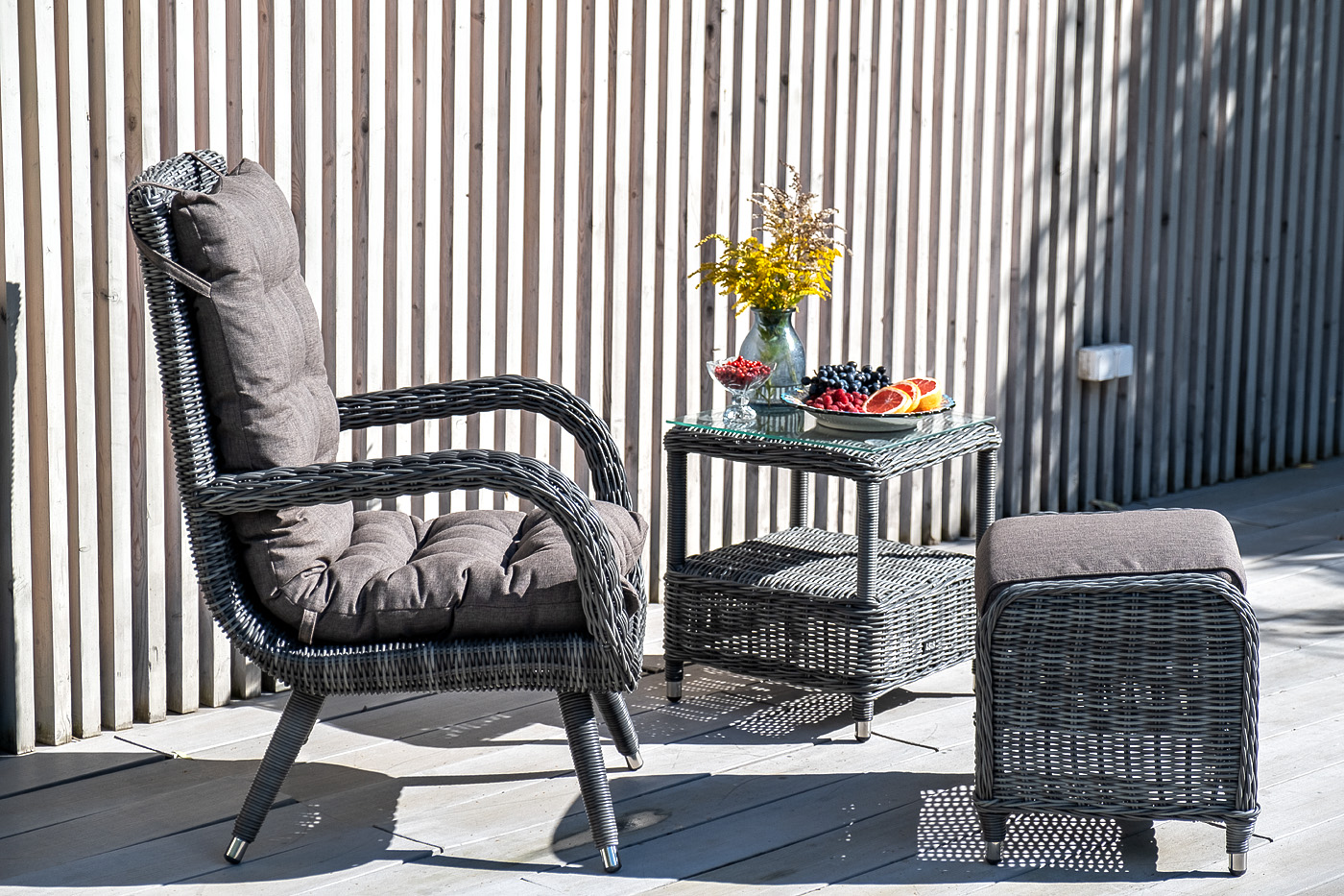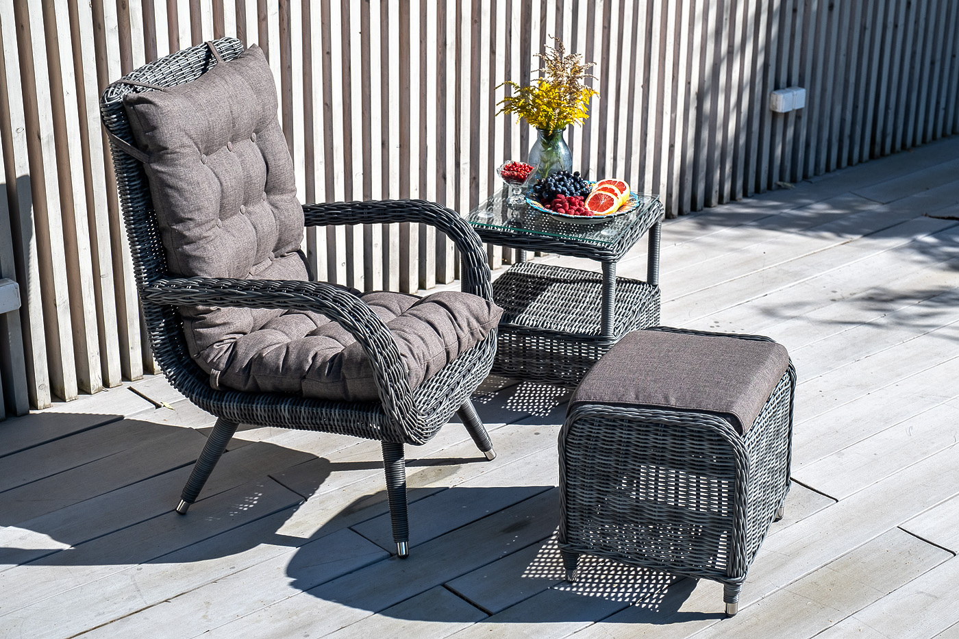 Садовое кресло дополнено мягкими подушками для комфортного размещения. Они выполнены в сером цвете. При их пошиве используется полиэстер с плотностью 300гр/м2. Влагоотталкивающая пропитка усиливает защитные свойства материала.