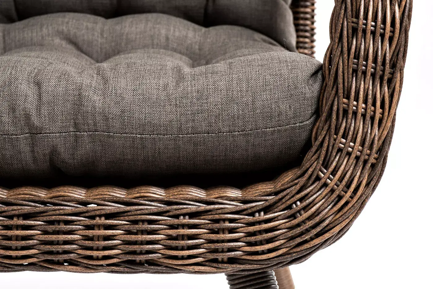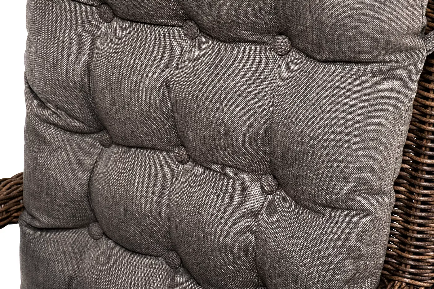 Садовое кресло дополнено мягкими подушками для комфортного размещения. Они выполнены в сером цвете. При их пошиве используется полиэстер с плотностью 300гр/м2. Влагоотталкивающая пропитка усиливает защитные свойства материала.