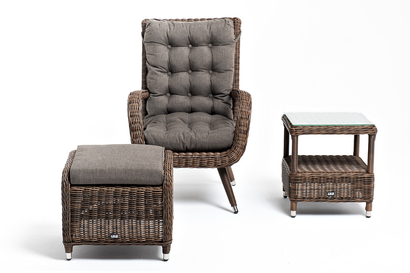 Кресло и пуф укомплектованы подушками со съёмными чехлами из влагостойкого 100%-го полиэстера.