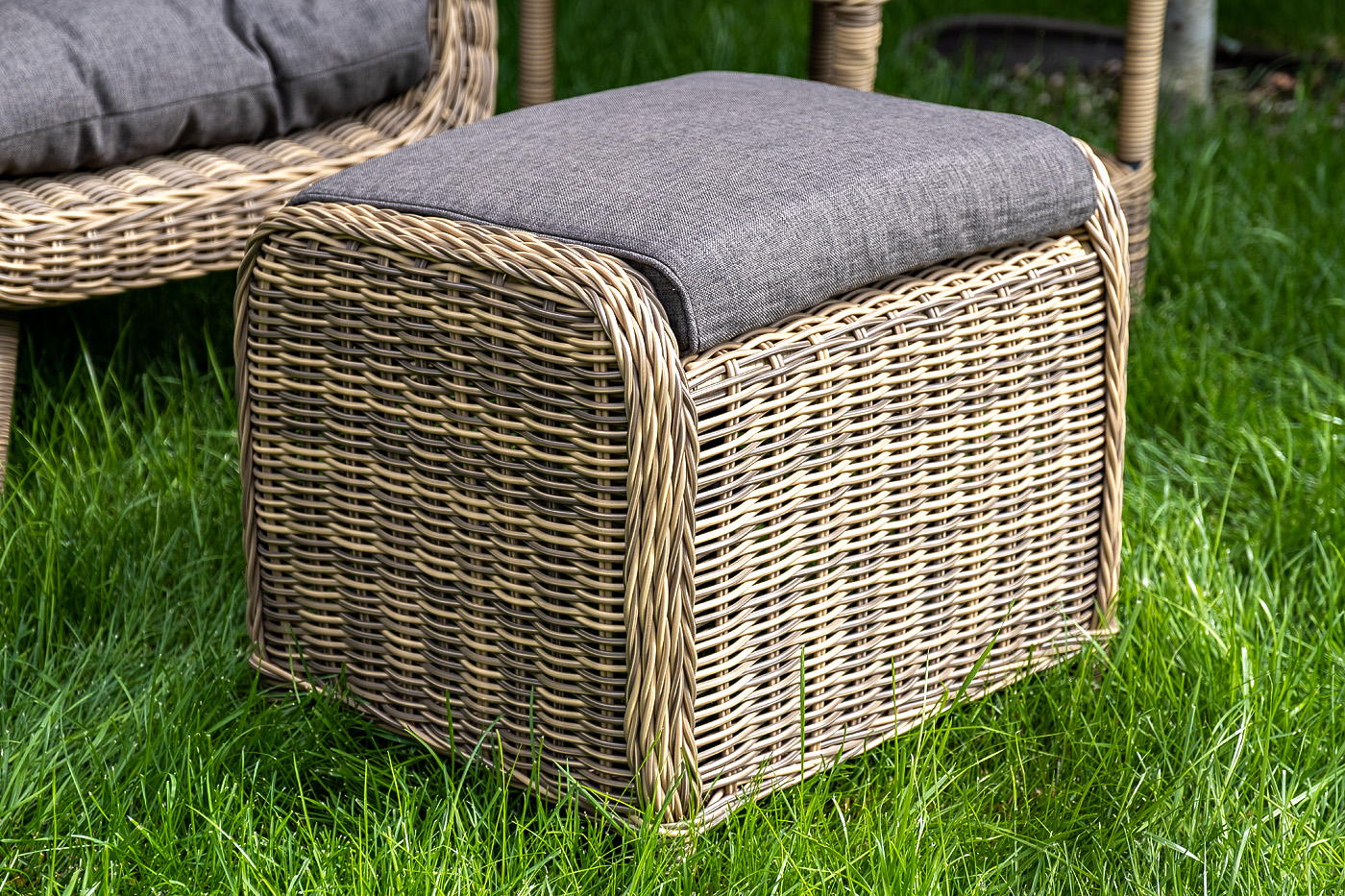 Кресло и пуф укомплектованы подушками со съёмными чехлами из влагостойкого 100%-го полиэстера.