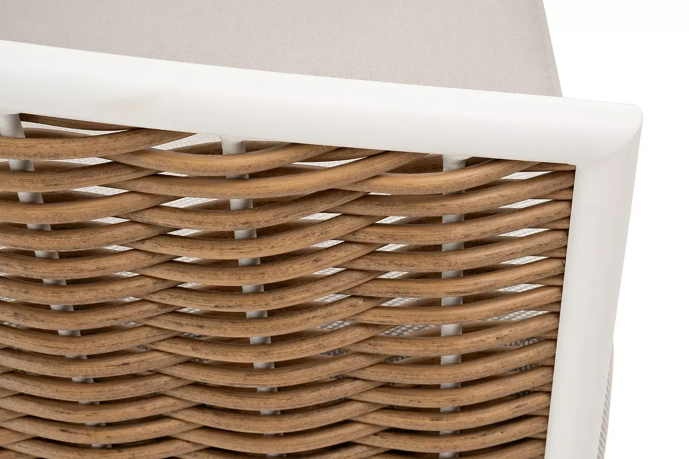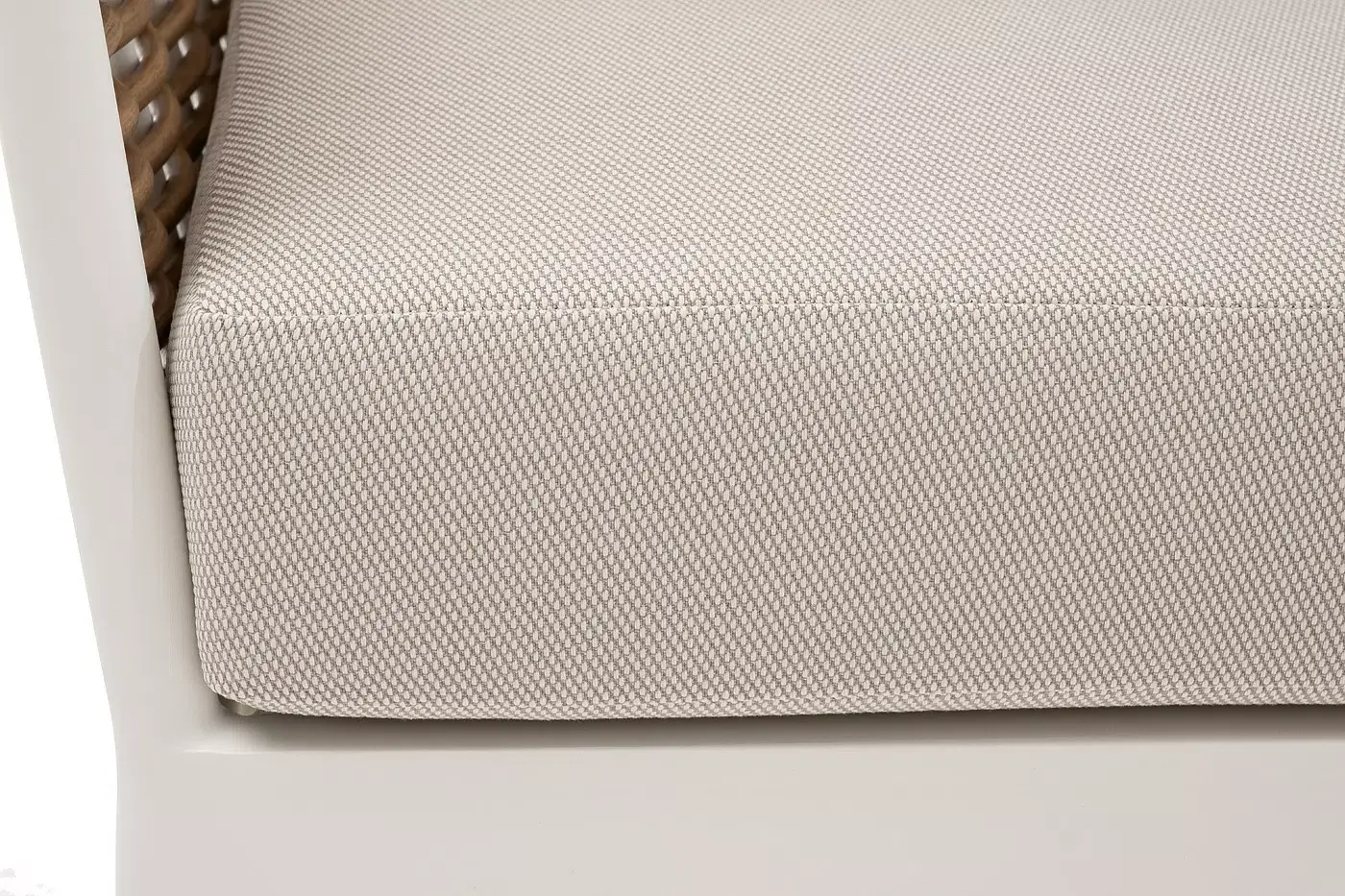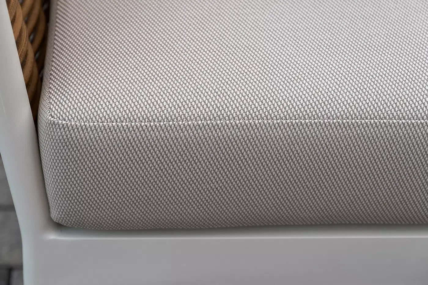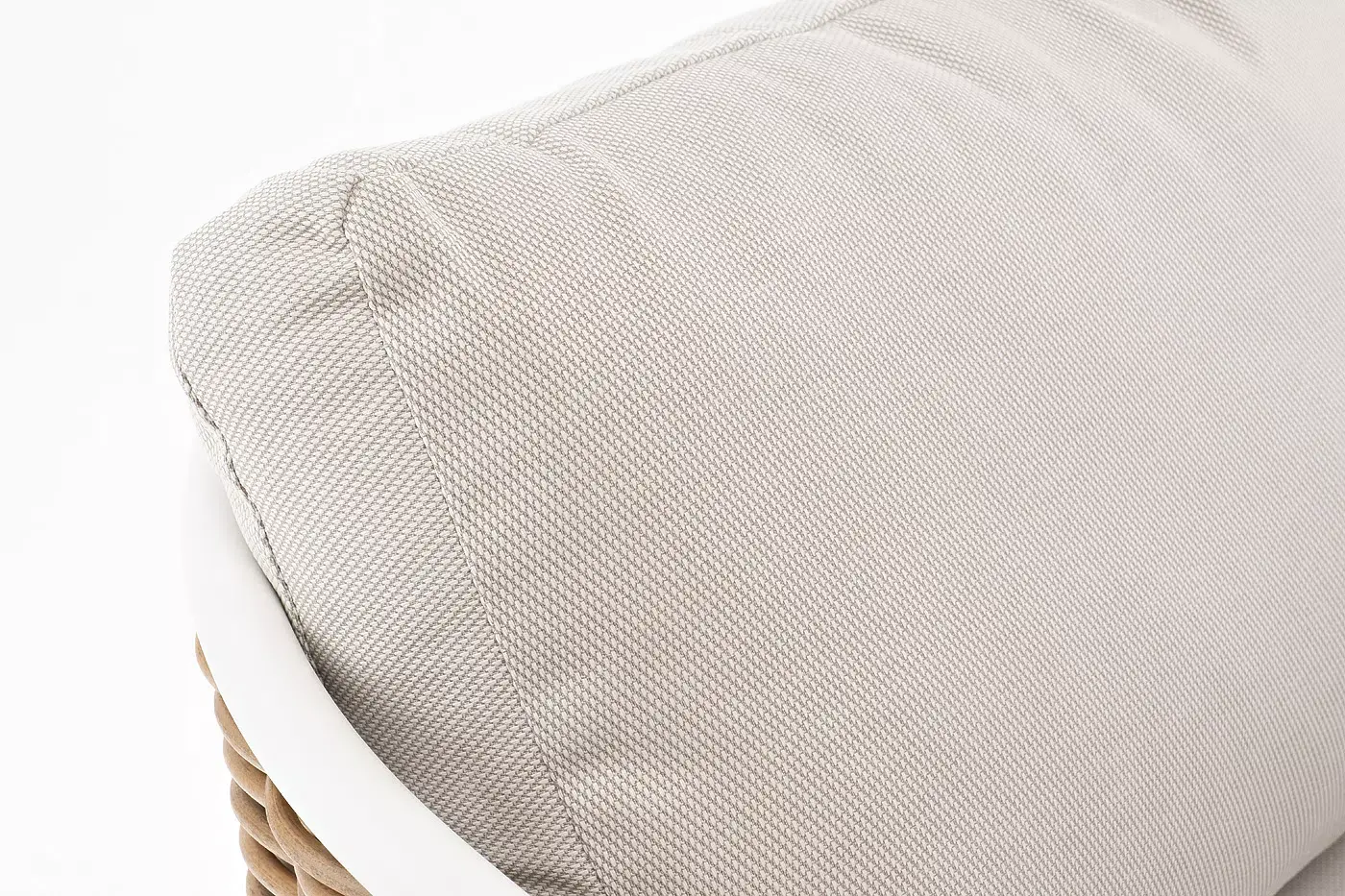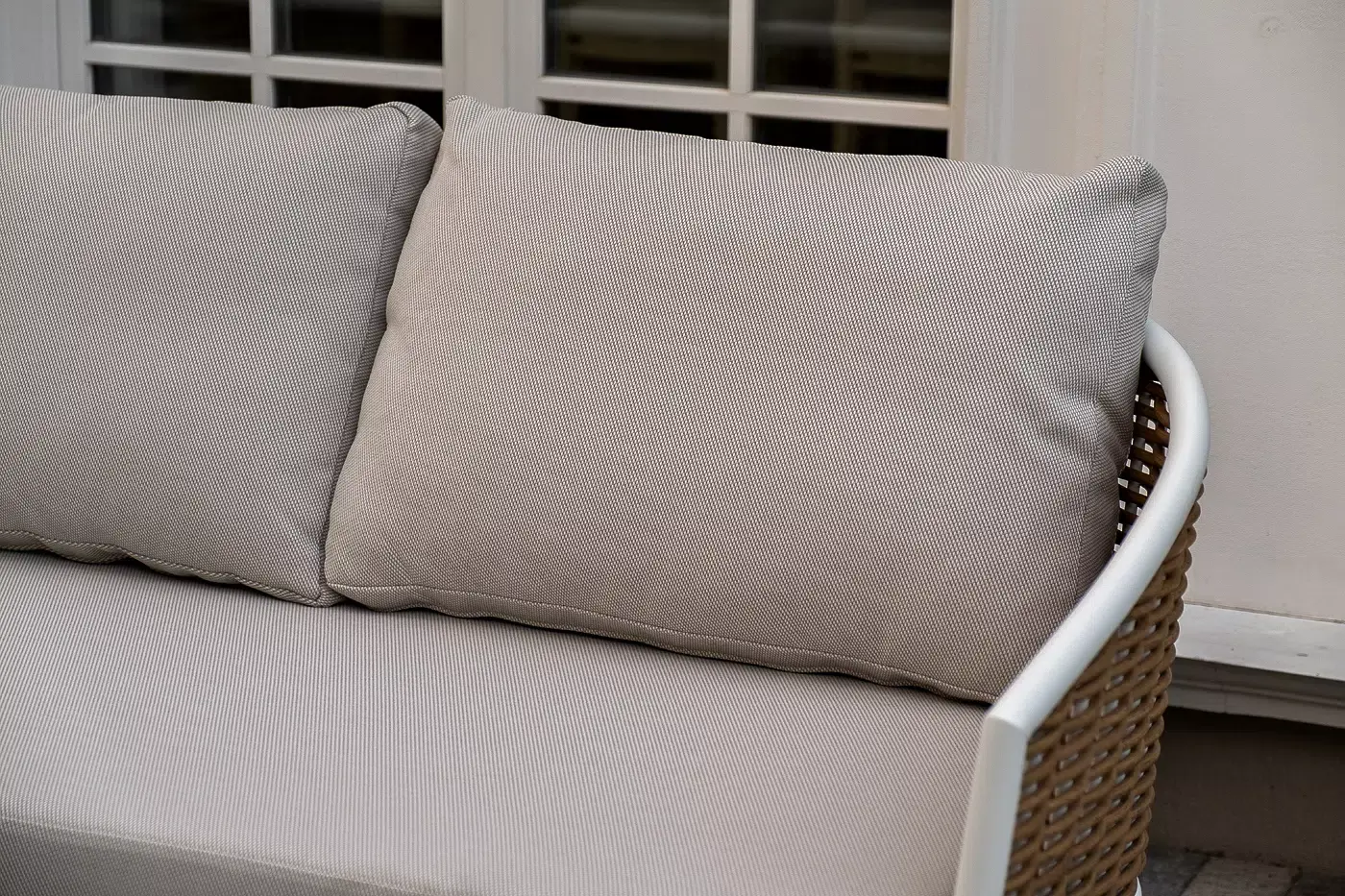 Плетеная мебель дополнена удобными подушками в бежевых чехлах. При их изготовлении используют полиэстер, плотность – 300гр/м2. Он обрабатывается влагоотталкивающей пропиткой для повышения защитных свойств материала.