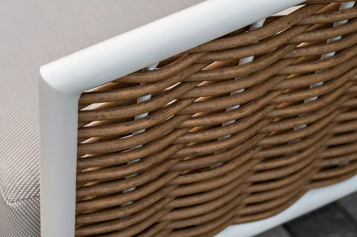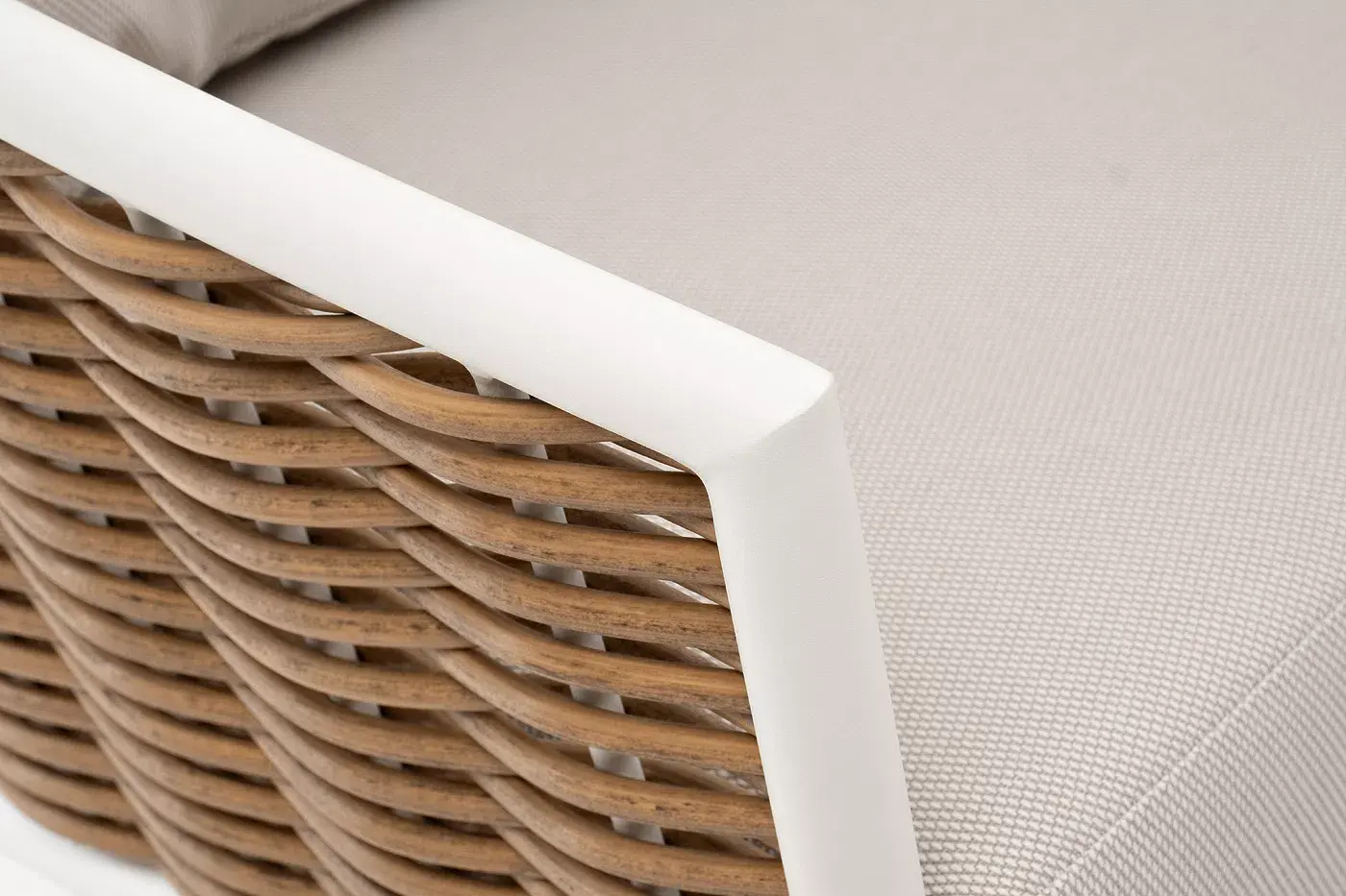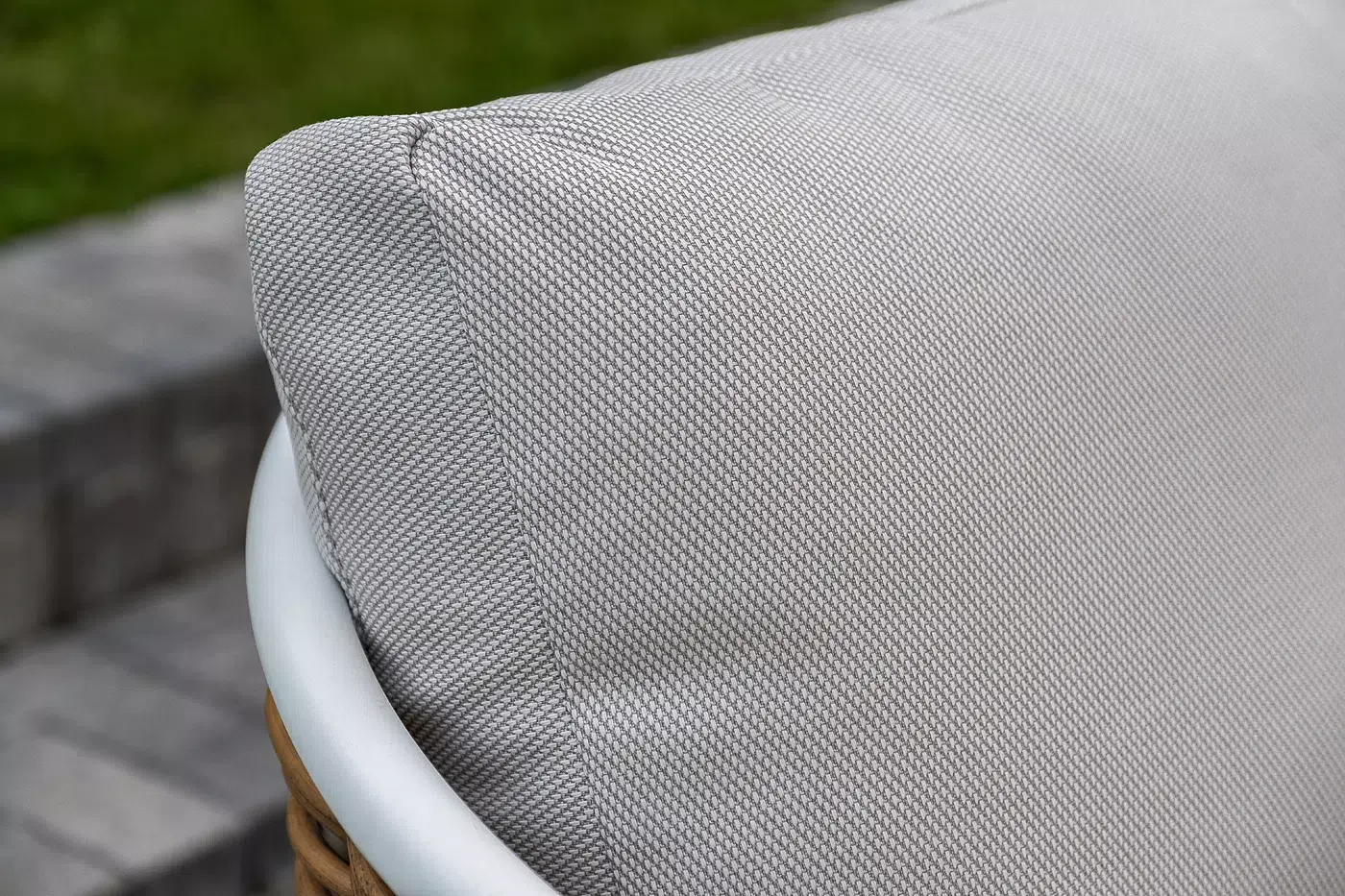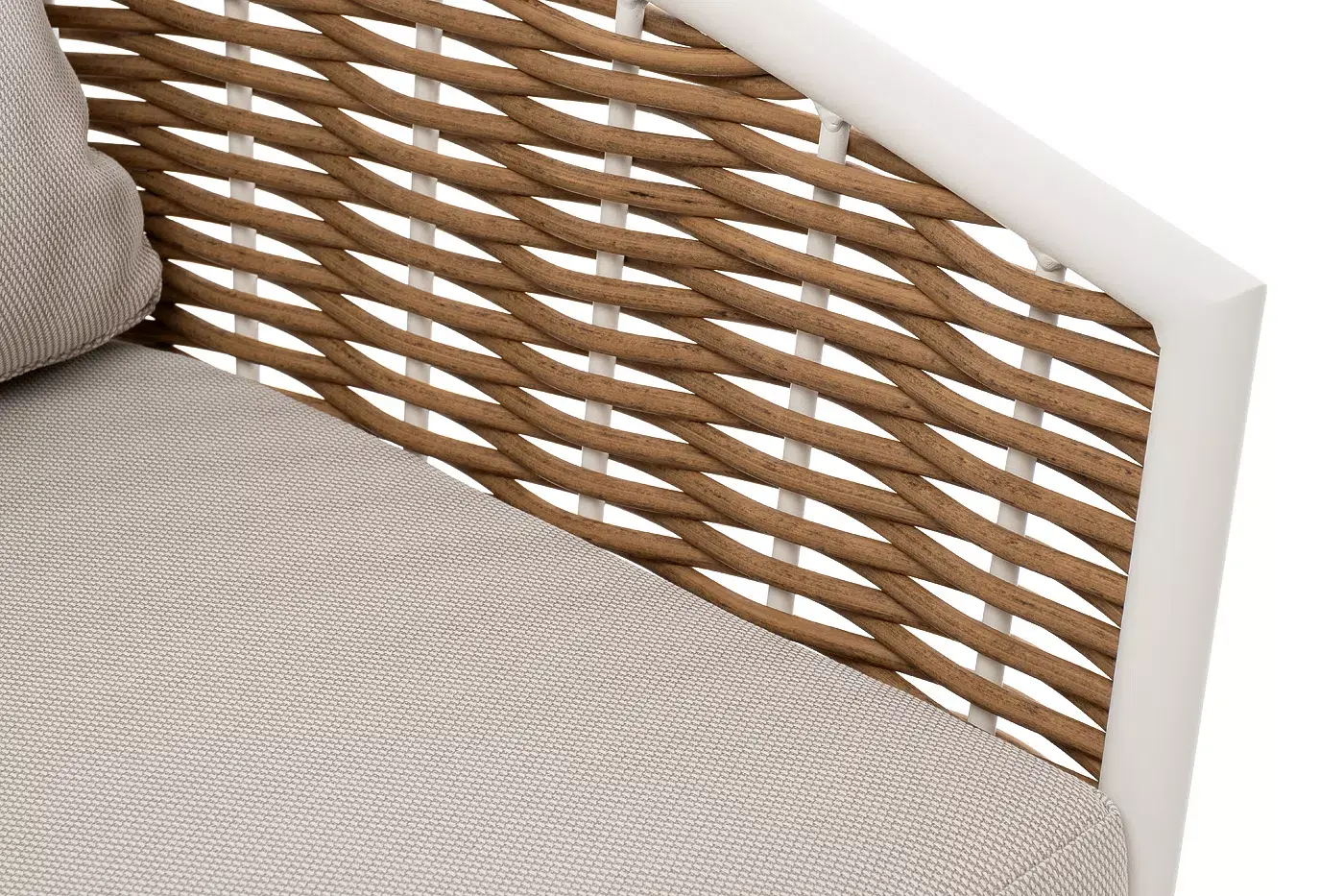 Плетеная мебель дополнена удобными подушками в бежевых чехлах. При их изготовлении используют полиэстер, плотность – 300гр/м2. Он обрабатывается влагоотталкивающей пропиткой для повышения защитных свойств материала.