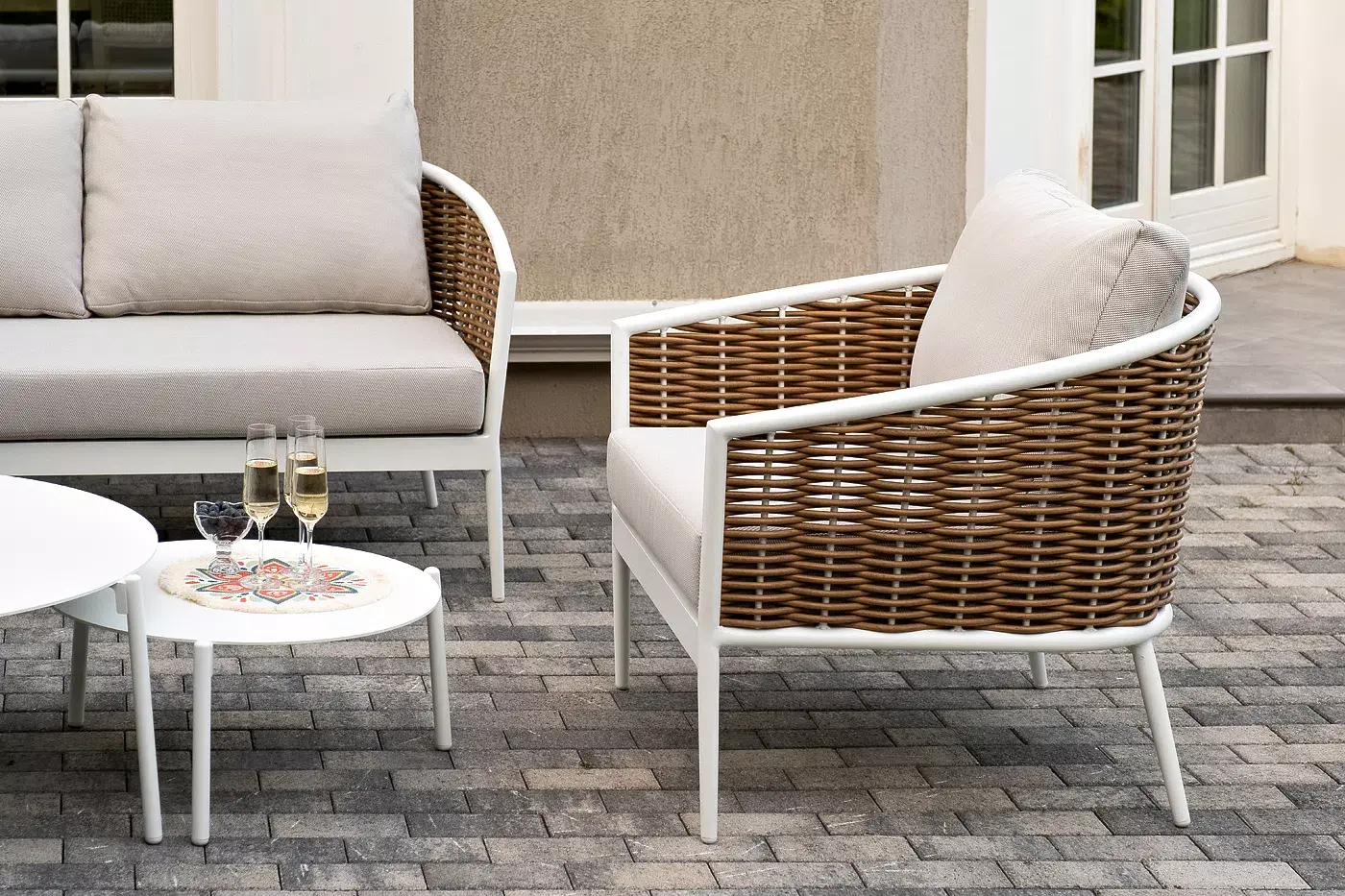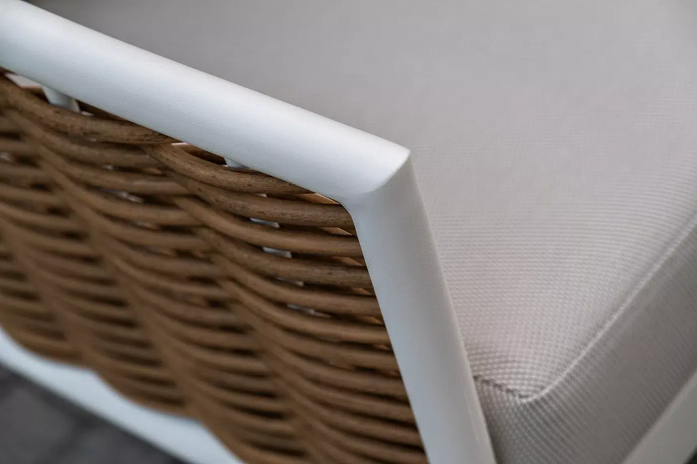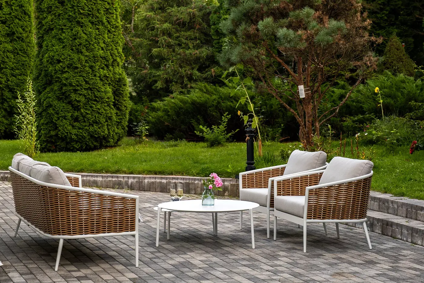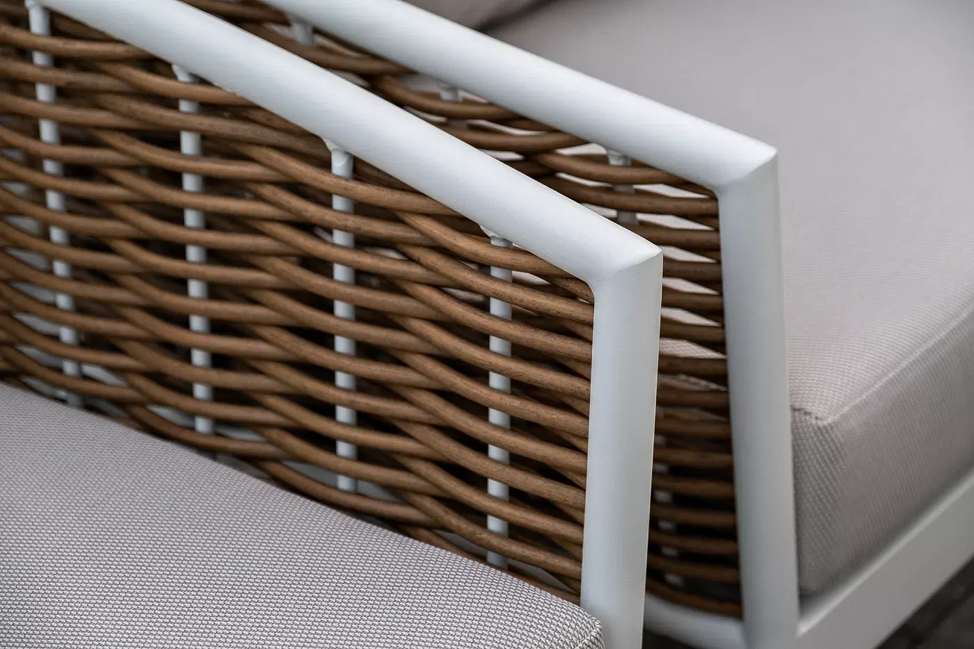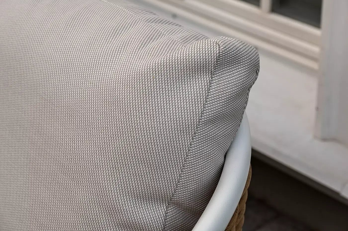 Плетеная мебель дополнена удобными подушками в бежевых чехлах. При их изготовлении используют полиэстер, плотность – 300гр/м2. Он обрабатывается влагоотталкивающей пропиткой для повышения защитных свойств материала.