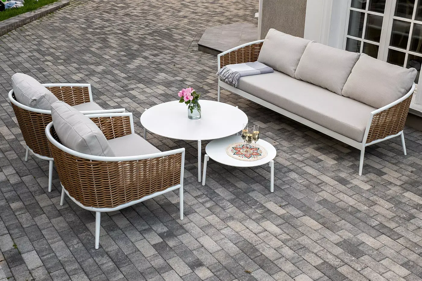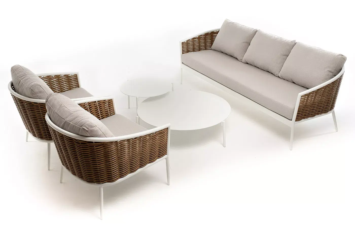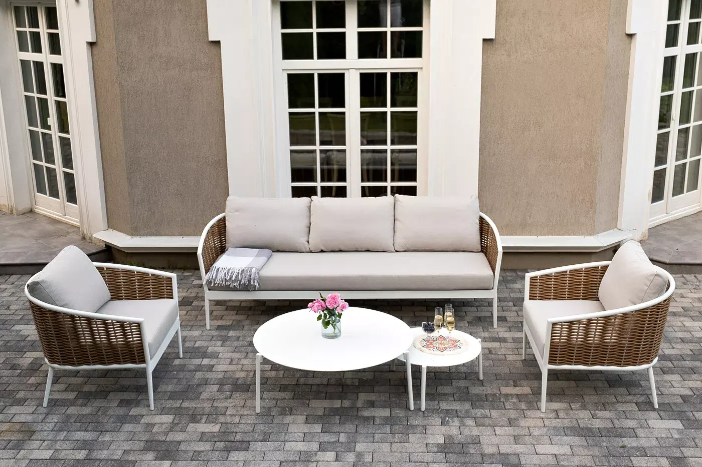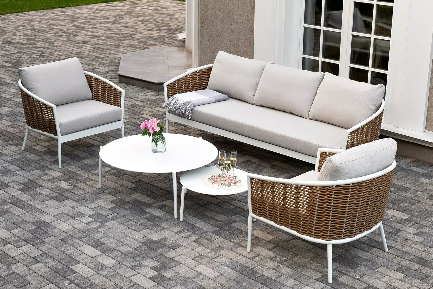 Плетеная мебель дополнена удобными подушками в бежевых чехлах. При их изготовлении используют полиэстер, плотность – 300гр/м2. Он обрабатывается влагоотталкивающей пропиткой для повышения защитных свойств материала.