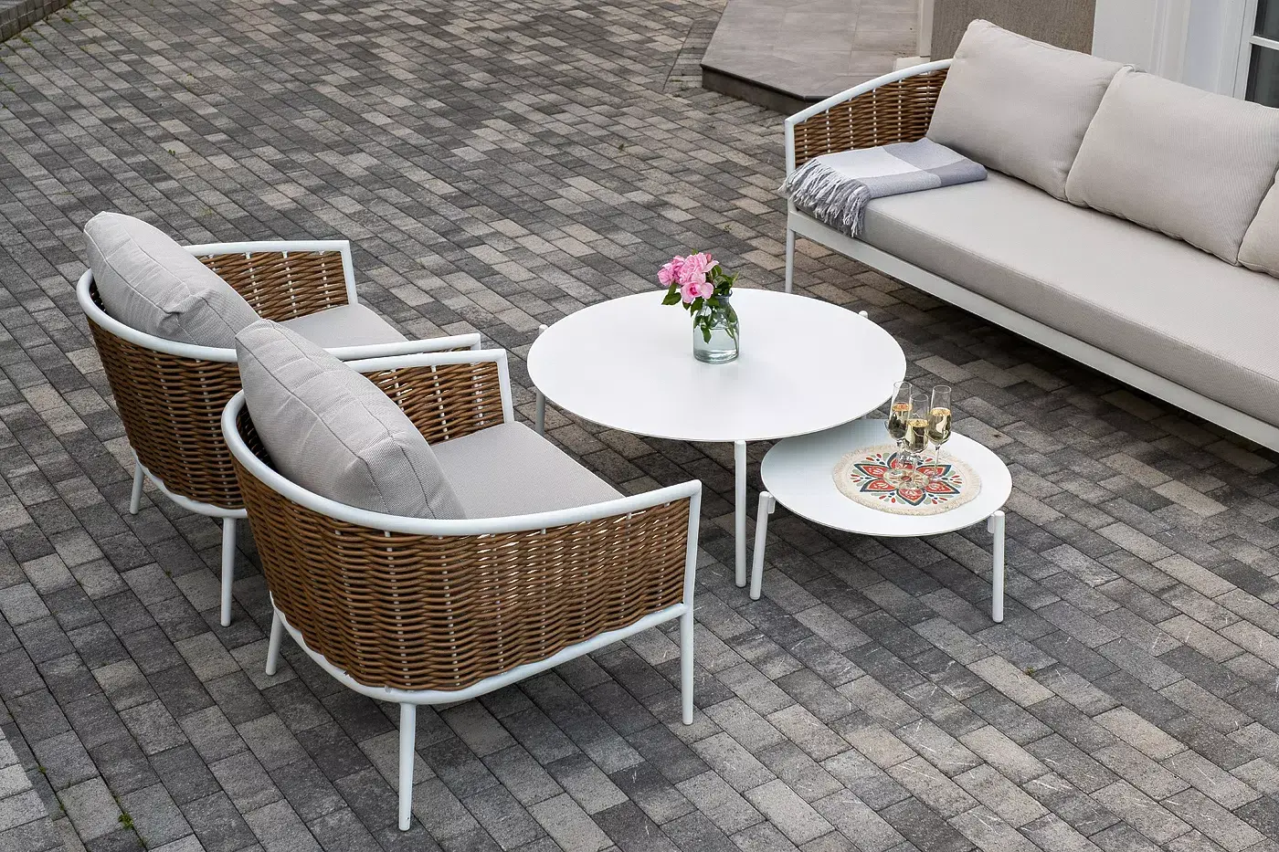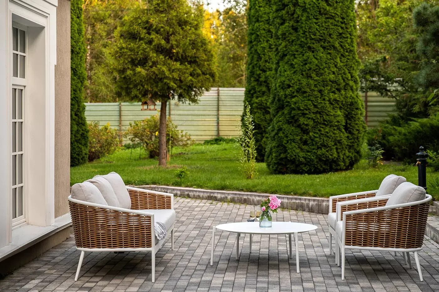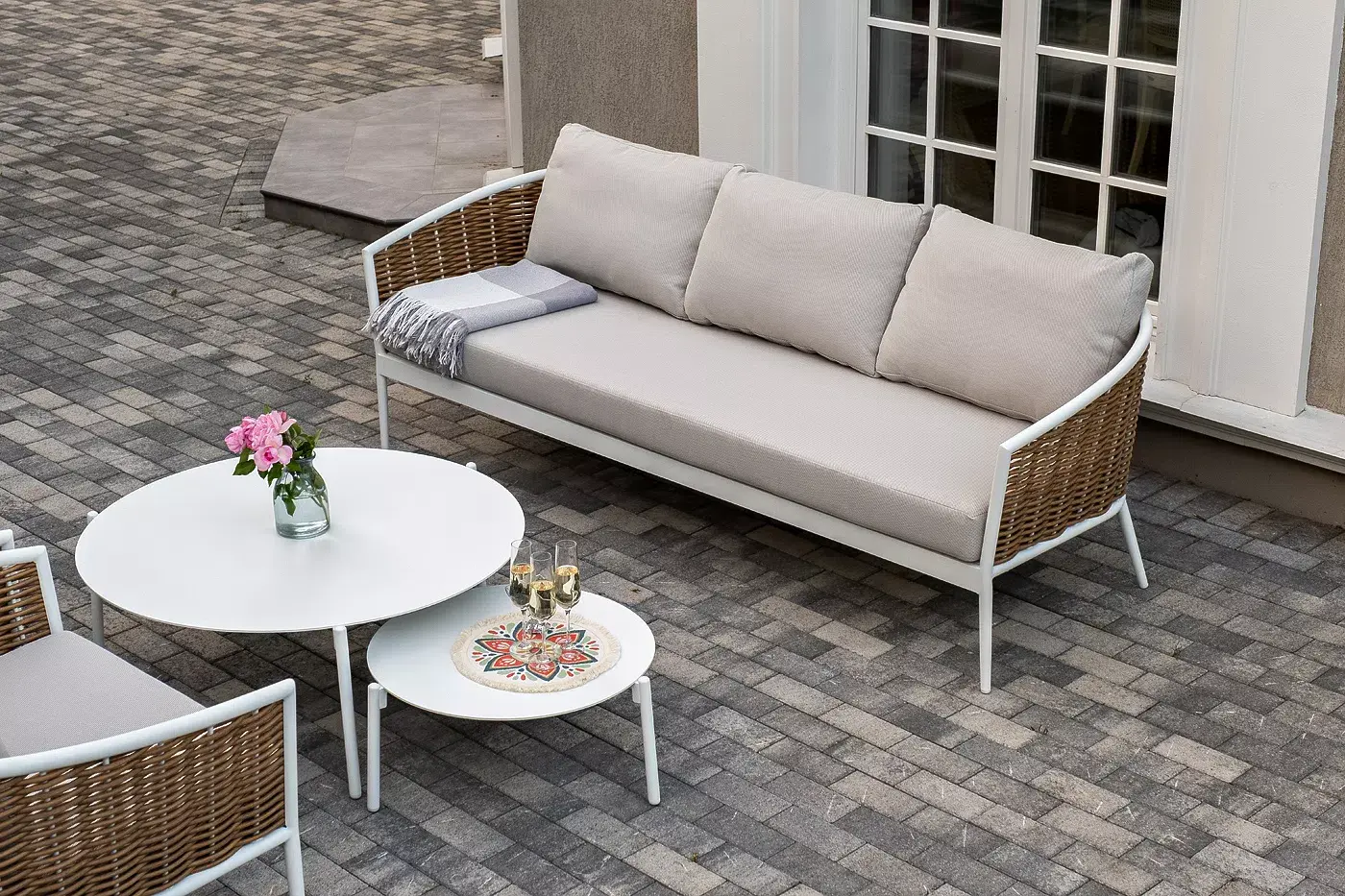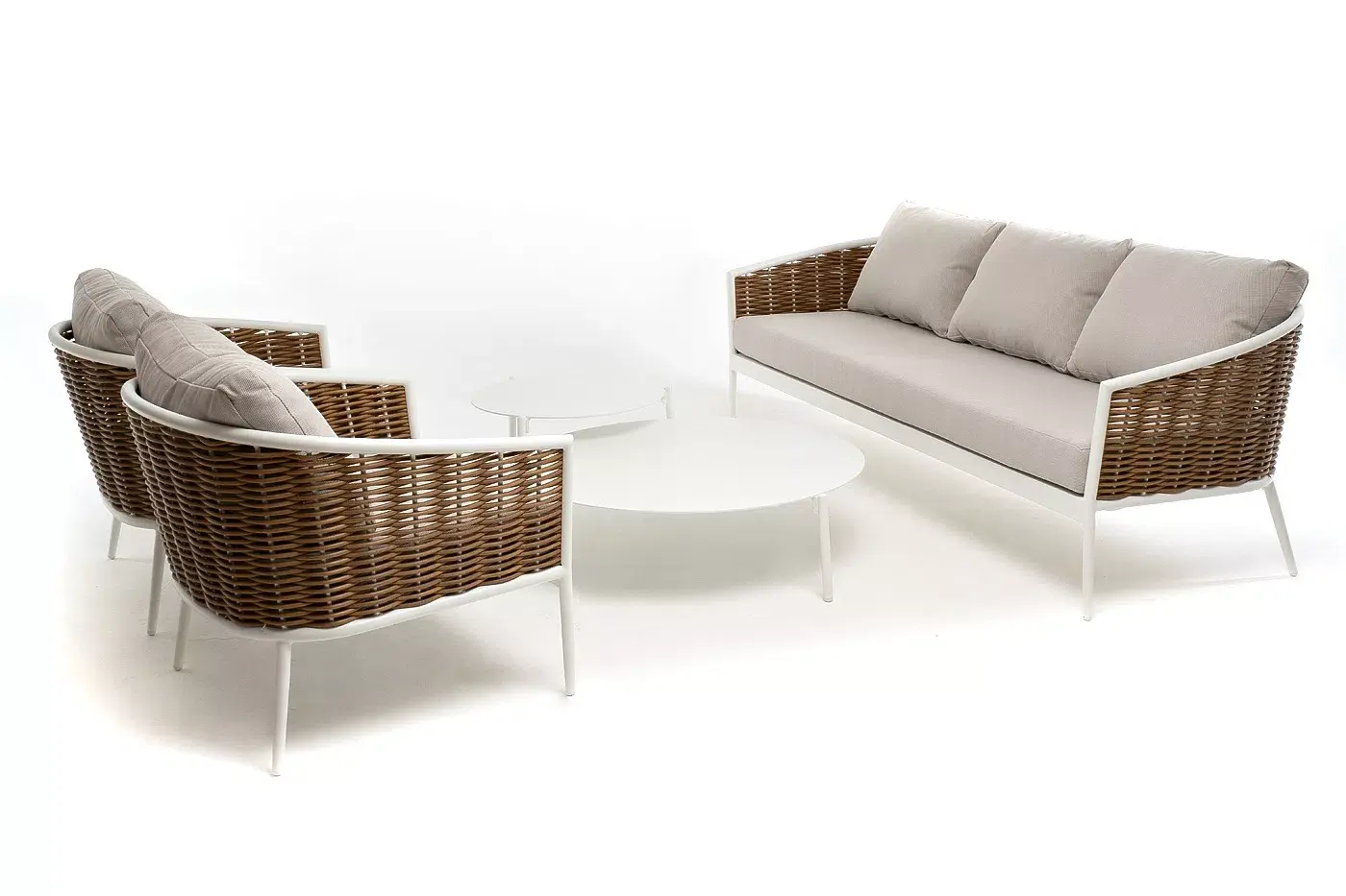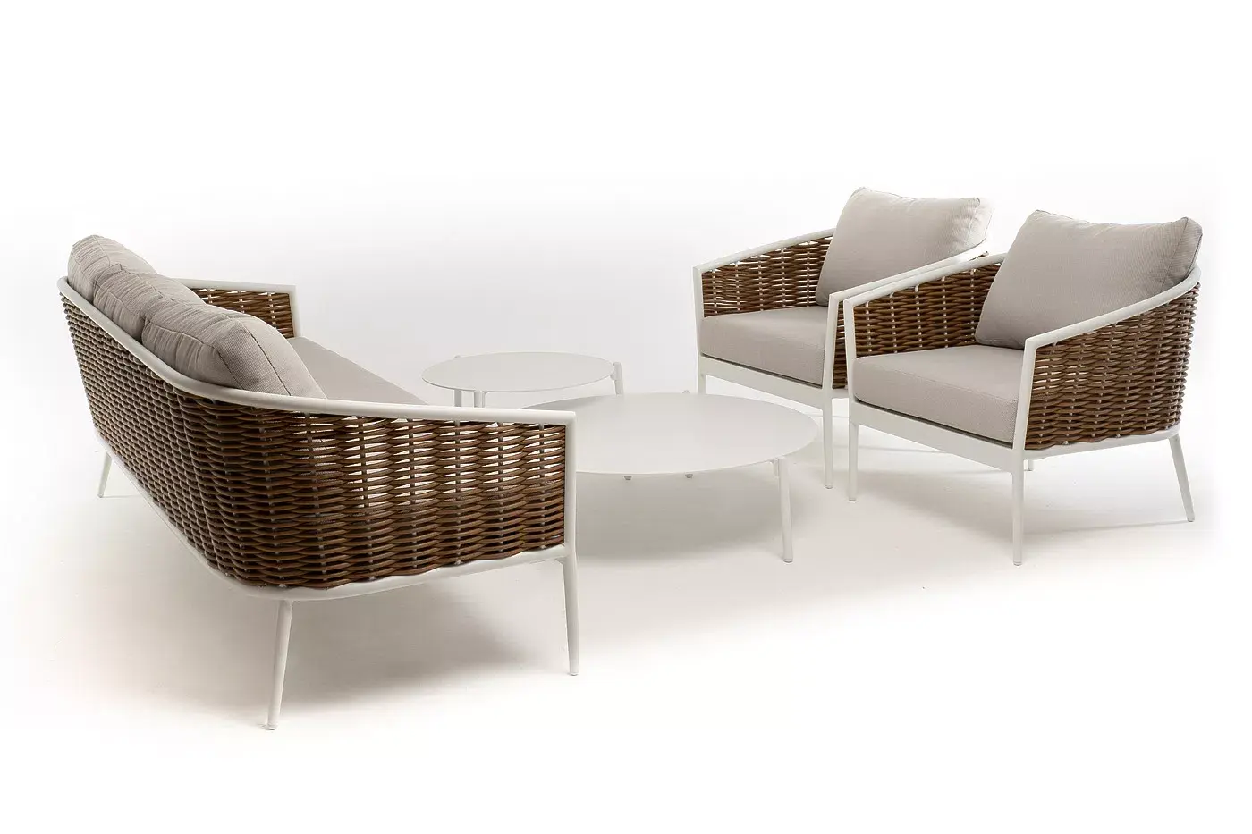 Плетеная мебель дополнена удобными подушками в бежевых чехлах. При их изготовлении используют полиэстер, плотность – 300гр/м2. Он обрабатывается влагоотталкивающей пропиткой для повышения защитных свойств материала.