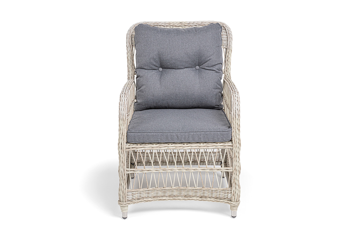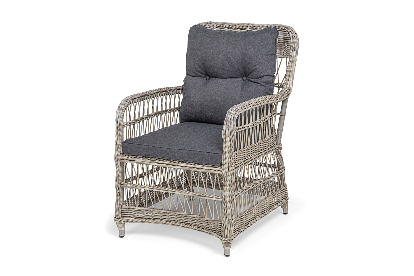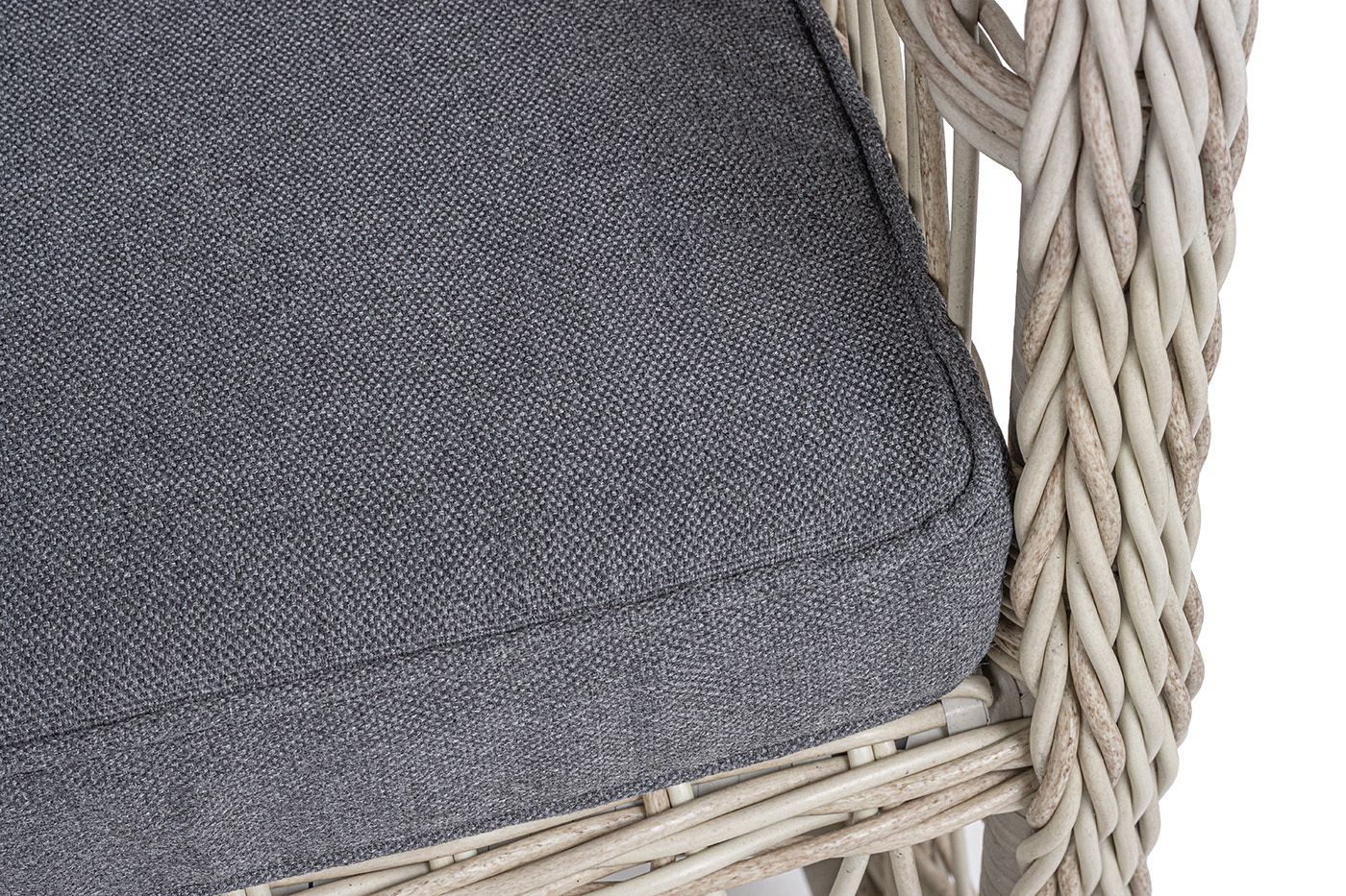 Садовое кресло располагает двумя мягкими подушками, которые идут в комплекте. Они выполнены в сером цвете. Полиэстер высокого качества используется при пошиве тканевых изделий. Его плотность 300гр/м2. Ткань обрабатывается влагоотталкивающей пропиткой.