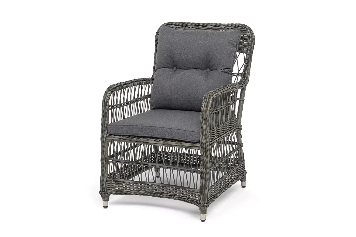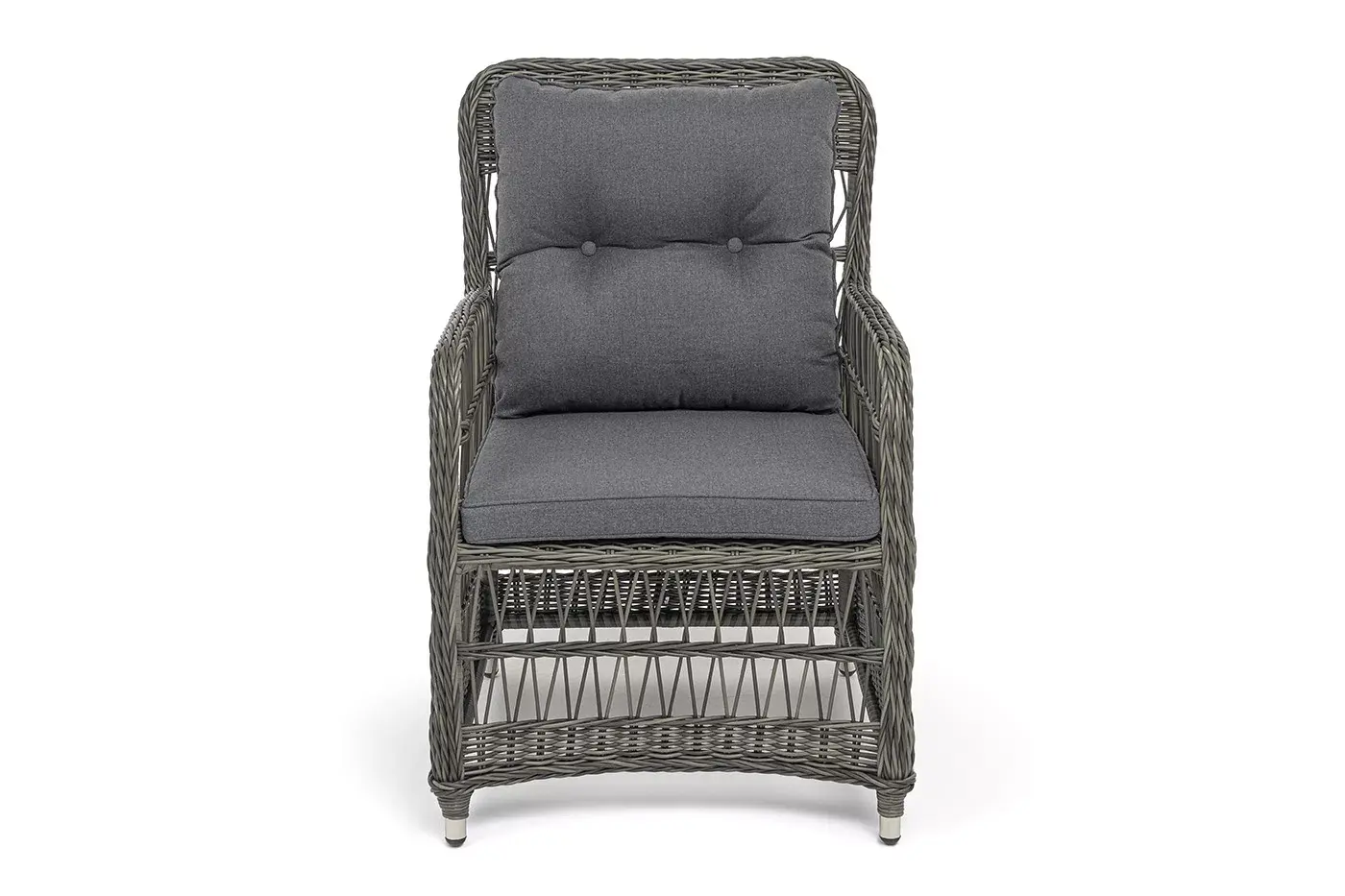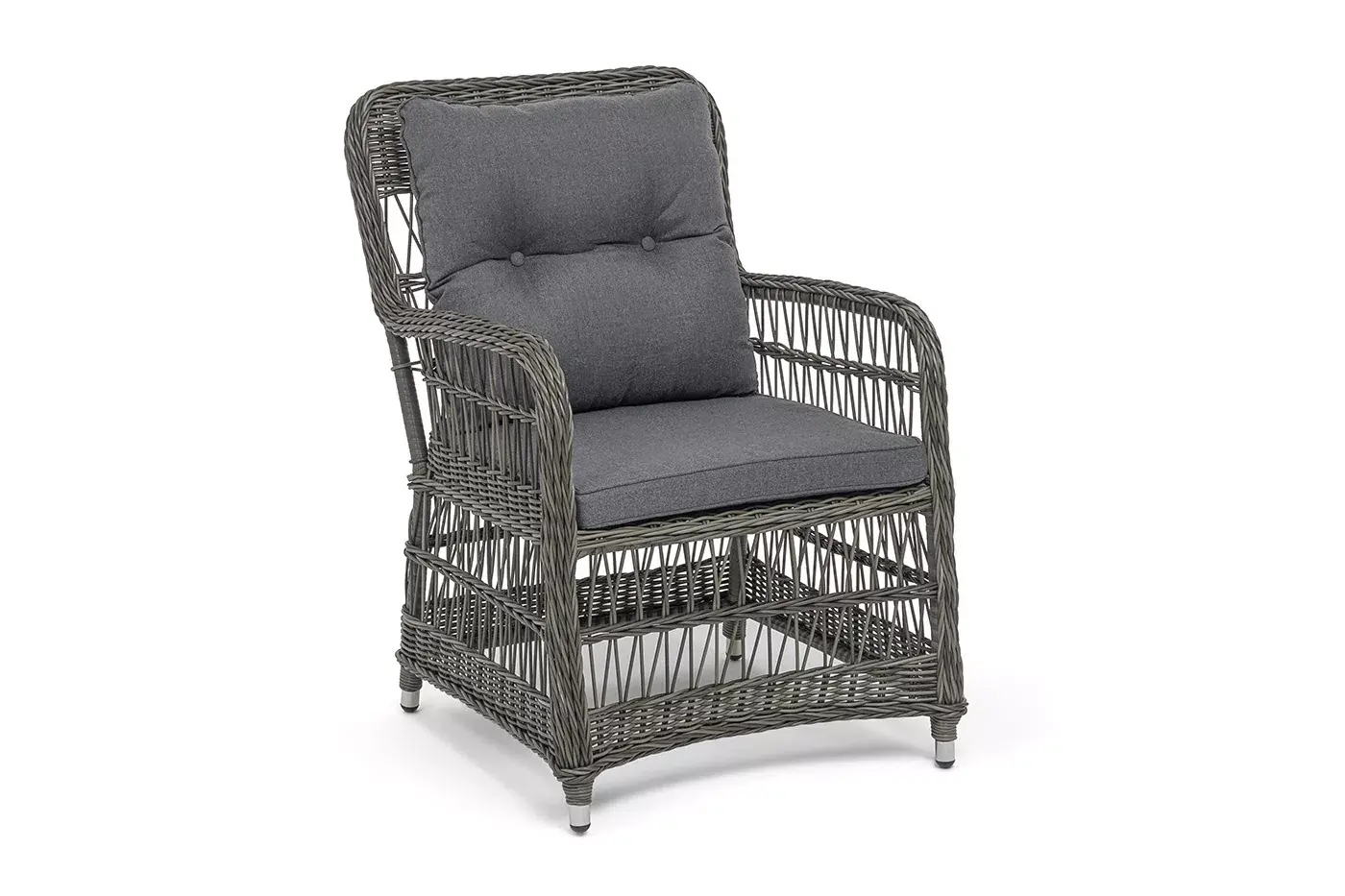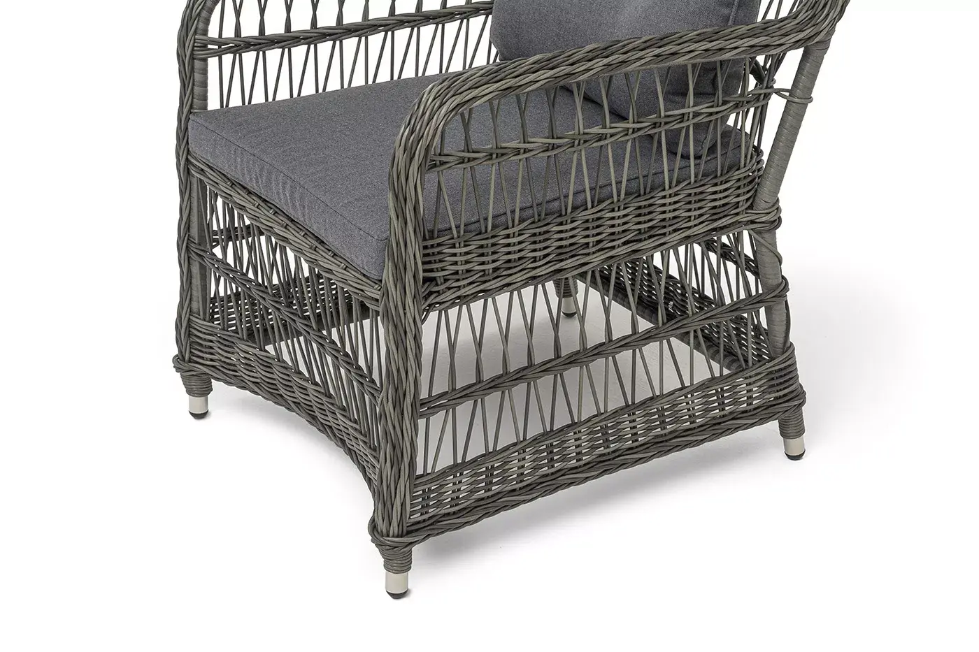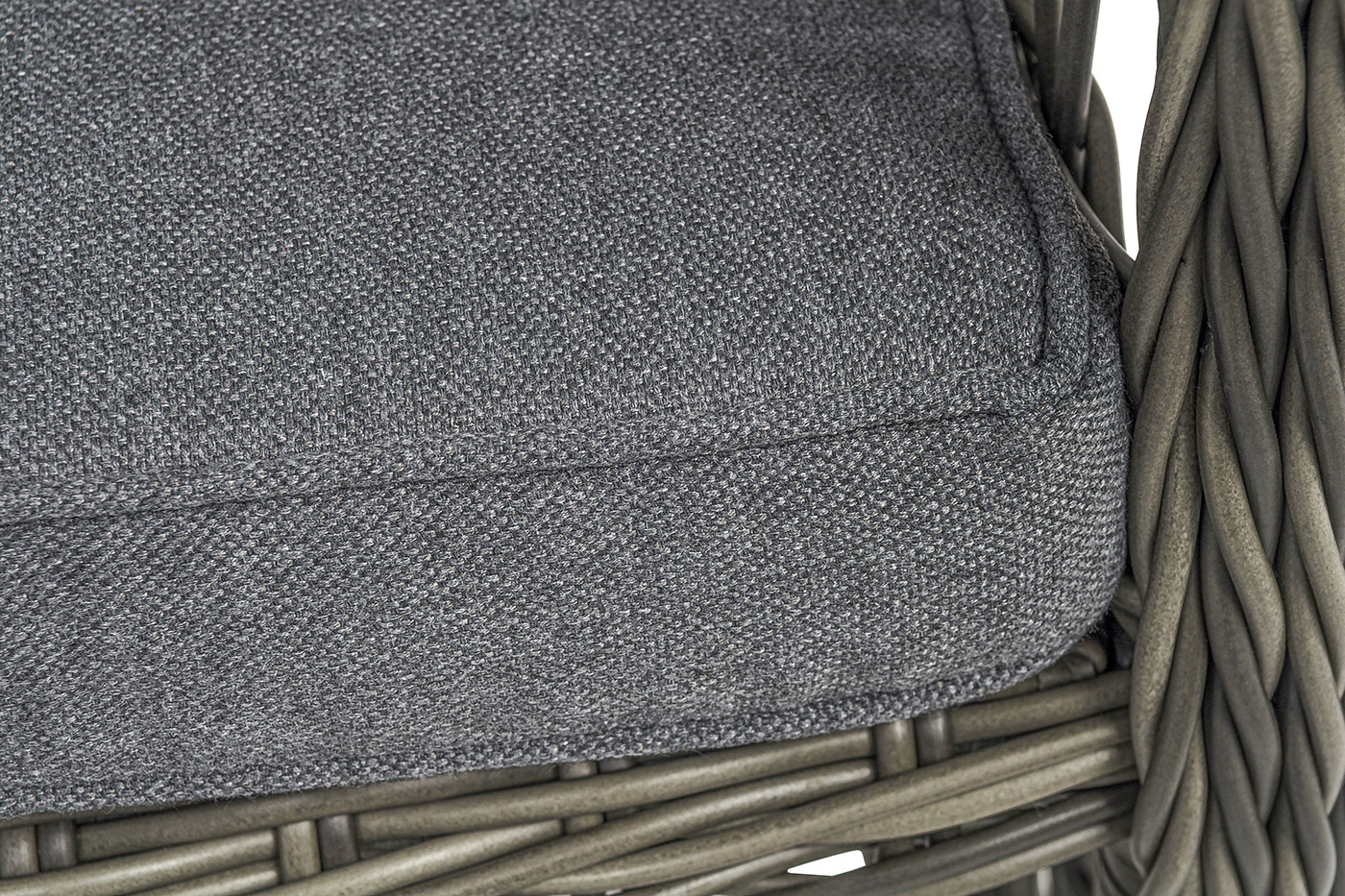 Садовое кресло располагает двумя мягкими подушками, которые идут в комплекте. Они выполнены в сером цвете. Полиэстер высокого качества используется при пошиве тканевых изделий. Его плотность 300гр/м2. Ткань обрабатывается влагоотталкивающей пропиткой.