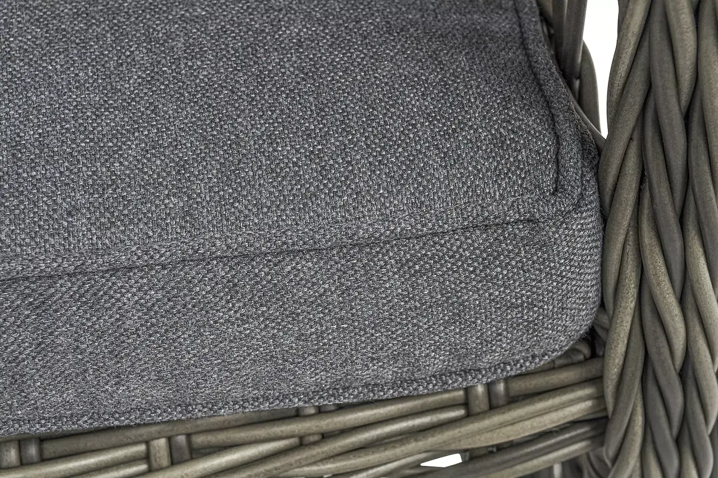 Алюминиевый каркас находится в основе мебели. Он характеризуется устойчивостью и высокой прочностью. Задекорирован ручной круглой оплеткой, которая сделана из искусственного ротанга. Представлена в графитовом оттенке.