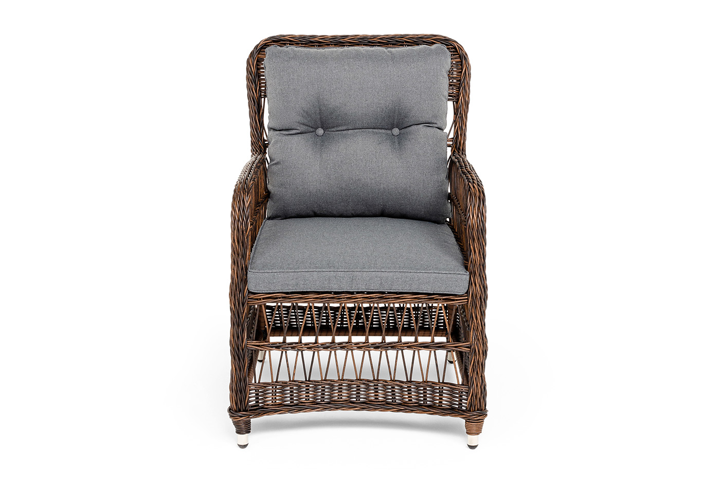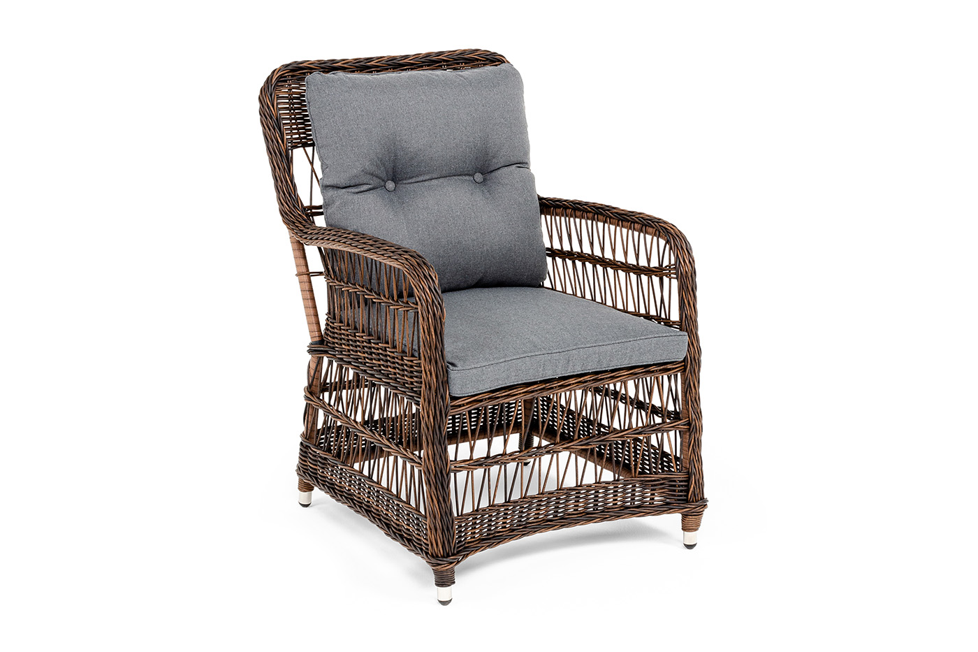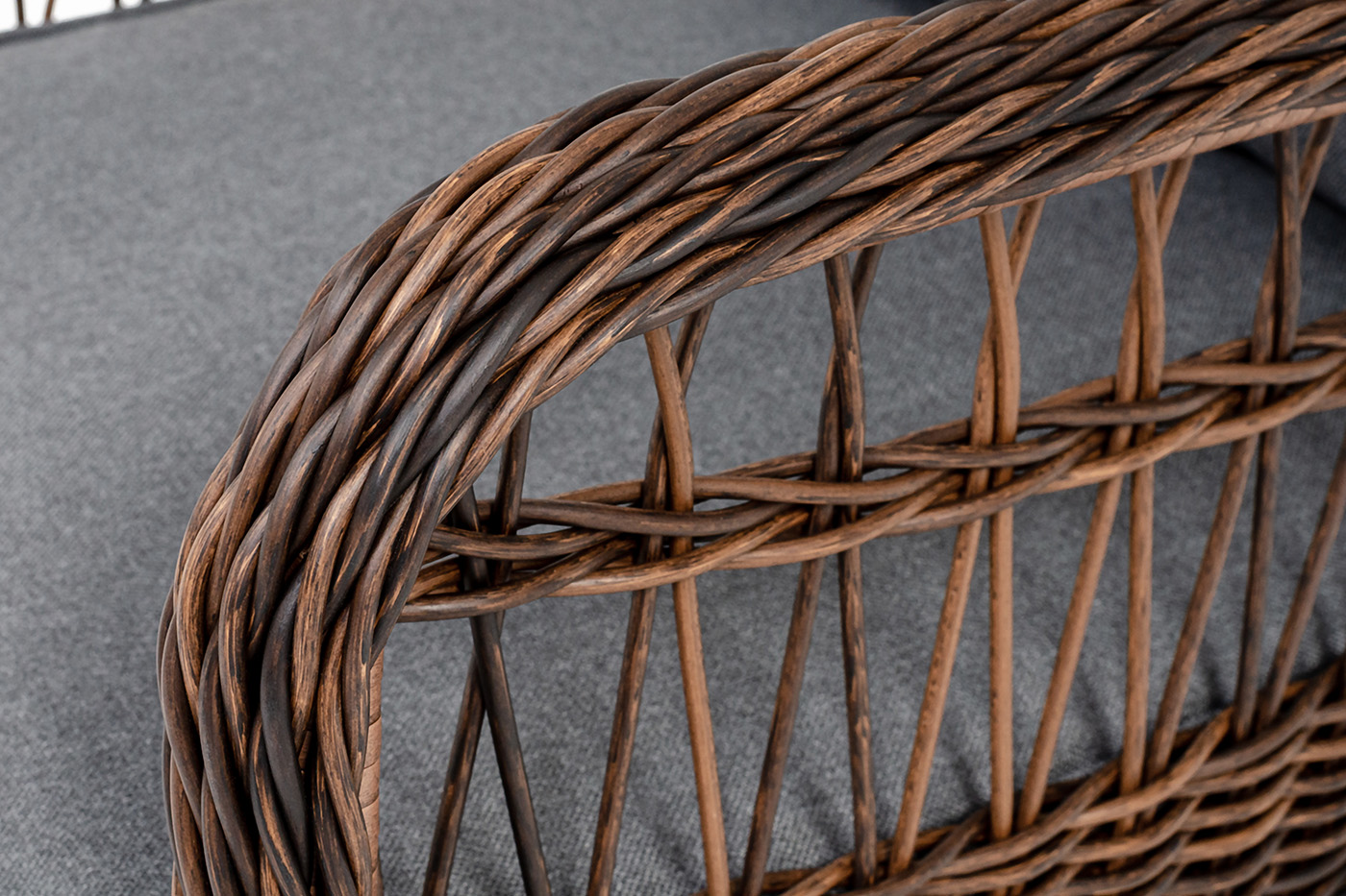 Алюминиевый каркас находится в основе мебели. Он характеризуется устойчивостью и высокой прочностью. Задекорирован ручной круглой оплеткой, которая сделана из искусственного ротанга. Представлена в коричневом оттенке.
