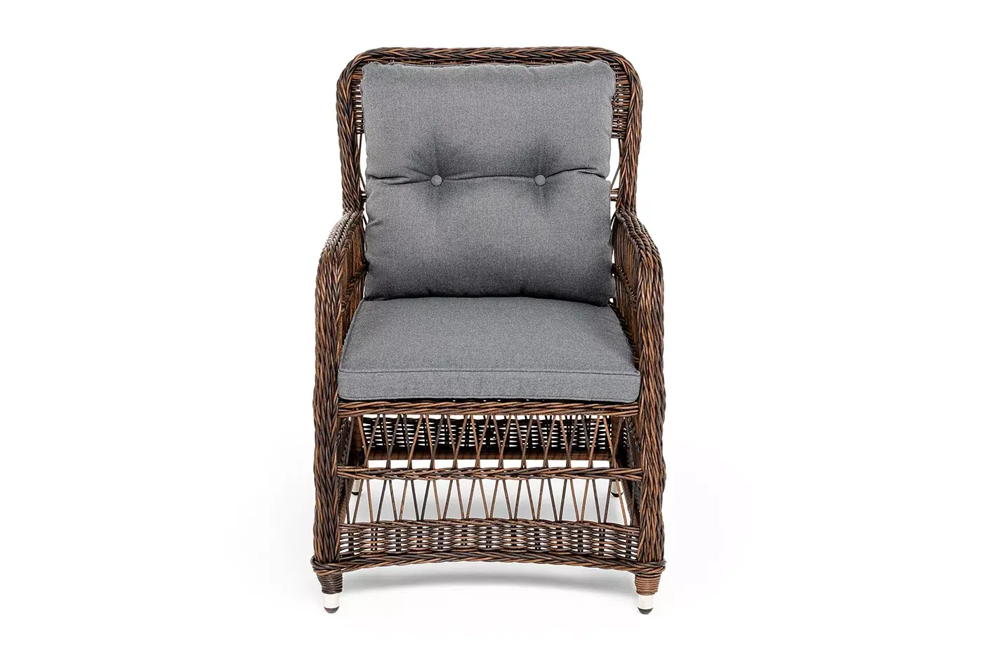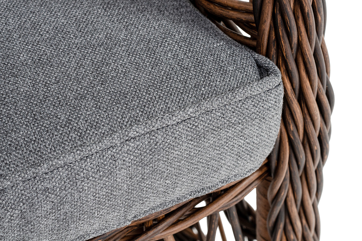Садовое кресло располагает двумя мягкими подушками, которые идут в комплекте. Они выполнены в сером цвете. Полиэстер высокого качества используется при пошиве тканевых изделий. Его плотность 300гр/м2. Ткань обрабатывается влагоотталкивающей пропиткой.