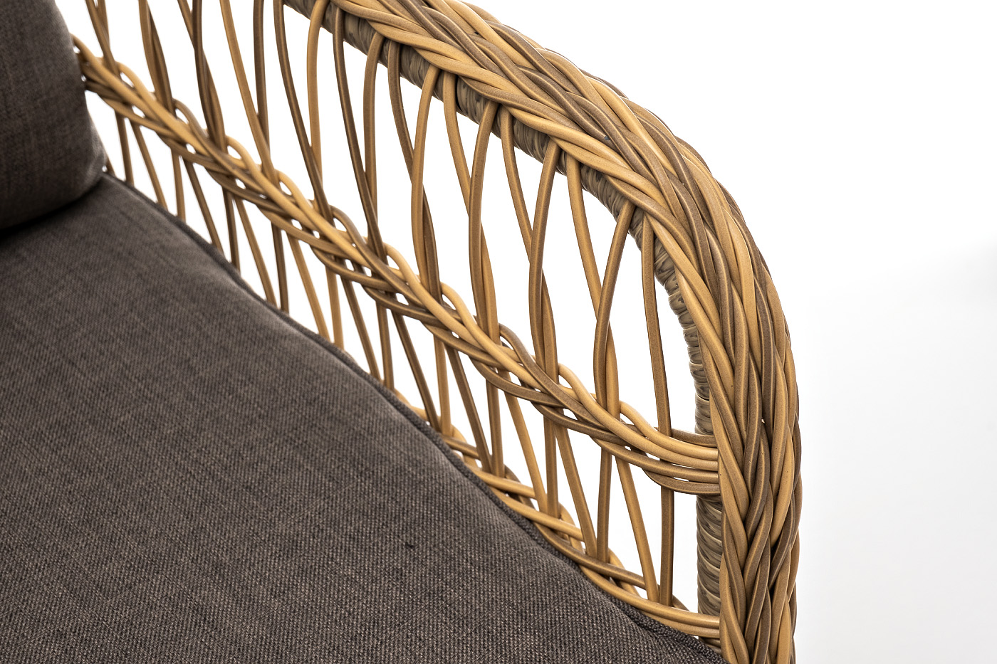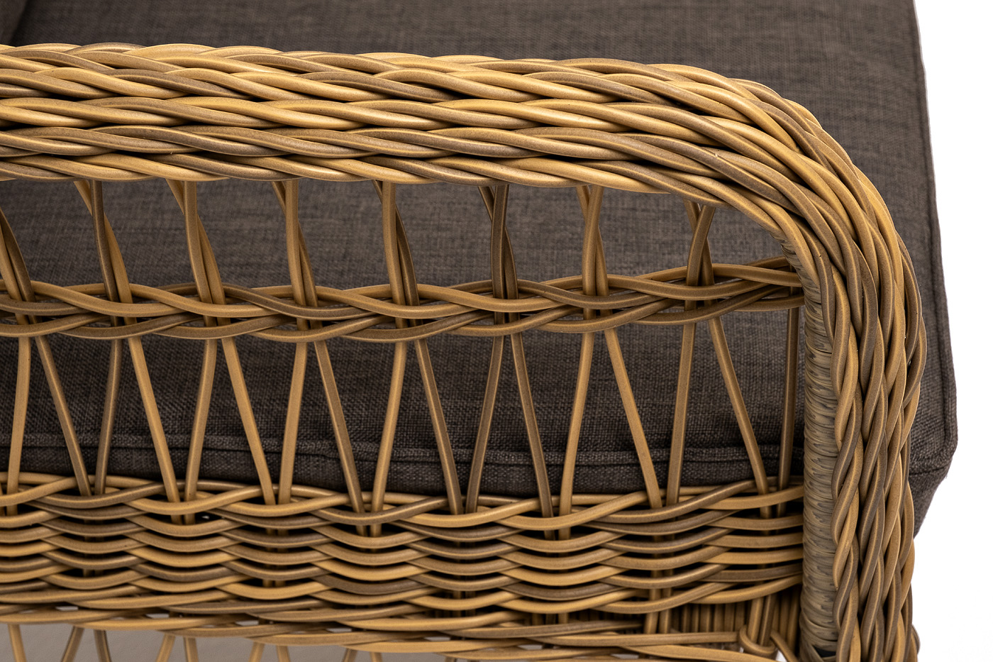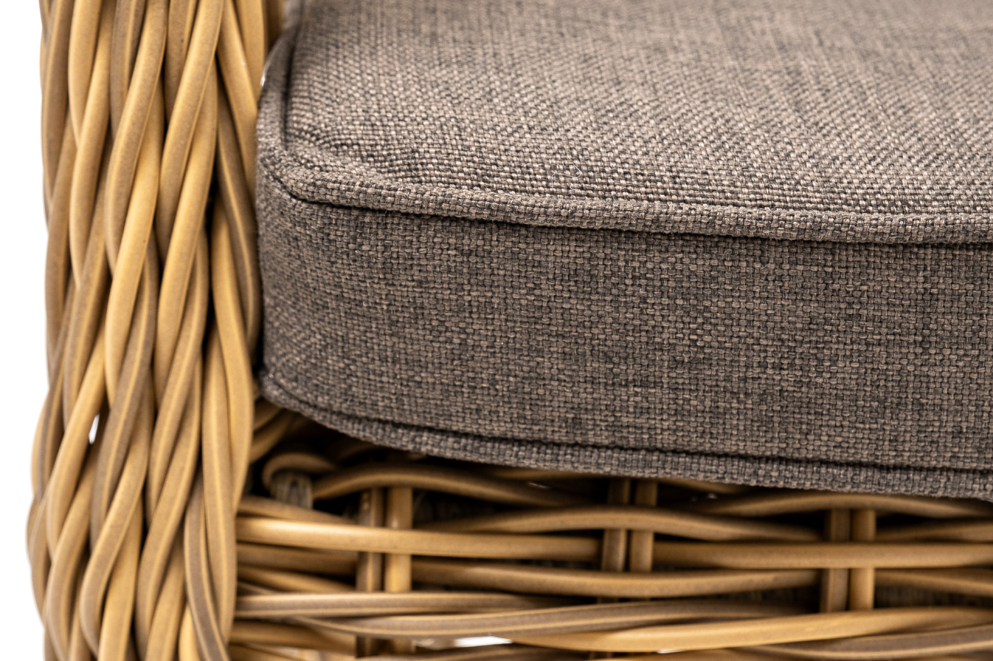 Алюминиевый каркас находится в основе мебели. Он характеризуется устойчивостью и высокой прочностью. Задекорирован ручной круглой оплеткой, которая сделана из искусственного ротанга. Представлена в соломенном оттенке.