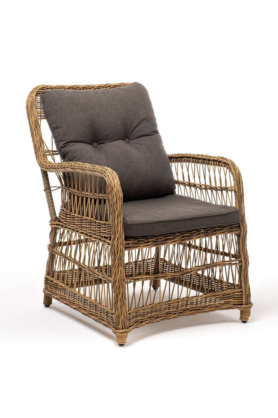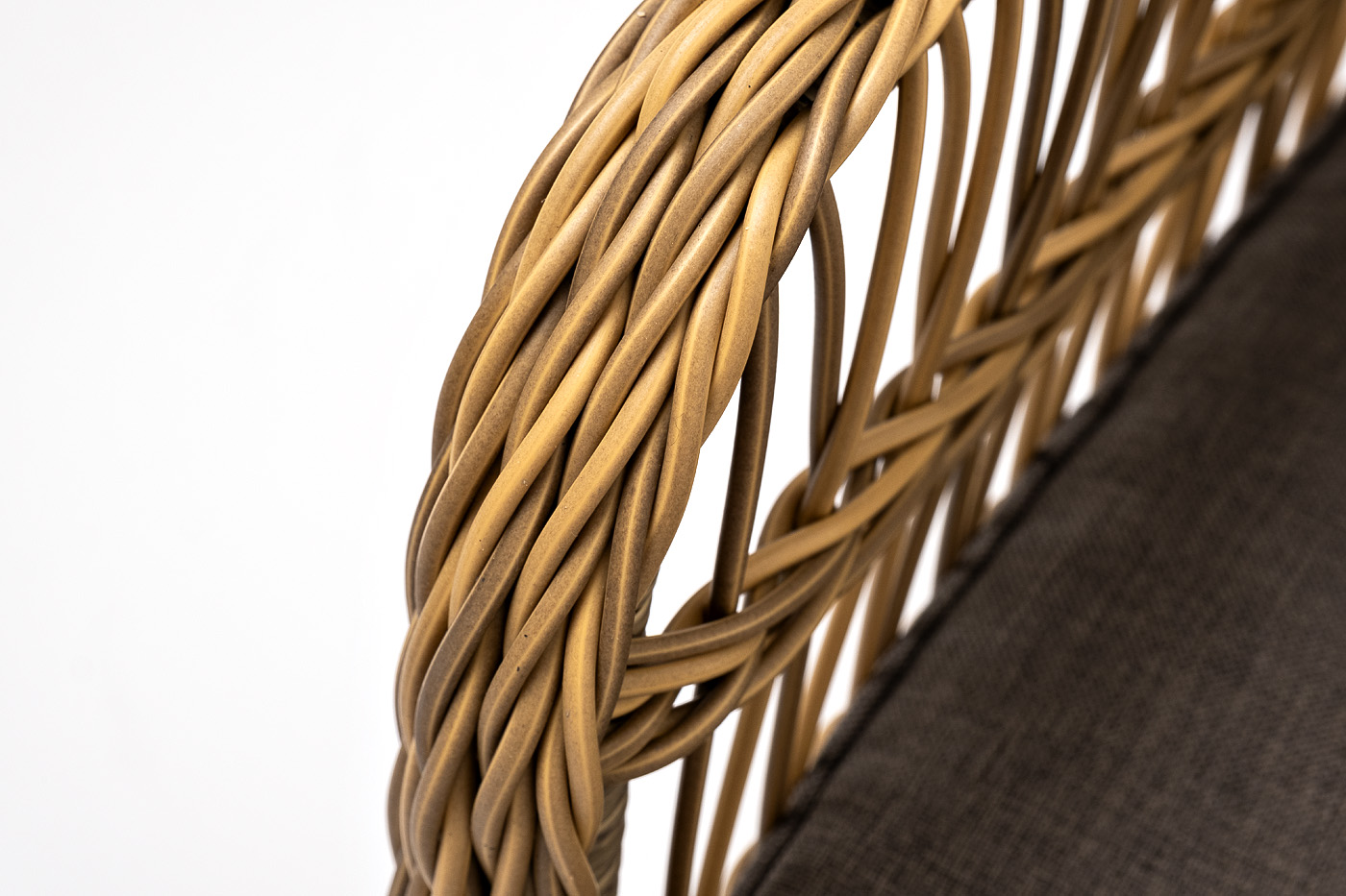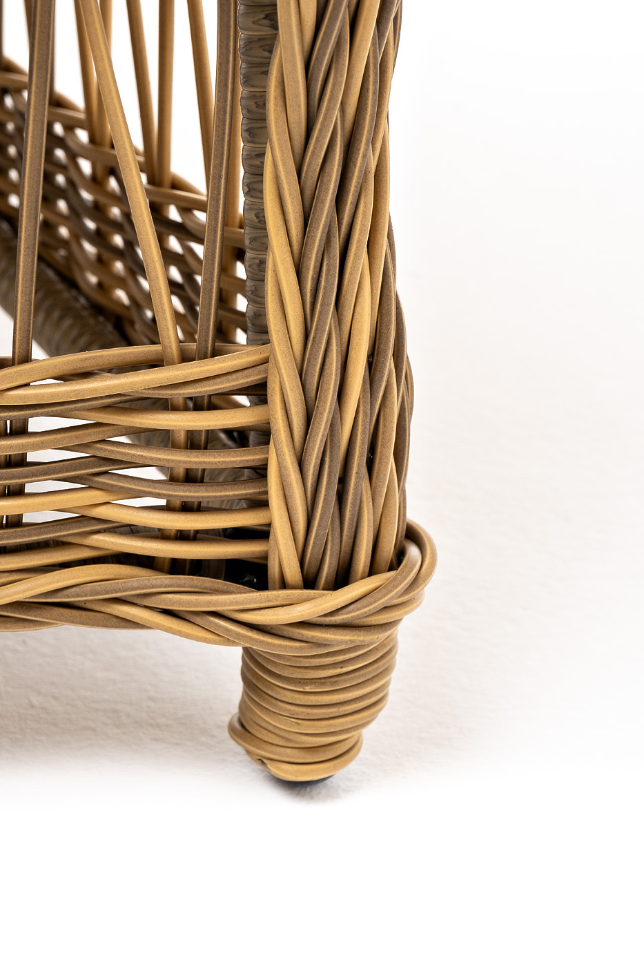Алюминиевый каркас находится в основе мебели. Он характеризуется устойчивостью и высокой прочностью. Задекорирован ручной круглой оплеткой, которая сделана из искусственного ротанга. Представлена в соломенном оттенке.