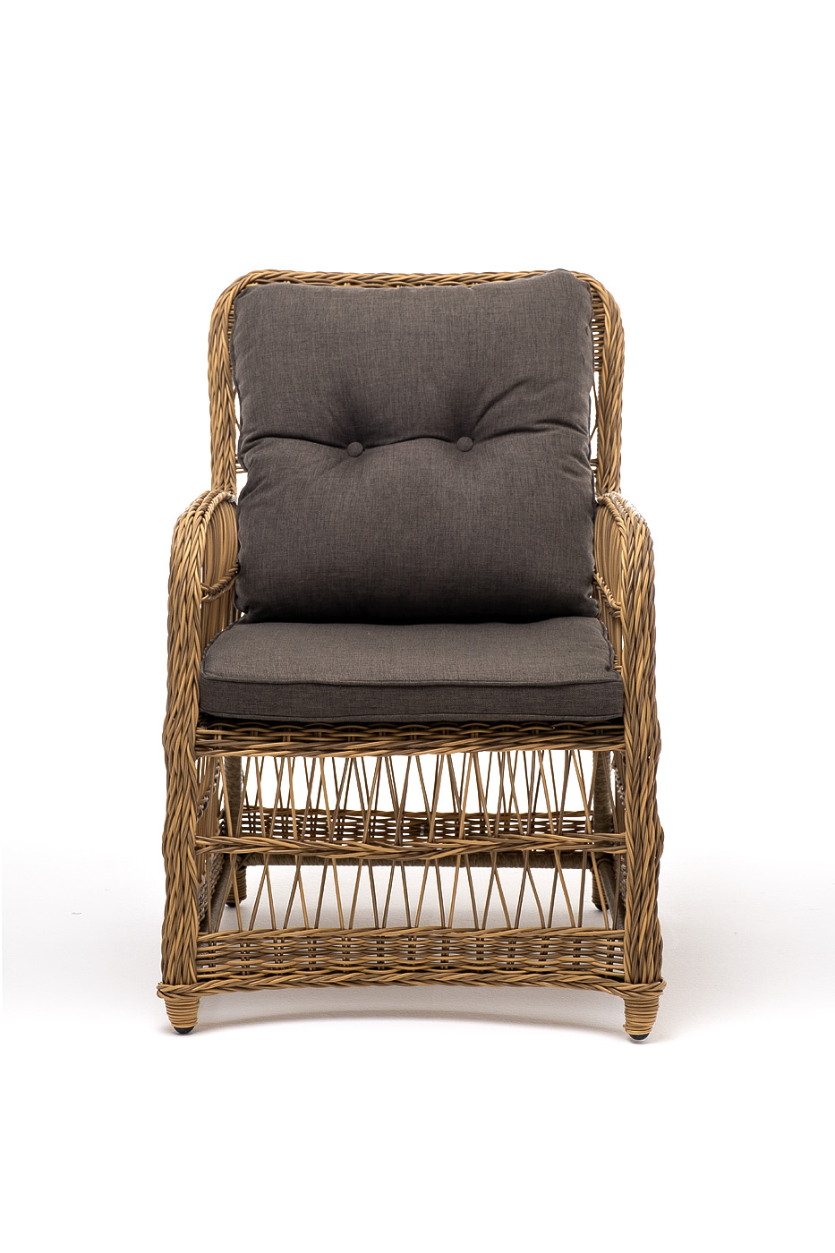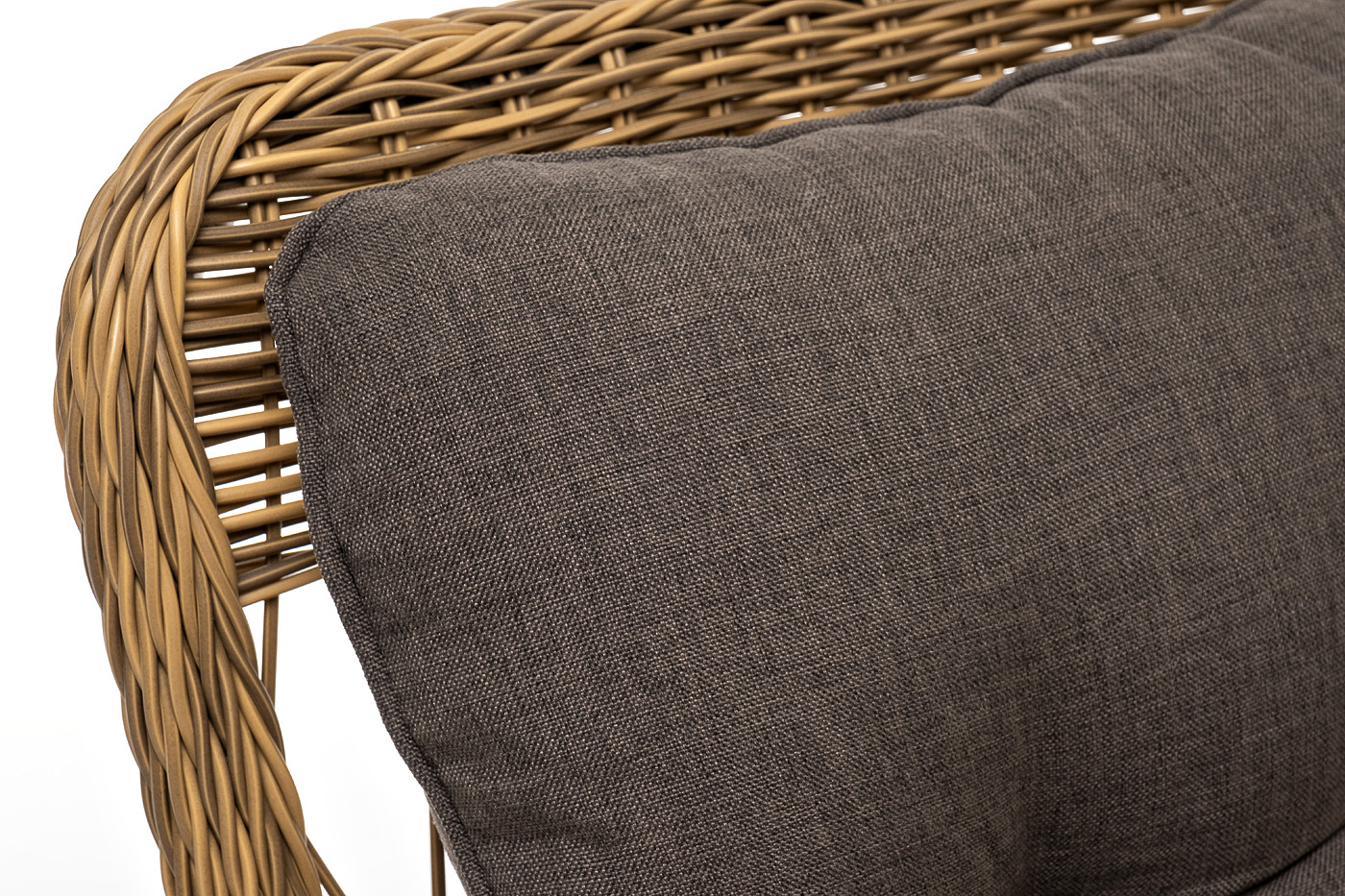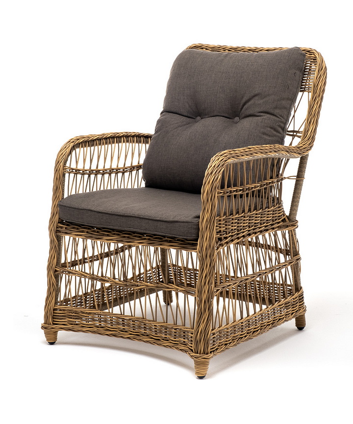 Садовое кресло располагает двумя мягкими подушками, которые идут в комплекте. Они выполнены в сером цвете. Полиэстер высокого качества используется при пошиве тканевых изделий. Его плотность 300гр/м2. Ткань обрабатывается влагоотталкивающей пропиткой.