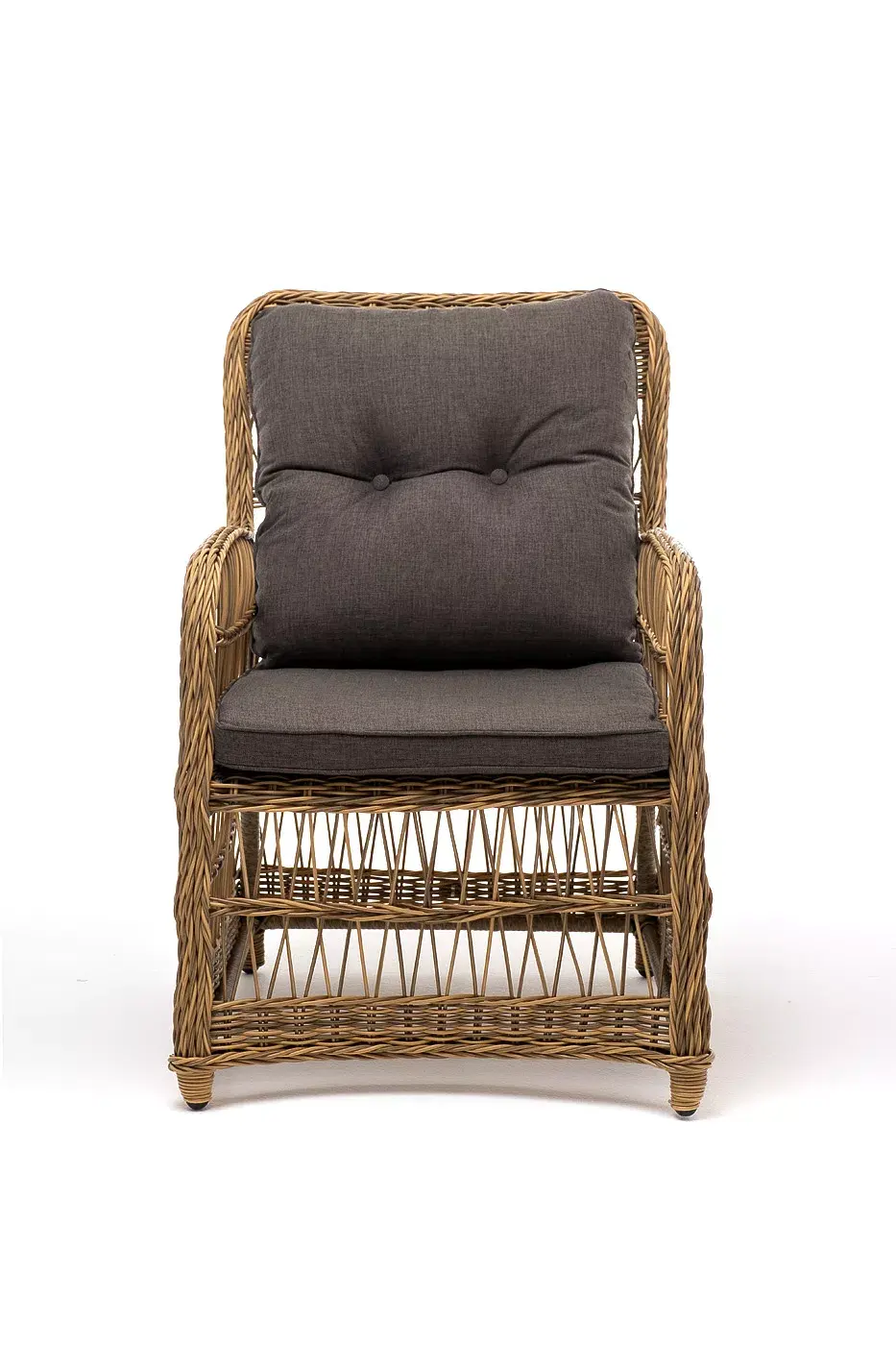 Садовое кресло располагает двумя мягкими подушками, которые идут в комплекте. Они выполнены в серо-коричневом цвете. Полиэстер высокого качества используется при пошиве тканевых изделий. Его плотность 230гр/м2. Ткань обрабатывается влагоотталкивающей пропиткой.
