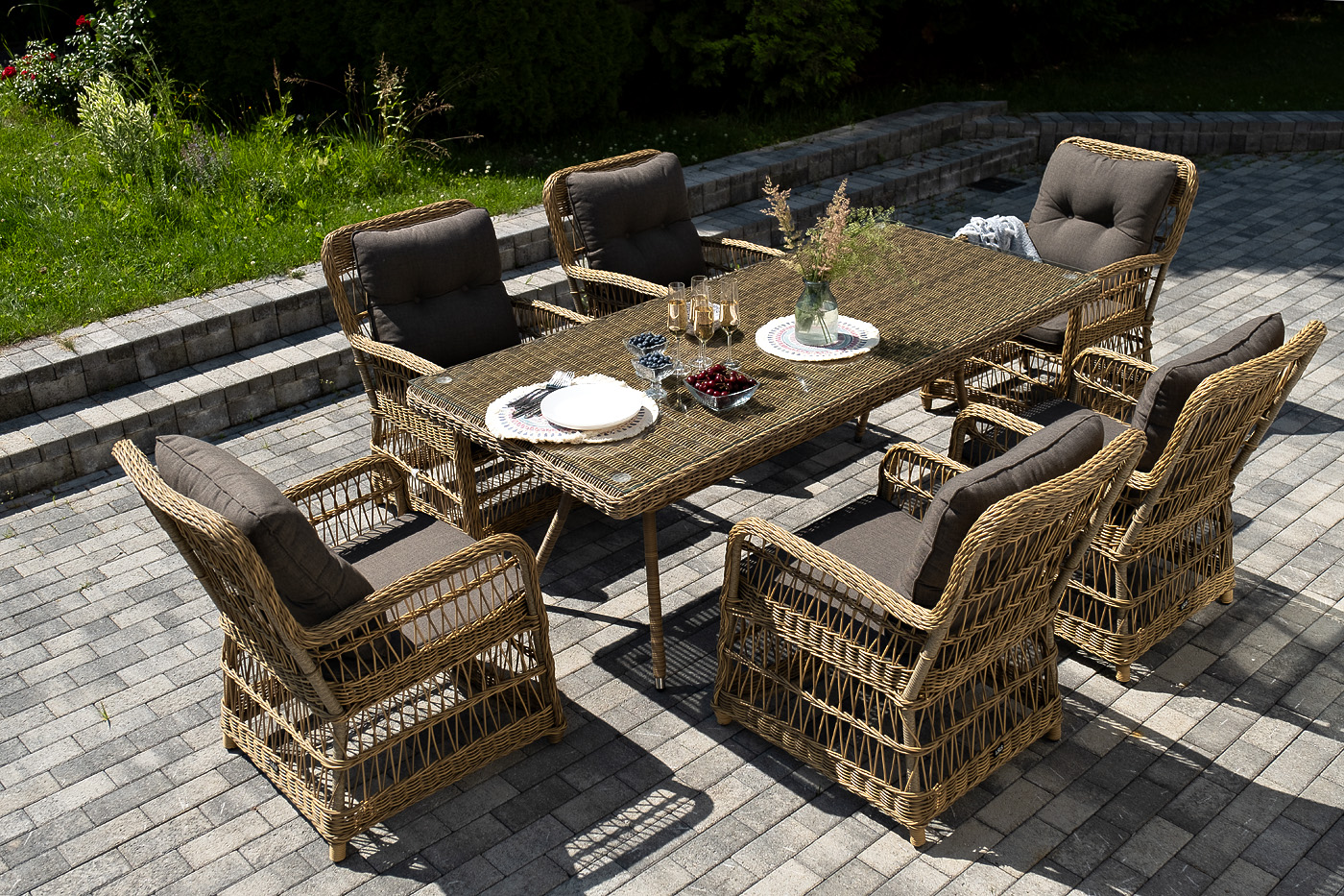 Садовая обеденная группа на 6 персон «Цесена» из ротанга. В комплекте: большой прямоугольный обеденный стол (1600×900×750 мм) и 6 кресел (600×800×910 мм).
