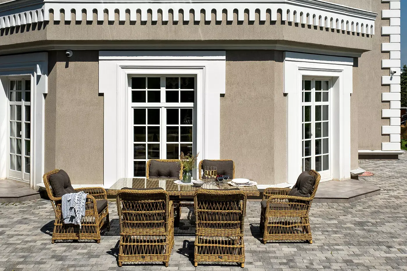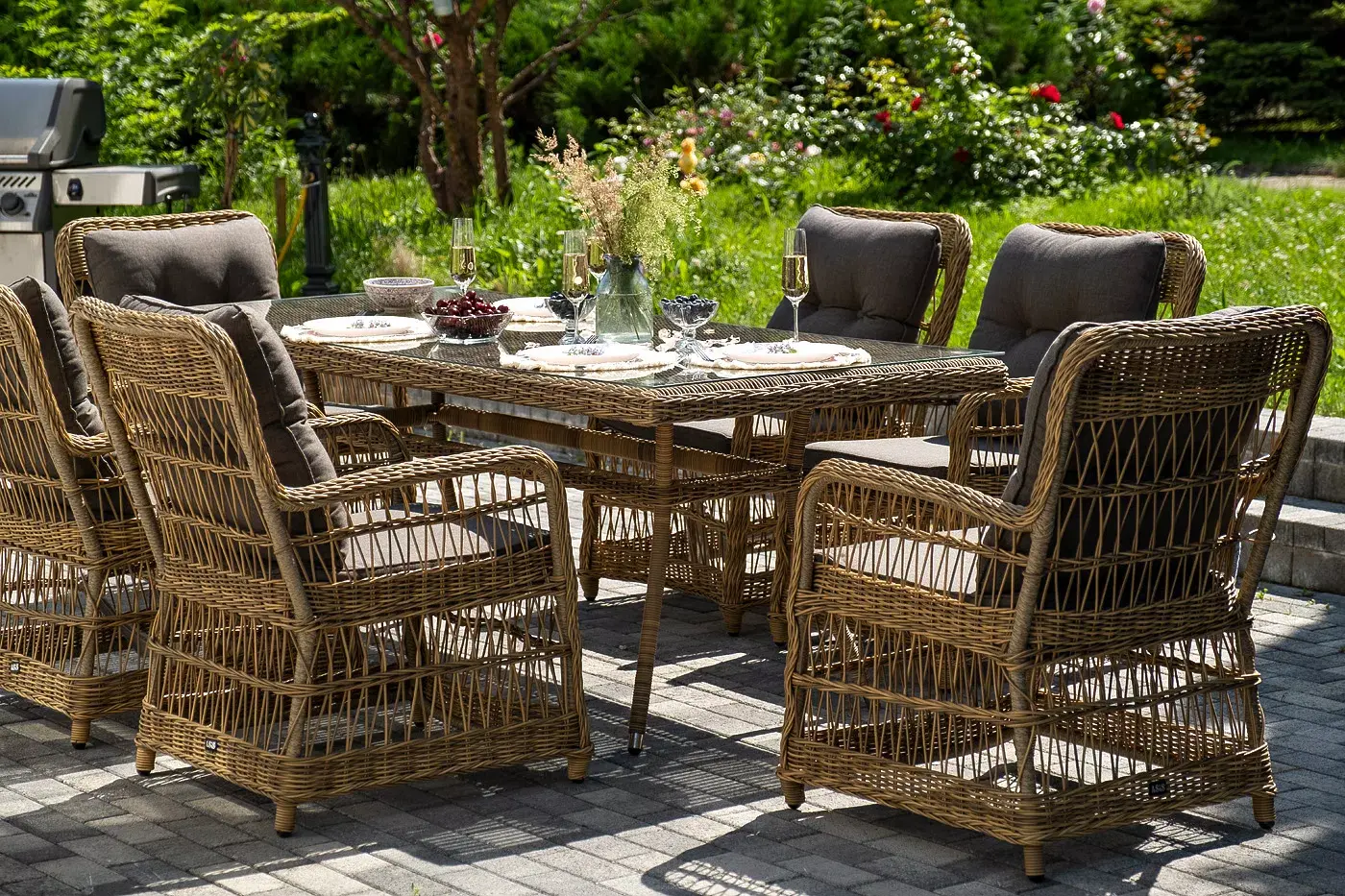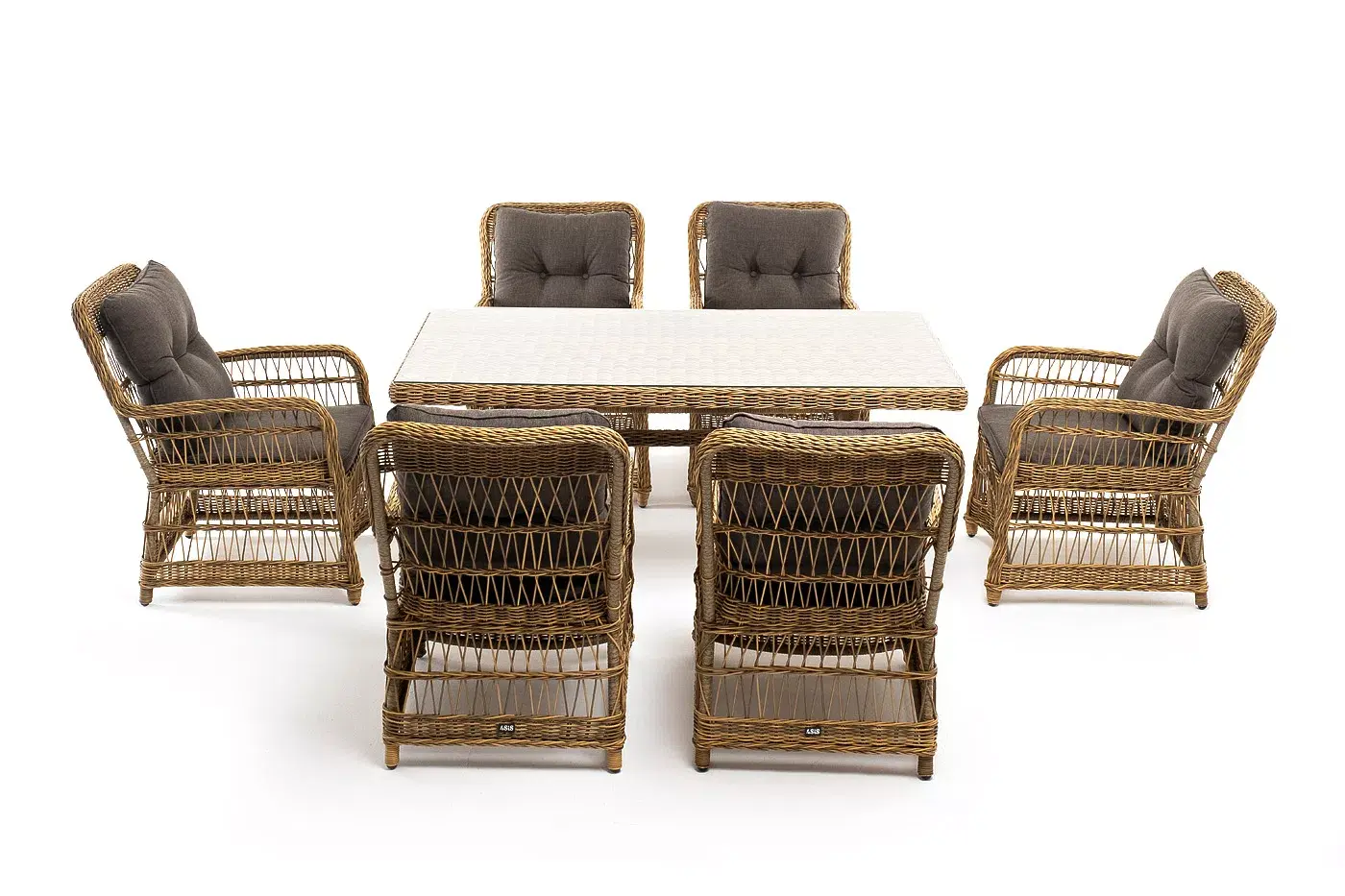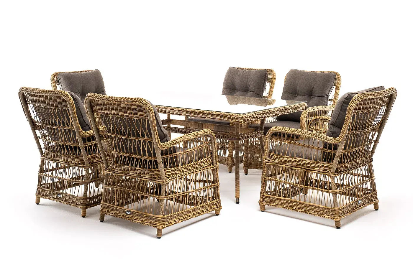 Садовая обеденная группа на 6 персон «Цесена» из ротанга. В комплекте: большой прямоугольный обеденный стол (1600×900×750 мм) и 6 кресел (600×800×910 мм).