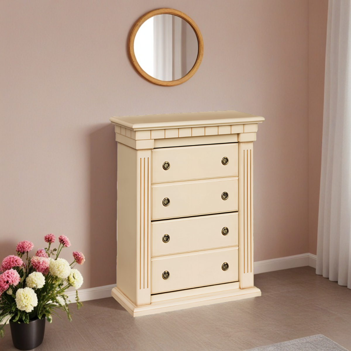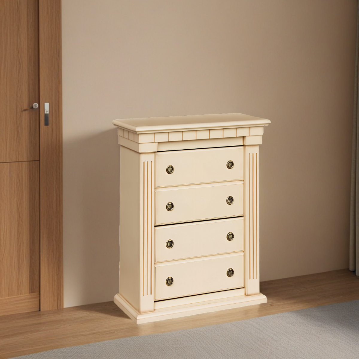 Материалы изготовления и размеры изделияКапитель выполнена из МДФ. Фурнитура из латуни испанского производства. Накладки с имитацией каннелюров выполнены из массива бука и преставляют собой колонны. Каркас выполнен из МДФ. Основание изготовлено из МДФ.