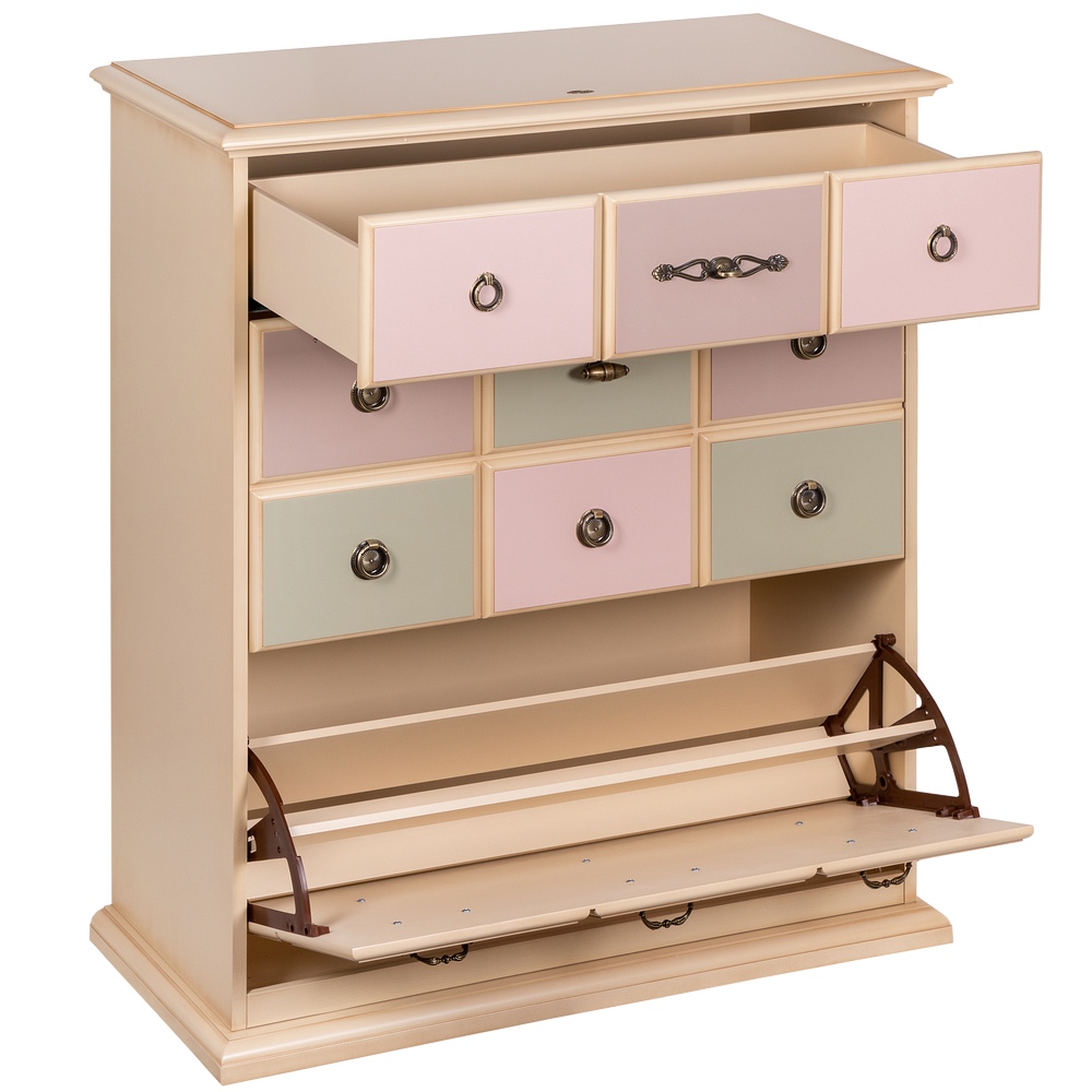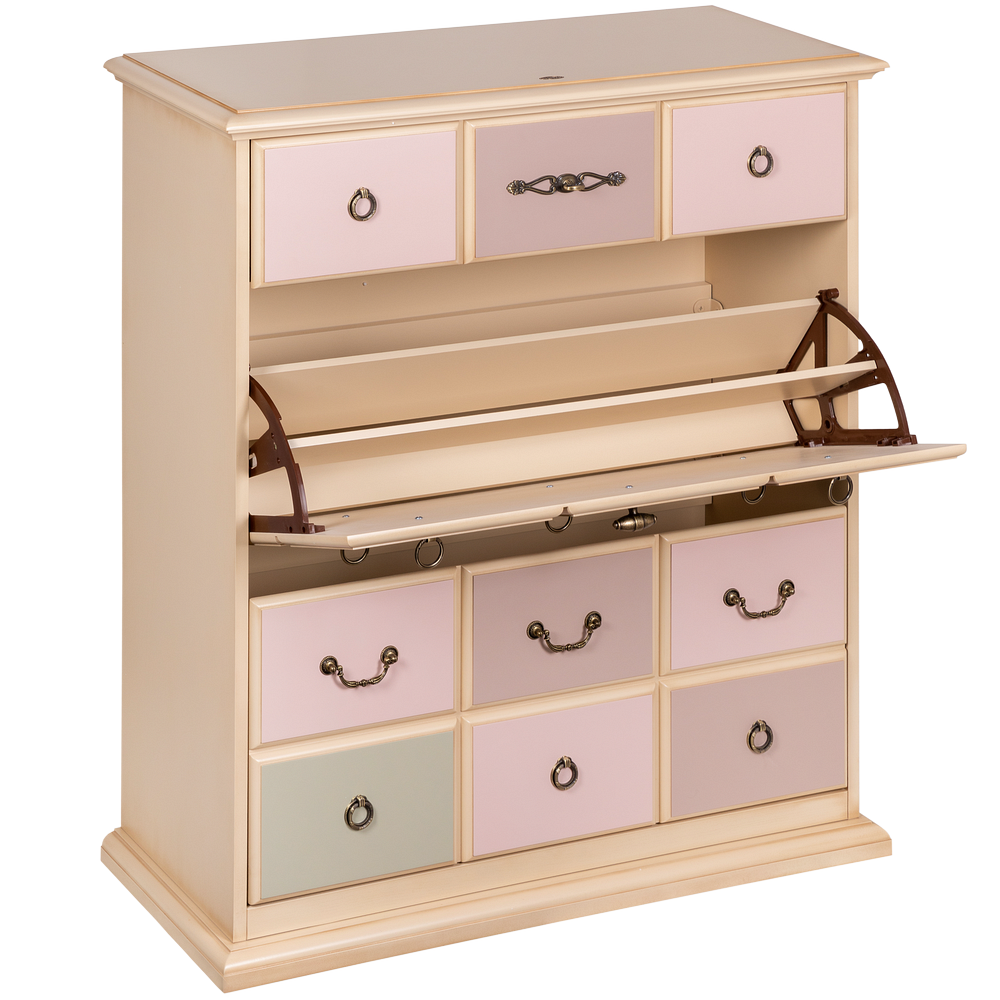 Подставка для обуви, с двумя откидными панелями, на 10-12 пар обуви и с верхним выдвижным ящиком. Изделие отличается прочной устойчивой конструкцией и прослужит не один год!