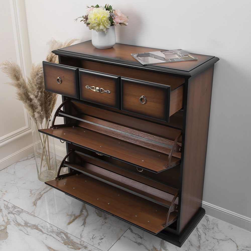 Подставка для обуви, с двумя откидными панелями, на 10-12 пар обуви и с верхним выдвижным ящиком. Изделие отличается прочной устойчивой конструкцией и прослужит не один год! Материалы изготовления и размеры изделияКаркас тумбы и ящики выполнены из высококачественной МДФ. Поверхность тонирована, патинирована и покрыта лаком. Ящики выполнены из мдф. Фурнитура из латуни испанского производства.