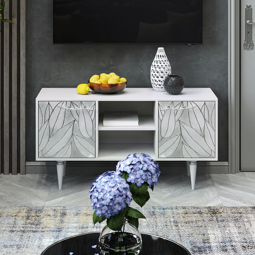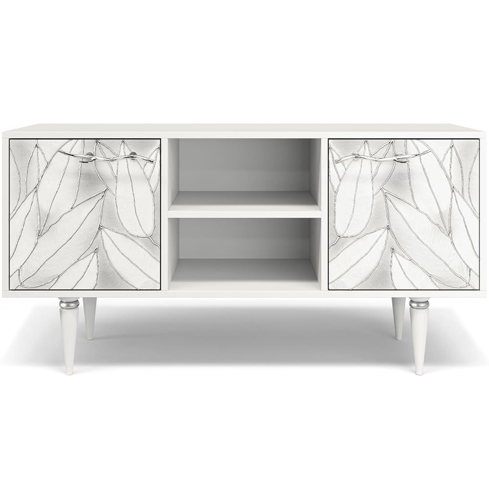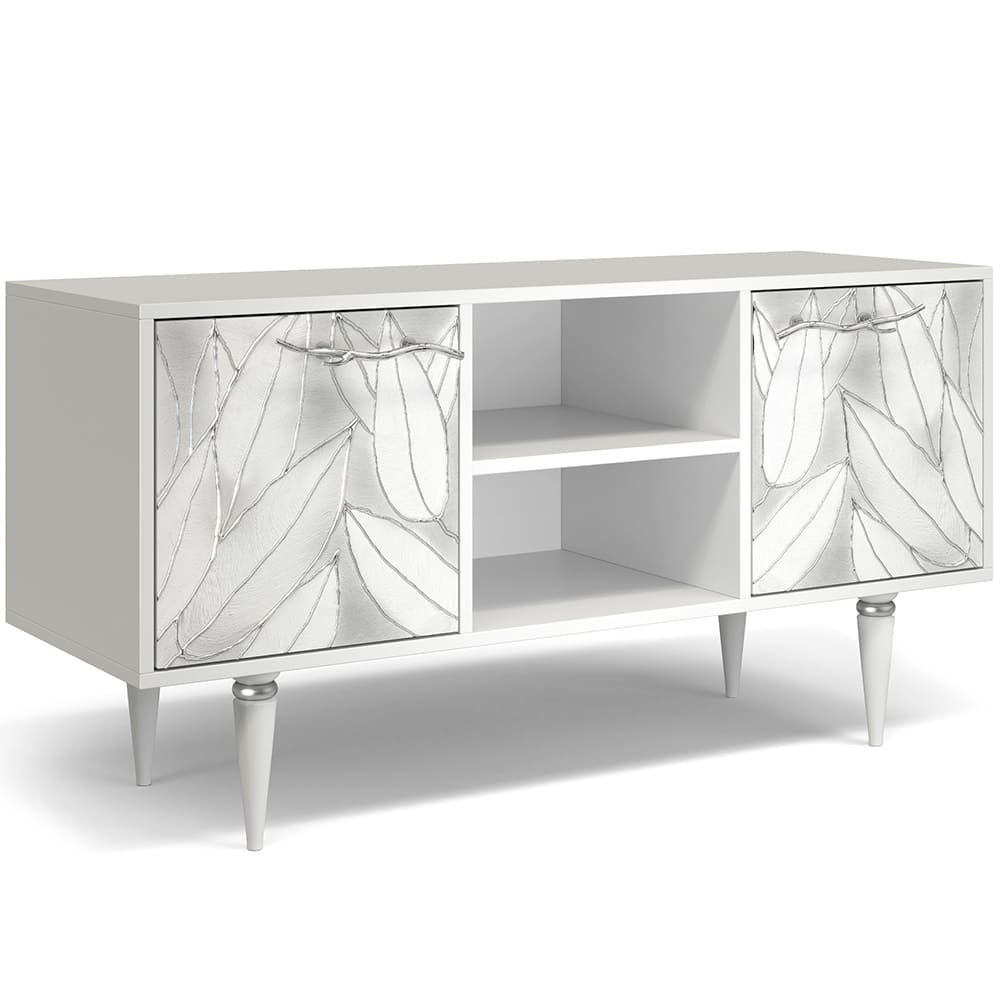 ТВ-тумба – тот предмет интерьера, в котором крайне важны не только эргономичность, но и декоративная функция. Ведь подставка под телевизор, как правило, размещается в основной части комнаты, где чаще всего собирается вся семья и гости. Дизайн тумбочки под тв Арт можно отнести к направлению сканди. Это современный стиль, который удачно подходит практически под любой интерьер. Однако минимализм от Bogacho несколько отличается от классического понимания. Это чистые оттенки и простые линии форм, доведенные до совершенства оригинальным декором. Деревянная тумба под ТВ представлена в двух цветах: белая и серая. Кованая ручка, авторская роспись фасадов мраморной пудрой, на изящных ножках, создающих эффект парения, – все это делает этот предмет мебели настоящим украшением в гостиную.Если использовать тумбу в качестве подставки для декора, книг, ваз, свечей, то она вполне может заменить классический комод для вещей в спальне. С задачей компактного хранения тумбочка также отлично справляется: имеются два закрытых отделения с вместительными полками и одно отделение для открытого хранения. Например, журналов или статуэток. Ножки изготовлены из бука. Максимальная нагрузка - до 80кг.