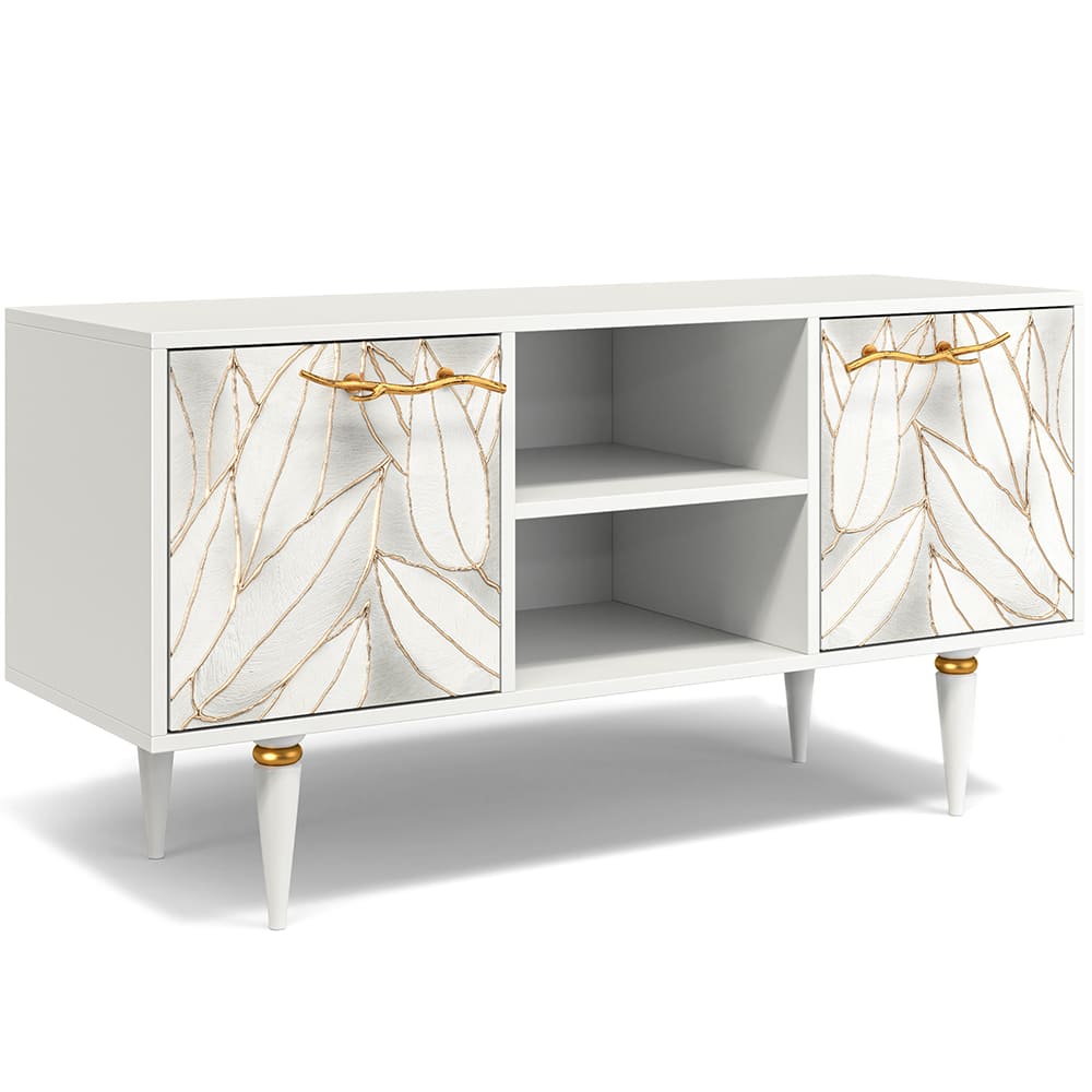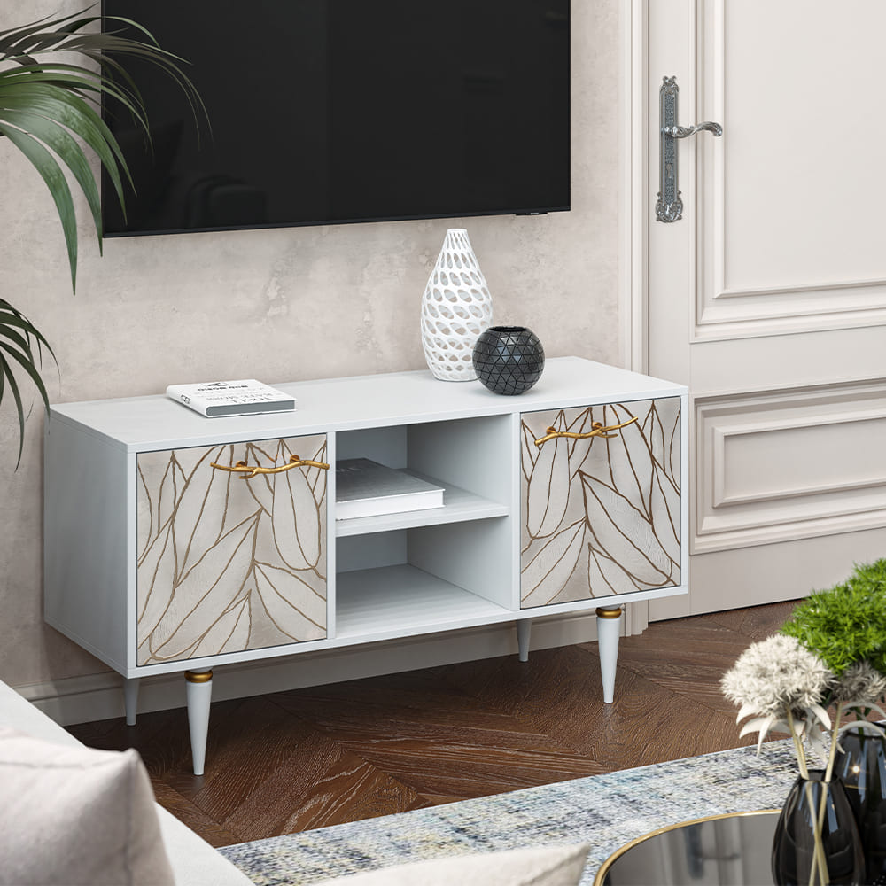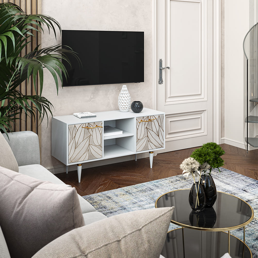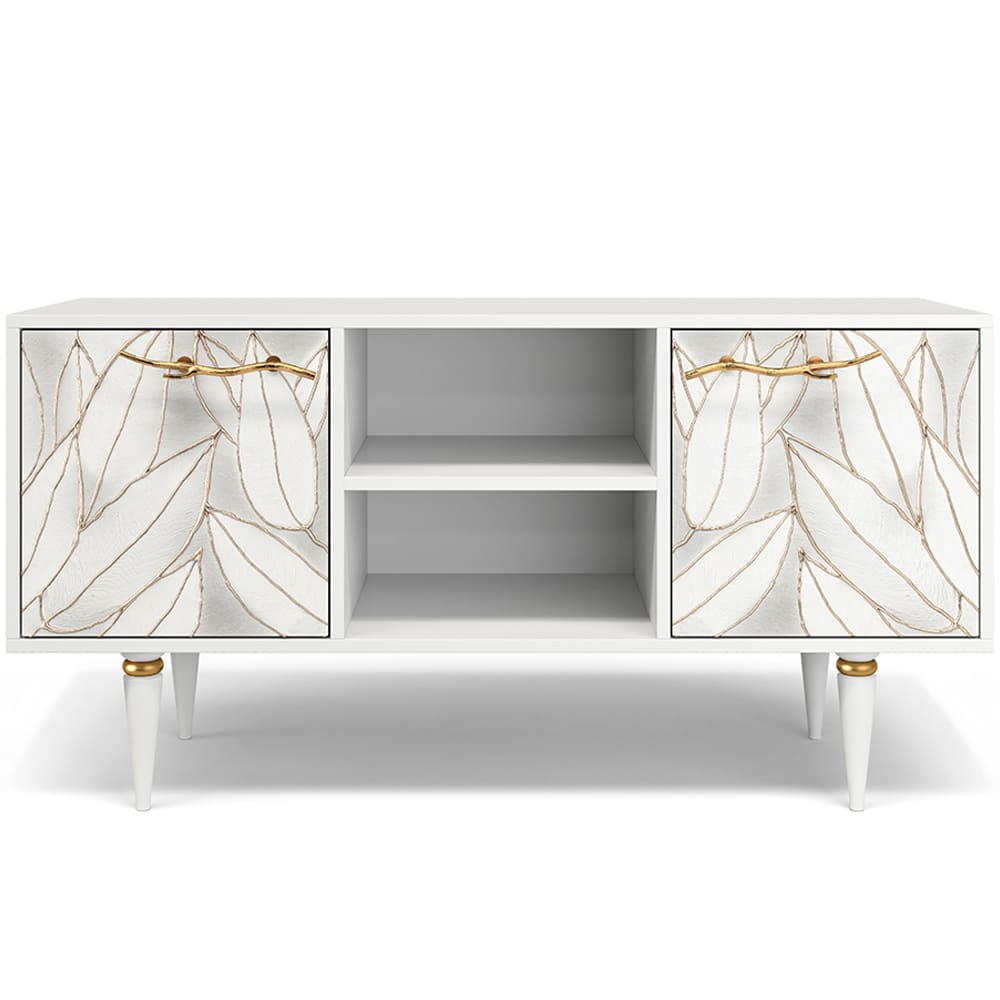 Деревянная тумба под ТВ представлена в двух цветах: белая и серая. Кованая ручка, авторская роспись фасадов мраморной пудрой, на изящных ножках, создающих эффект парения, – все это делает этот предмет мебели настоящим украшением в гостиную.Если использовать тумбу в качестве подставки для декора, книг, ваз, свечей, то она вполне может заменить классический комод для вещей в спальне. С задачей компактного хранения тумбочка также отлично справляется: имеются два закрытых отделения с вместительными полками и одно отделение для открытого хранения. Например, журналов или статуэток.