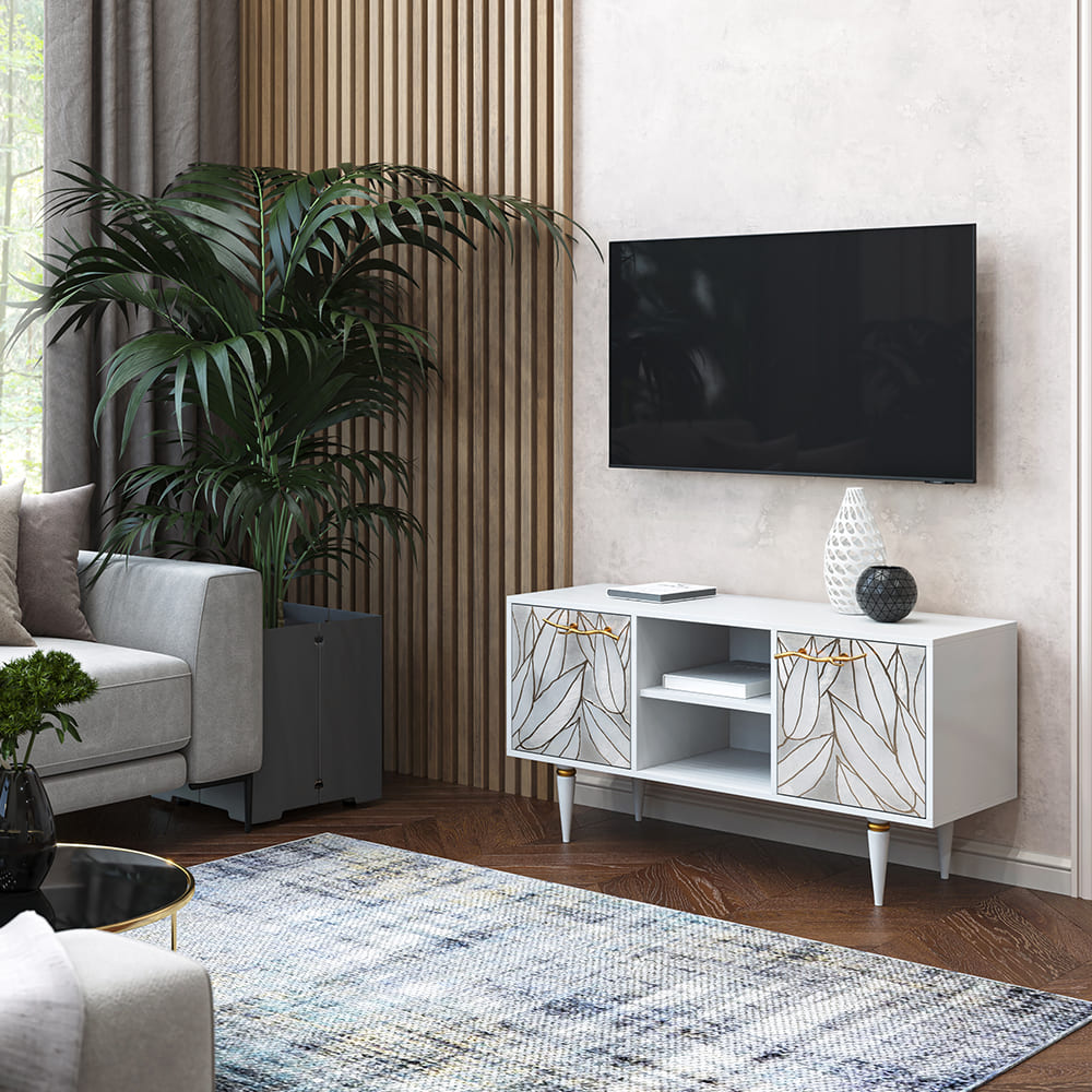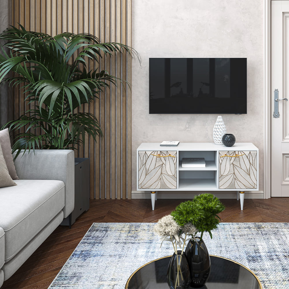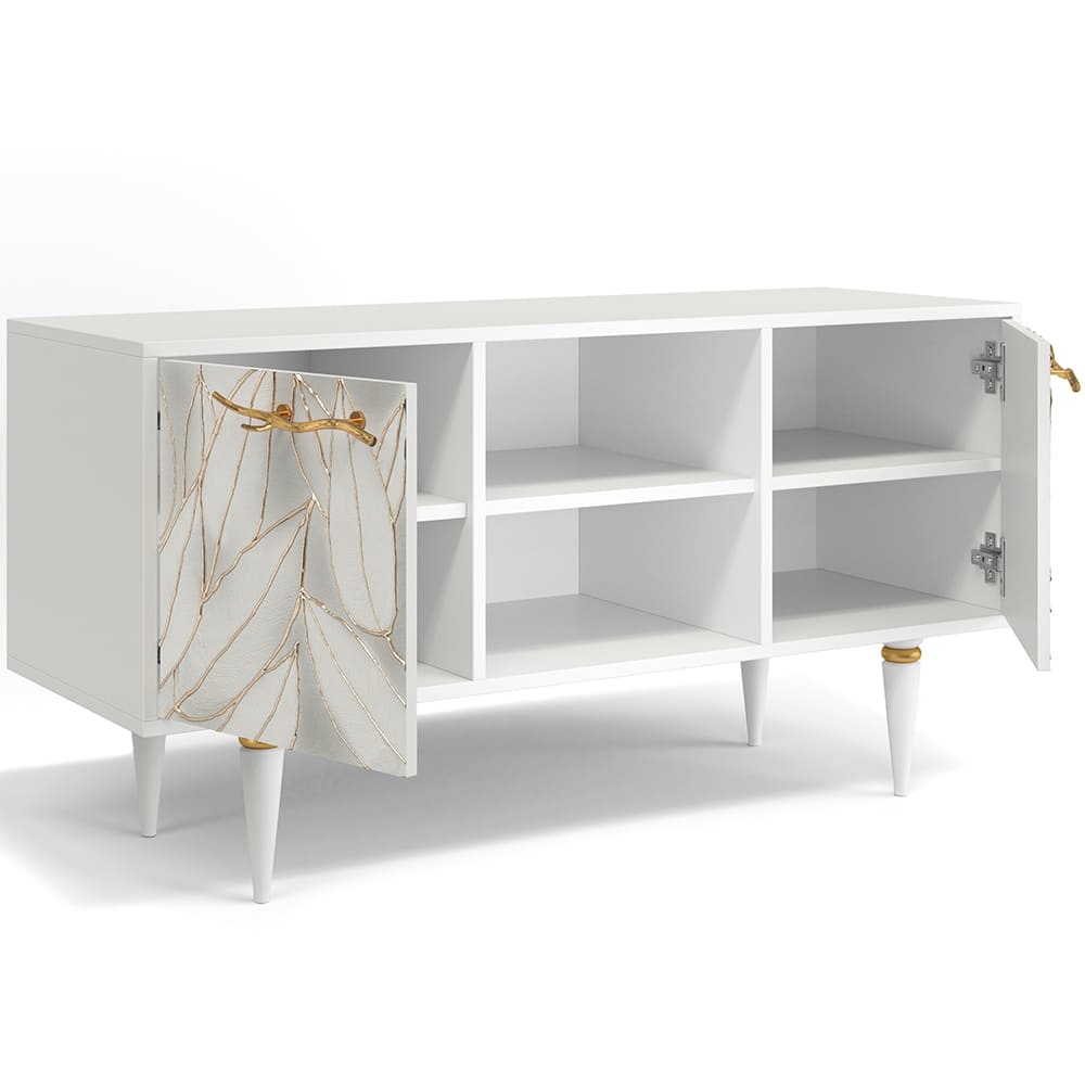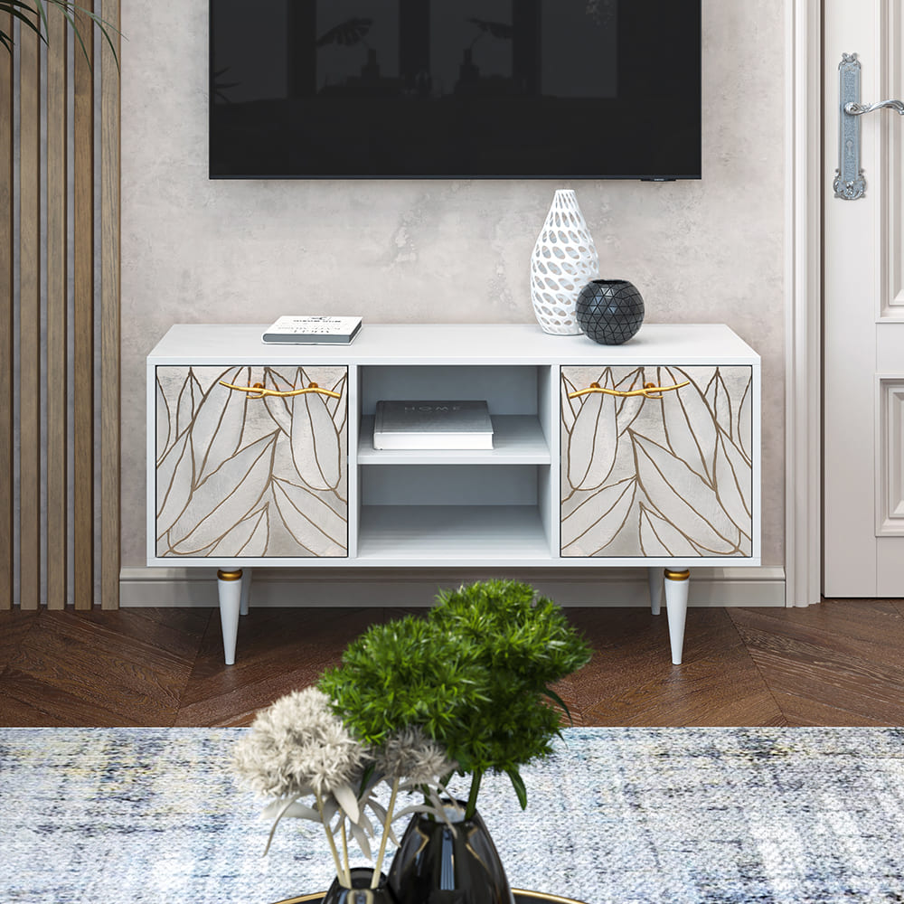 Деревянная тумба под ТВ представлена в двух цветах: белая и серая. Кованая ручка, авторская роспись фасадов мраморной пудрой, на изящных ножках, создающих эффект парения, – все это делает этот предмет мебели настоящим украшением в гостиную.Если использовать тумбу в качестве подставки для декора, книг, ваз, свечей, то она вполне может заменить классический комод для вещей в спальне. С задачей компактного хранения тумбочка также отлично справляется: имеются два закрытых отделения с вместительными полками и одно отделение для открытого хранения. Например, журналов или статуэток.