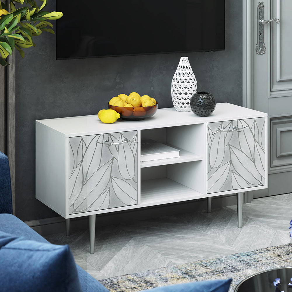 Деревянная тумба под Тв представлена в двух цветах: белая и серая. Кованая ручка, авторская роспись фасадов мраморной пудрой, на изящных ножках, создающих эффект парения, – все это делает этот предмет мебели настоящим украшением в гостиную.Если использовать тумбу в качестве подставки для декора, книг, ваз, свечей, то она вполне может заменить классический комод для вещей в спальне. С задачей компактного хранения тумбочка также отлично справляется: имеются два закрытых отделения с вместительными полками и одно отделение для открытого хранения. Например, журналов или статуэток.