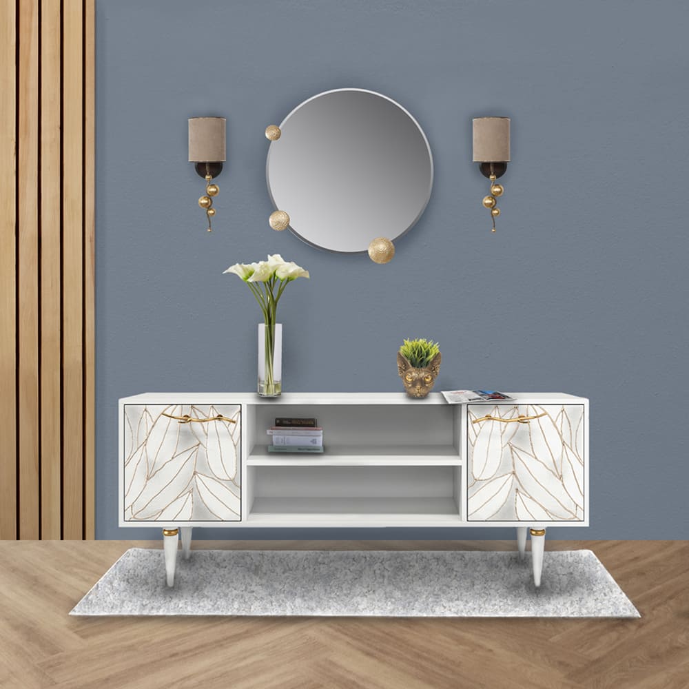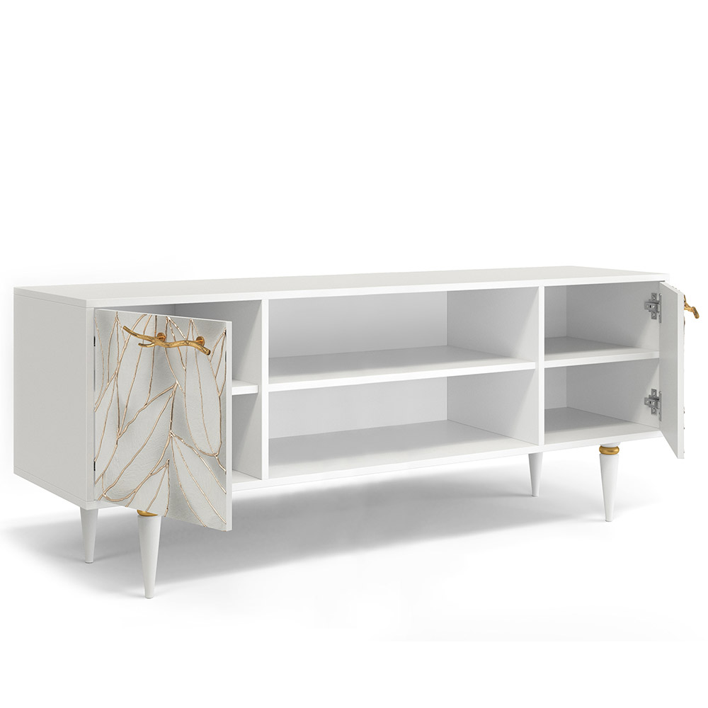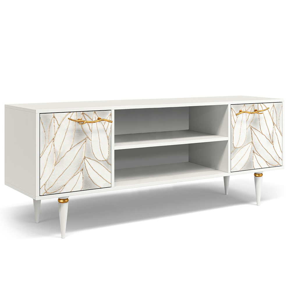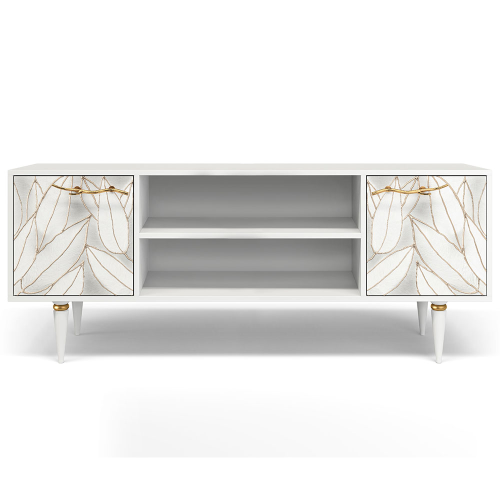 Тумба довольно вместительна и имеет два ящика с дверцами для закрытого хранения и две открытые ниши для мультимедийной техники и декоративных элементов. Функциональность и практичность ТВ-тумбы позволит эргономично обустроить пространство гостиной.