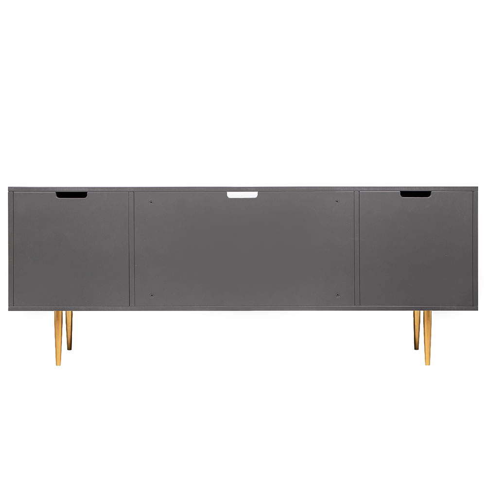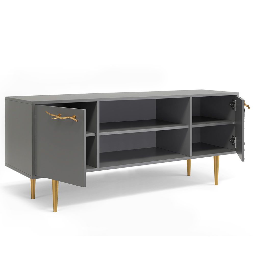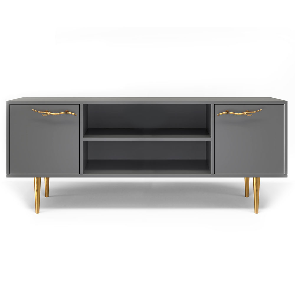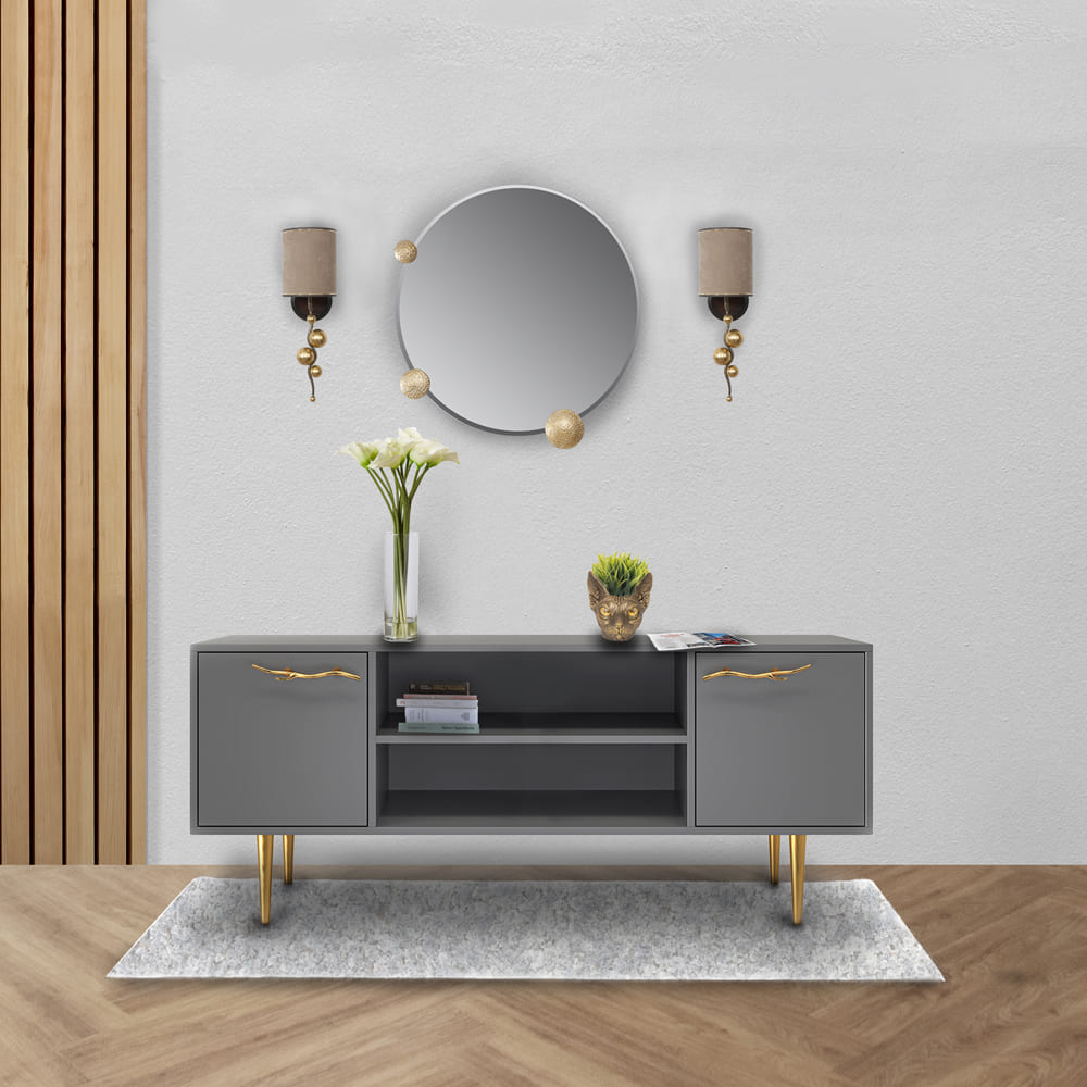 Деревянная тумба под ТВ представлена в двух цветах: белая и серая. Кованая ручка, авторская роспись фасадов мраморной пудрой, на изящных ножках, создающих эффект парения, – все это делает этот предмет мебели настоящим украшением в гостиную.