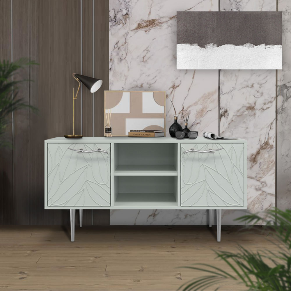 ТВ-тумба – тот предмет интерьера, в котором крайне важны не только эргономичность, но и декоративная функция. Ведь подставка под телевизор, как правило, размещается в основной части комнаты, где чаще всего собирается вся семья и гости. Дизайн тумбочки под тв Арт можно отнести к направлению сканди. Это современный стиль, который удачно подходит практически под любой интерьер. Однако минимализм от Bogacho несколько отличается от классического понимания. Это чистые оттенки и простые линии форм, доведенные до совершенства оригинальным декором. Кованая ручка, авторская роспись фасадов мраморной пудрой, на изящных ножках, создающих эффект парения, – все это делает этот предмет мебели настоящим украшением в гостиную. Если использовать тумбу в качестве подставки для декора, книг, ваз, свечей, то она вполне может заменить классический комод для вещей в спальне. С задачей компактного хранения тумбочка также отлично справляется: имеются два закрытых отделения с вместительными полками и одно отделение для открытого хранения. Например, журналов или статуэток. Максимальная нагрузка - до 80кг. Высота ножек - 19,8 см.