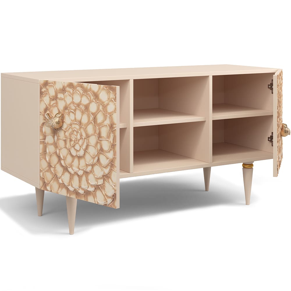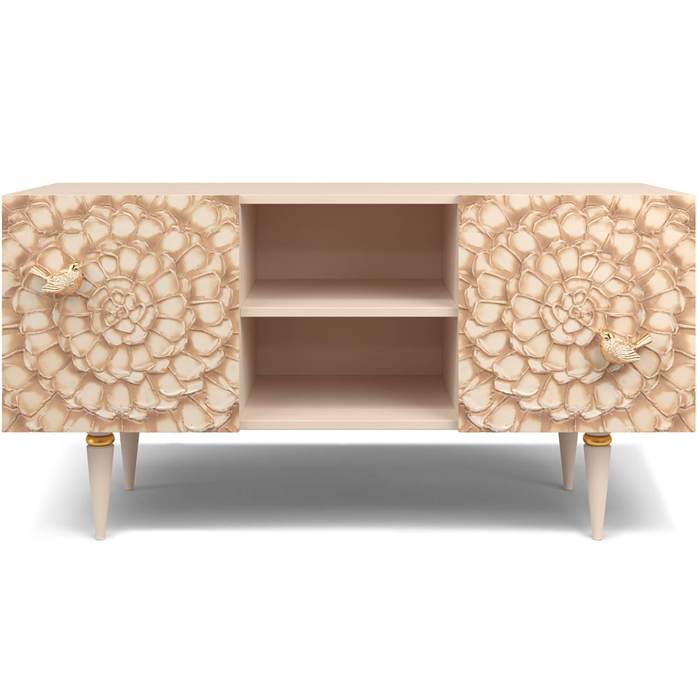 Деревянная тумба под ТВ представлена в двух природных цветах: бежевая и каштан. Мраморные птицы в качестве ручек, авторская роспись фасадов с цветами из мраморной пудры – все это делает этот предмет мебели настоящим украшением в гостиную.Если использовать тумбу в качестве подставки для декора, книг, ваз, свечей, то она вполне может заменить классический комод для вещей в спальне. С задачей компактного хранения тумбочка также отлично справляется: имеются два закрытых отделения с вместительными полками и одно отделение для открытого хранения. Например, журналов или статуэток.