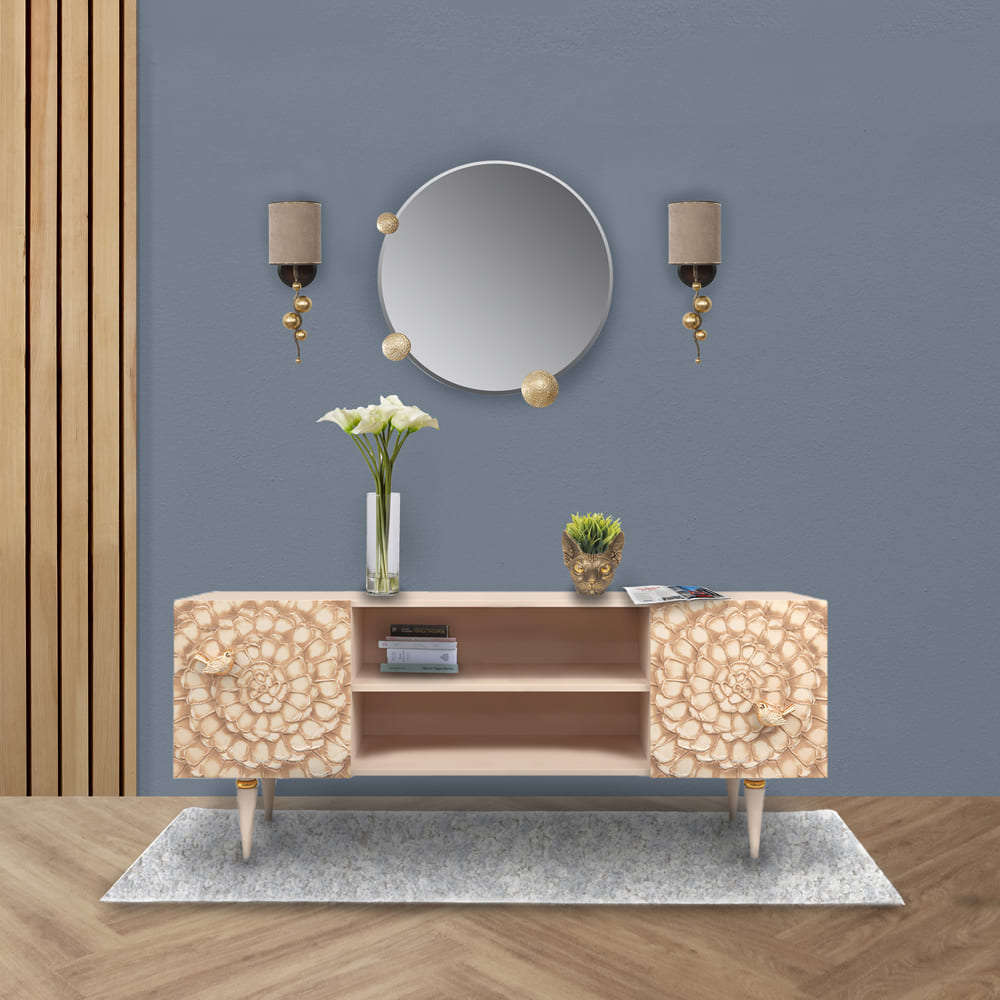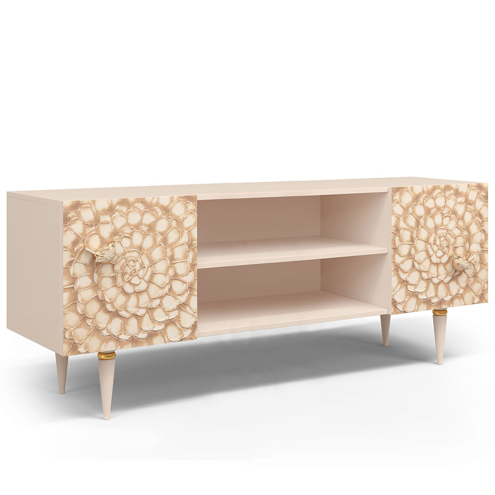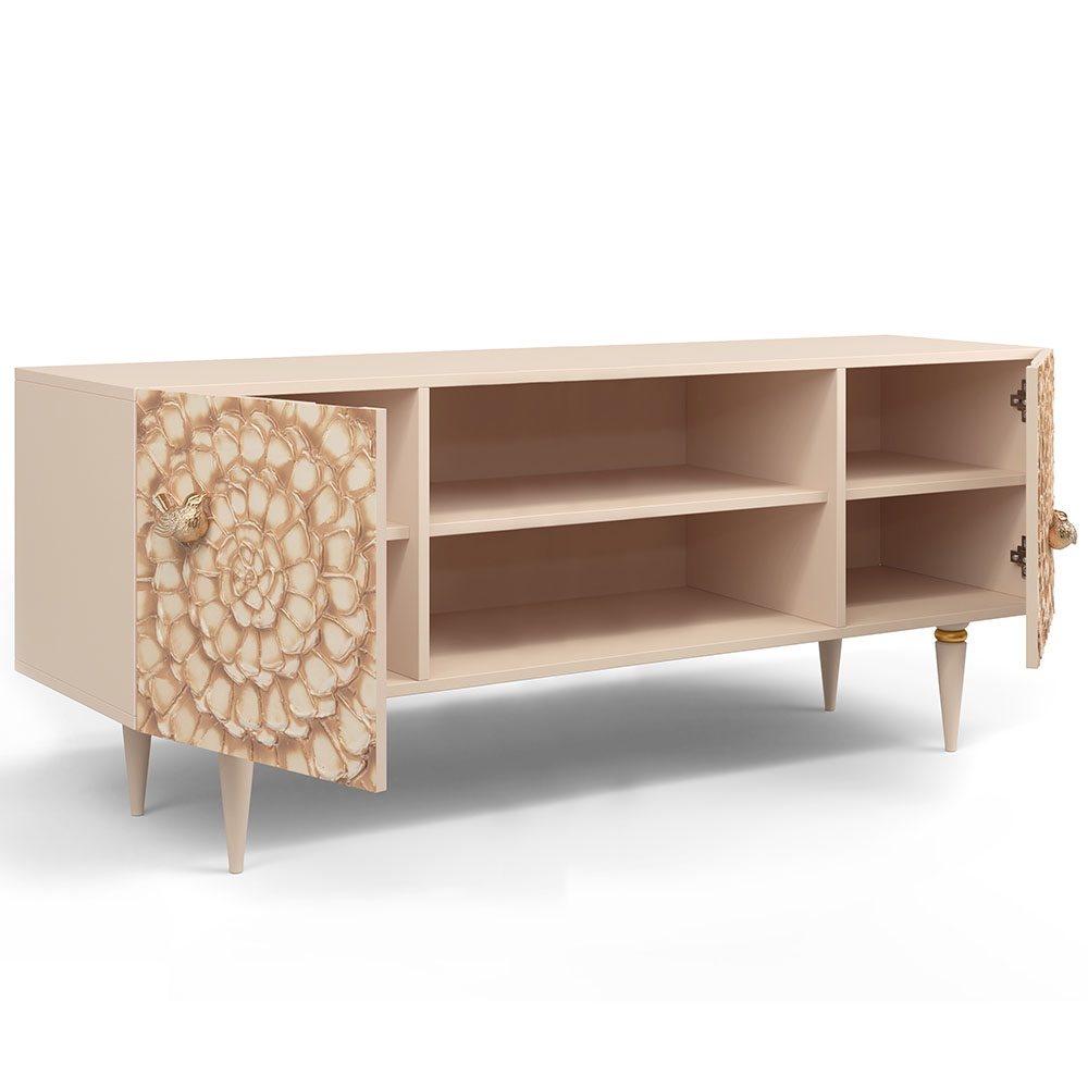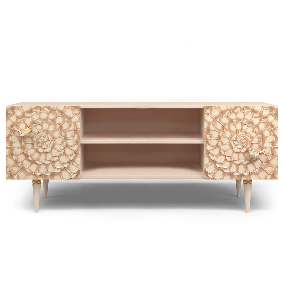 Деревянная тумба под ТВ представлена в двух природных цветах: бежевая и каштан. Мраморные птицы в качестве ручек, авторская роспись фасадов с цветами из мраморной пудры – все это делает этот предмет мебели настоящим украшением в гостиную.