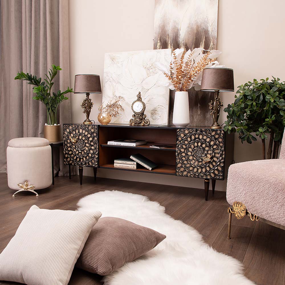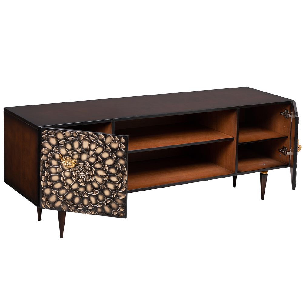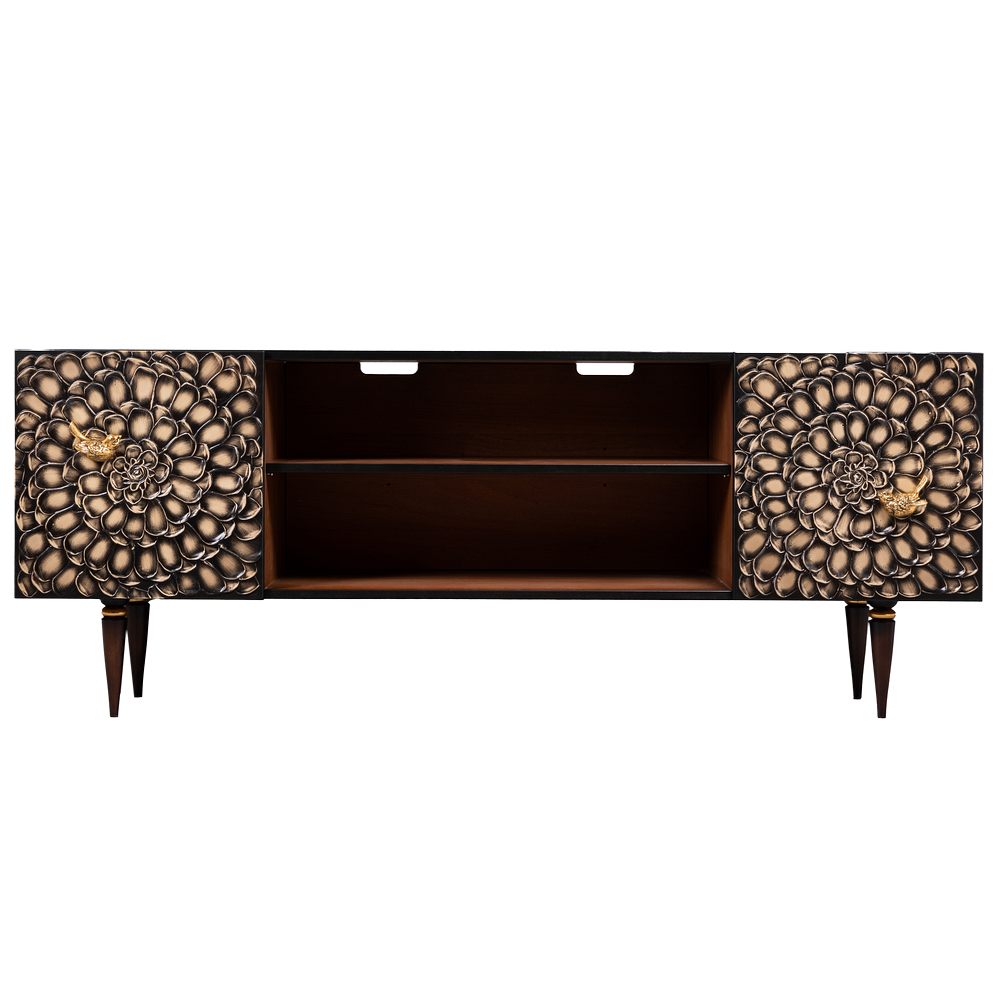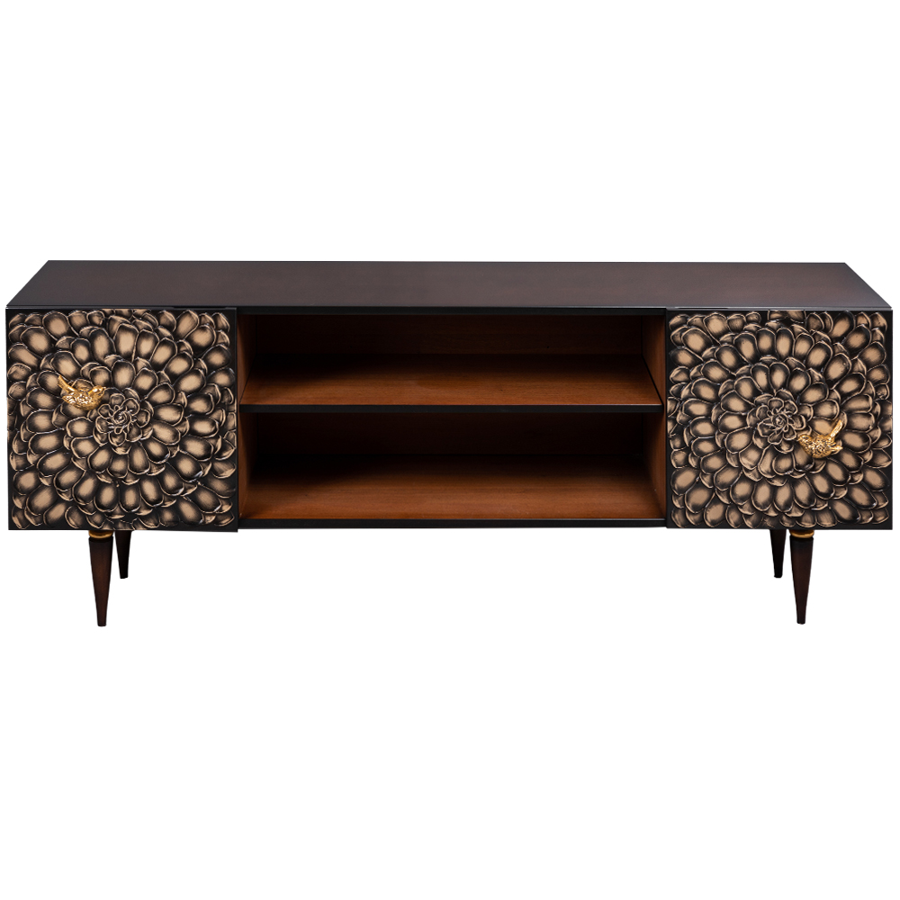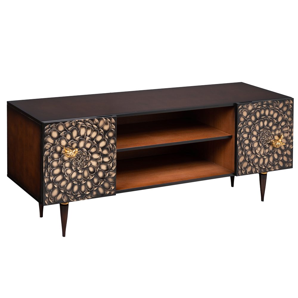 ТВ-тумба – тот предмет интерьера, в котором крайне важны не только эргономичность, но и декоративная функция. Ведь подставка под телевизор, как правило, размещается в основной части комнаты, где чаще всего собирается вся семья и гости. Дизайн тумбочки под тв Терра можно отнести к стилю романтизм, который легко может стать как акцентной деталью в современном интерьере, так и органично влиться в общий классический стиль комнаты. Деревянная тумба под ТВ представлена в двух природных цветах: бежевая и каштан. Мраморные птицы в качестве ручек, авторская роспись фасадов с цветами из мраморной пудры – все это делает этот предмет мебели настоящим украшением в гостиную. Если использовать тумбу в качестве подставки для декора, книг, ваз, свечей, то она вполне может заменить классический комод для вещей в спальне. С задачей компактного хранения тумбочка также отлично справляется: имеются два закрытых отделения с вместительными полками и одно отделение для открытого хранения. Например, журналов или статуэток. Ножки изготовлены из бука. Максимальная нагрузка - до 80кг.