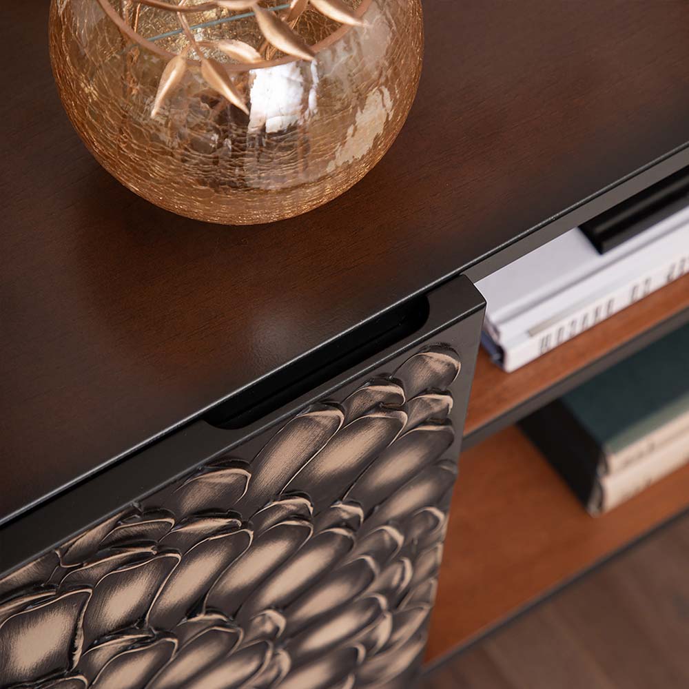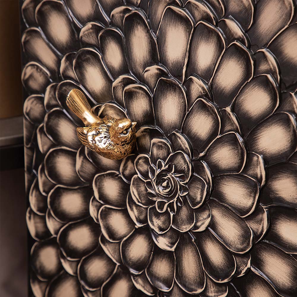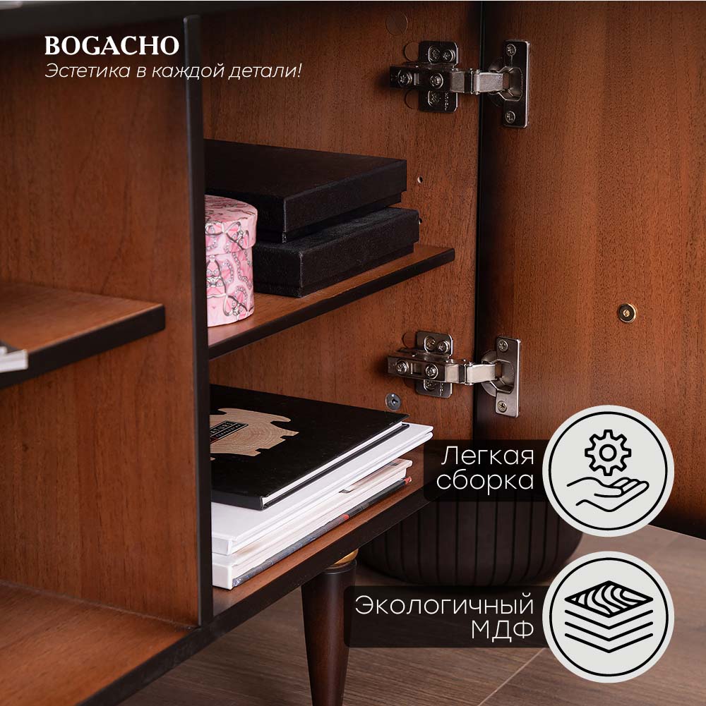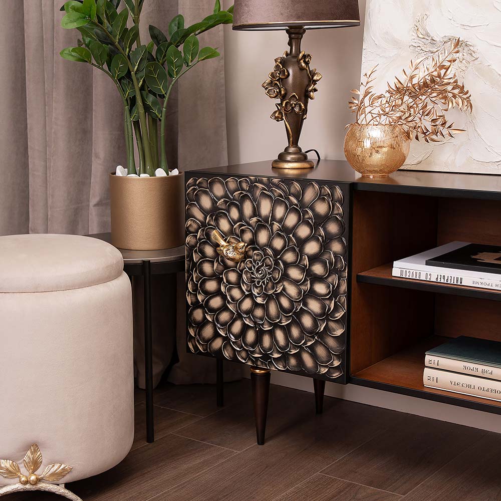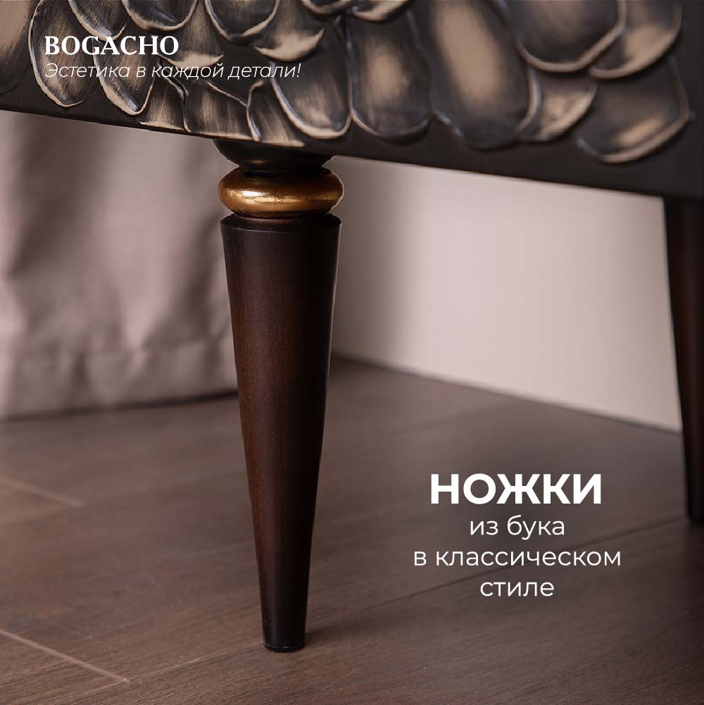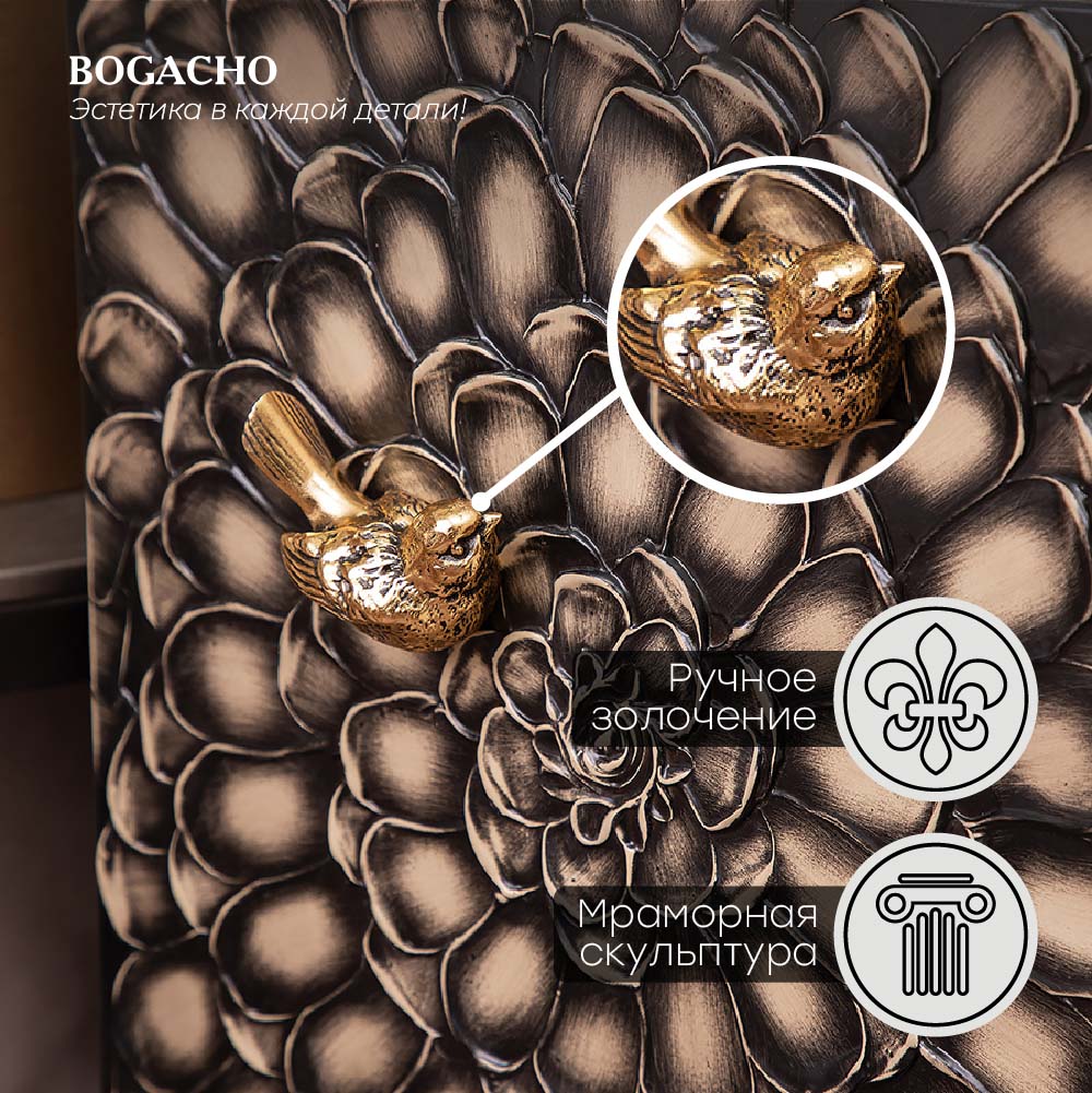 ТВ-тумба – тот предмет интерьера, в котором крайне важны не только эргономичность, но и декоративная функция. Ведь подставка под телевизор, как правило, размещается в основной части комнаты, где чаще всего собирается вся семья и гости. Дизайн тумбочки под тв Терра можно отнести к стилю романтизм, который легко может стать как акцентной деталью в современном интерьере, так и органично влиться в общий классический стиль комнаты. Деревянная тумба под ТВ представлена в двух природных цветах: бежевая и каштан. Мраморные птицы в качестве ручек, авторская роспись фасадов с цветами из мраморной пудры – все это делает этот предмет мебели настоящим украшением в гостиную. Если использовать тумбу в качестве подставки для декора, книг, ваз, свечей, то она вполне может заменить классический комод для вещей в спальне. С задачей компактного хранения тумбочка также отлично справляется: имеются два закрытых отделения с вместительными полками и одно отделение для открытого хранения. Например, журналов или статуэток. Ножки изготовлены из бука. Максимальная нагрузка - до 80кг.