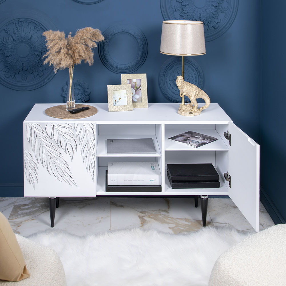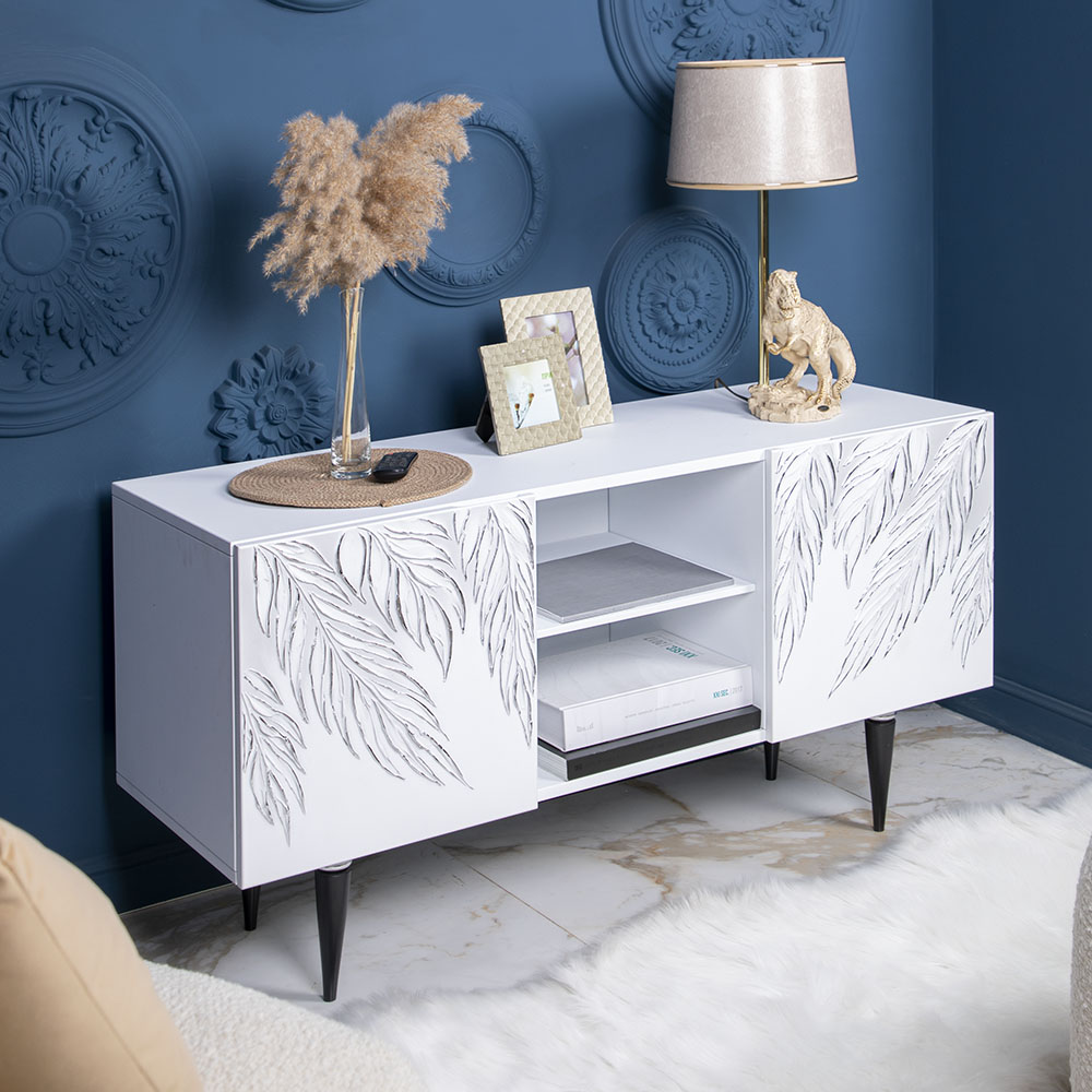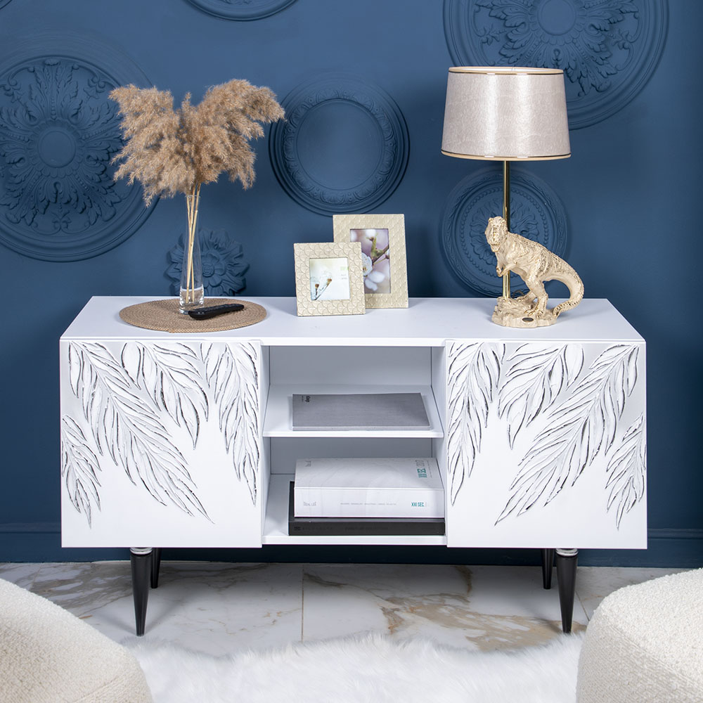 ТВ-тумба – тот предмет интерьера, в котором крайне важны не только эргономичность, но и декоративная функция. Ведь подставка под телевизор, как правило, размещается в основной части комнаты, где чаще всего собирается вся семья и гости. Дизайн тумбочки под тв Тропик можно отнести к направлению сканди. Это современный стиль, который удачно подходит практически под любой интерьер. Однако минимализм от Bogacho несколько отличается от классического понимания. Это чистые оттенки и простые линии форм, доведенные до совершенства оригинальным декором. Деревянная тумба под ТВ представлена в двух цветах: белая и серая. Кованая ручка, авторская роспись фасадов мраморной пудрой, на изящных ножках, создающих эффект парения, – все это делает этот предмет мебели настоящим украшением в гостиную.Если использовать тумбу в качестве подставки для декора, книг, ваз, свечей, то она вполне может заменить классический комод для вещей в спальне. С задачей компактного хранения тумбочка также отлично справляется: имеются два закрытых отделения с вместительными полками и одно отделение для открытого хранения. Например, журналов или статуэток. Ножки изготовлены из бука. Максимальная нагрузка - до 80кг.
