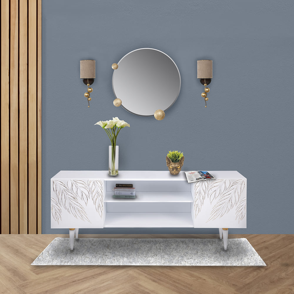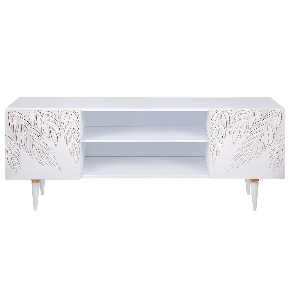 ТВ-тумба – тот предмет интерьера, в котором крайне важны не только эргономичность, но и декоративная функция. Ведь подставка под телевизор, как правило, размещается в основной части комнаты, где чаще всего собирается вся семья и гости. Дизайн тумбочки под тв Тропик можно отнести к направлению сканди. Это современный стиль, который удачно подходит практически под любой интерьер. Однако минимализм от Bogacho несколько отличается от классического понимания. Это чистые оттенки и простые линии форм, доведенные до совершенства оригинальным декором. Деревянная тумба под ТВ представлена в двух цветах: белая и серая. Авторская роспись фасадов мраморной пудрой, на изящных ножках, создающих эффект парения, – все это делает этот предмет мебели настоящим украшением в гостиную.Если использовать тумбу в качестве подставки для декора, книг, ваз, свечей, то она вполне может заменить классический комод для вещей в спальне. С задачей компактного хранения тумбочка также отлично справляется: имеются два закрытых отделения с вместительными полками и одно отделение для открытого хранения. Например, журналов или статуэток. Ножки изготовлены из бука. Максимальная нагрузка - до 80кг.