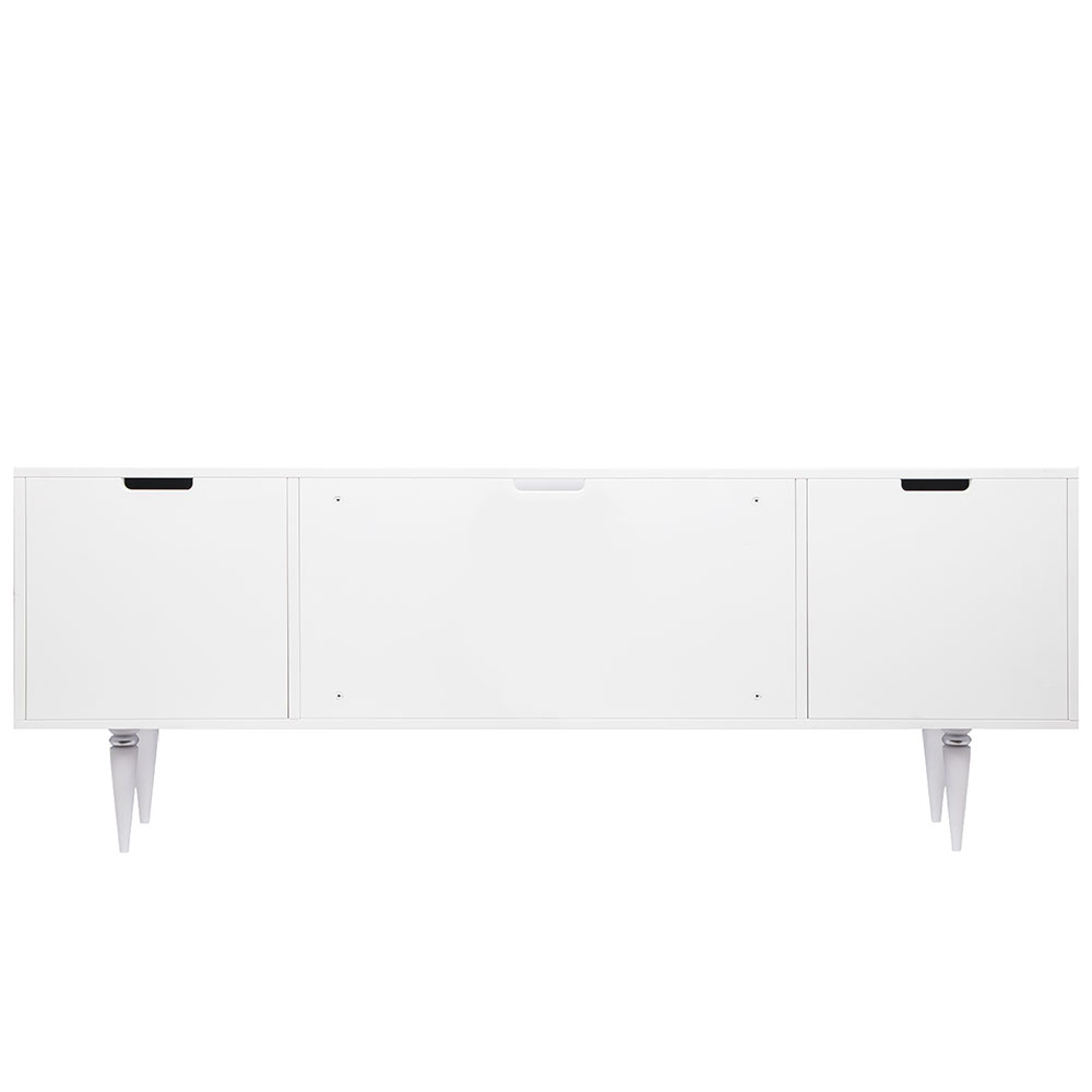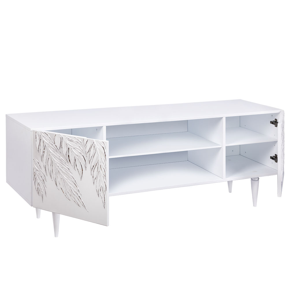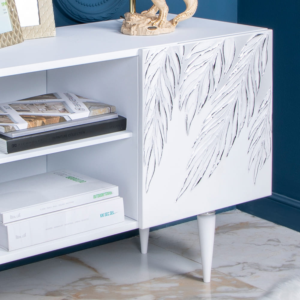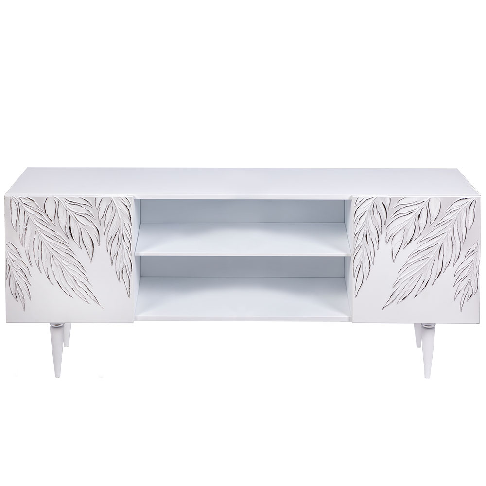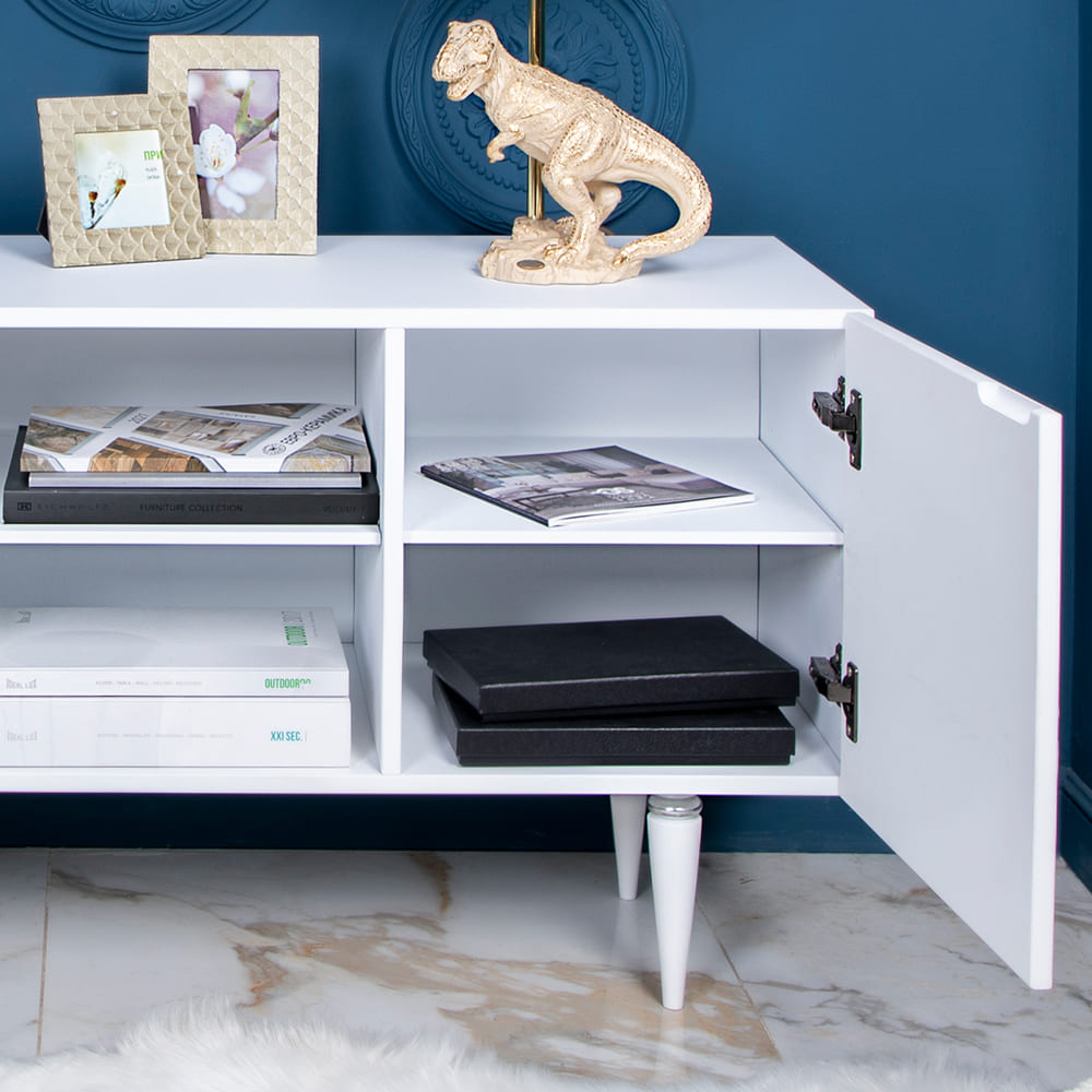 Деревянная тумба под ТВ представлена в двух цветах: белая и серая. Авторская роспись фасадов мраморной пудрой, на изящных ножках, создающих эффект парения, – все это делает этот предмет мебели настоящим украшением в гостиную.Если использовать тумбу в качестве подставки для декора, книг, ваз, свечей, то она вполне может заменить классический комод для вещей в спальне. С задачей компактного хранения тумбочка также отлично справляется: имеются два закрытых отделения с вместительными полками и одно отделение для открытого хранения. Например, журналов или статуэток.
