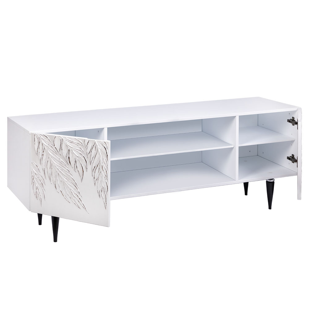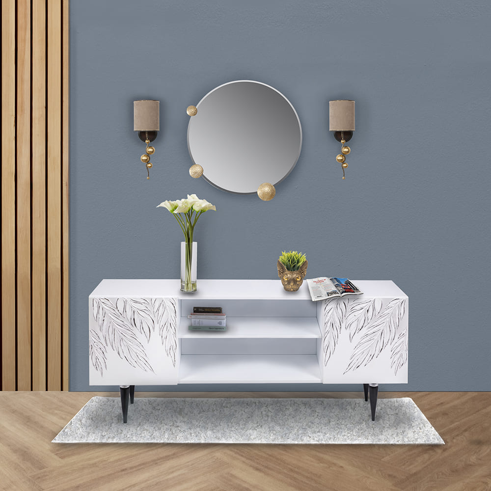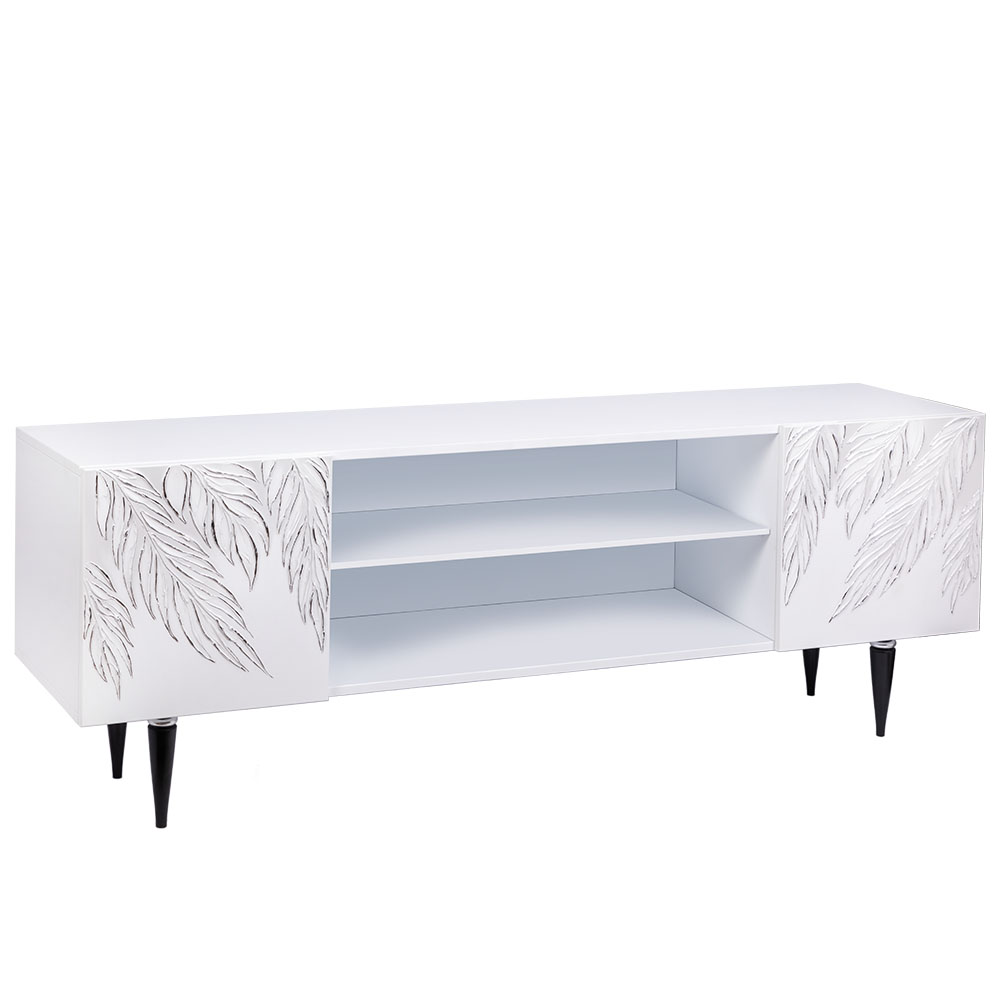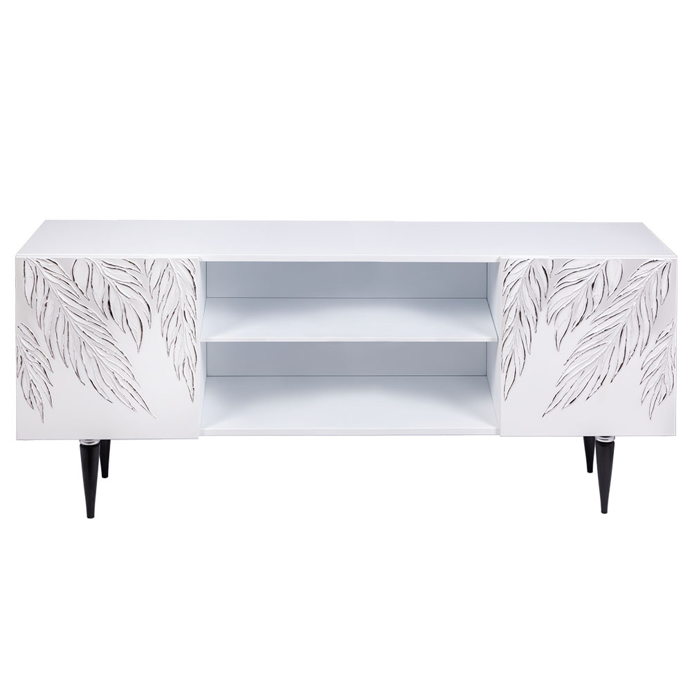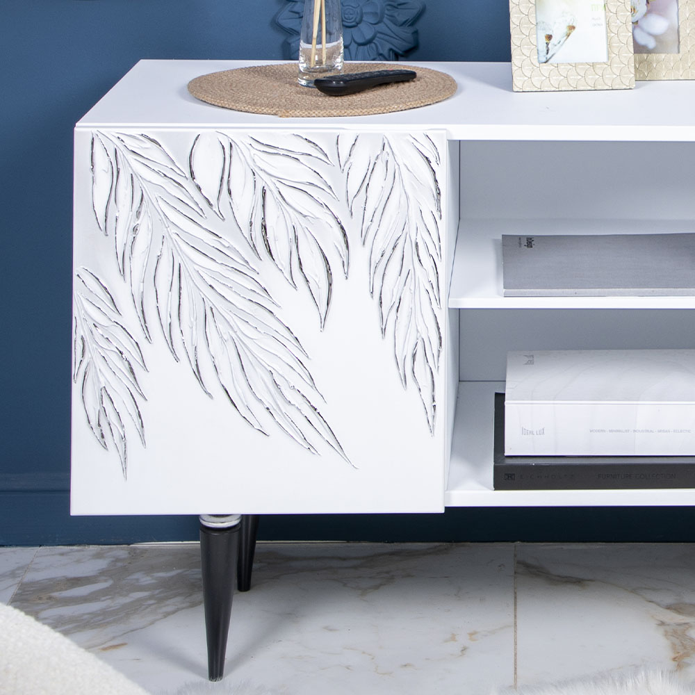 ТВ-тумба – тот предмет интерьера, в котором крайне важны не только эргономичность, но и декоративная функция. Ведь подставка под телевизор, как правило, размещается в основной части комнаты, где чаще всего собирается вся семья и гости. Дизайн тумбочки под тв Тропик можно отнести к направлению сканди. Это современный стиль, который удачно подходит практически под любой интерьер. Однако минимализм от Bogacho несколько отличается от классического понимания. Это чистые оттенки и простые линии форм, доведенные до совершенства оригинальным декором. Деревянная тумба под ТВ представлена в двух цветах: белая и серая. Авторская роспись фасадов мраморной пудрой, на изящных ножках, создающих эффект парения, – все это делает этот предмет мебели настоящим украшением в гостиную.Если использовать тумбу в качестве подставки для декора, книг, ваз, свечей, то она вполне может заменить классический комод для вещей в спальне. С задачей компактного хранения тумбочка также отлично справляется: имеются два закрытых отделения с вместительными полками и одно отделение для открытого хранения. Например, журналов или статуэток. Ножки изготовлены из бука. Максимальная нагрузка - до 80кг.