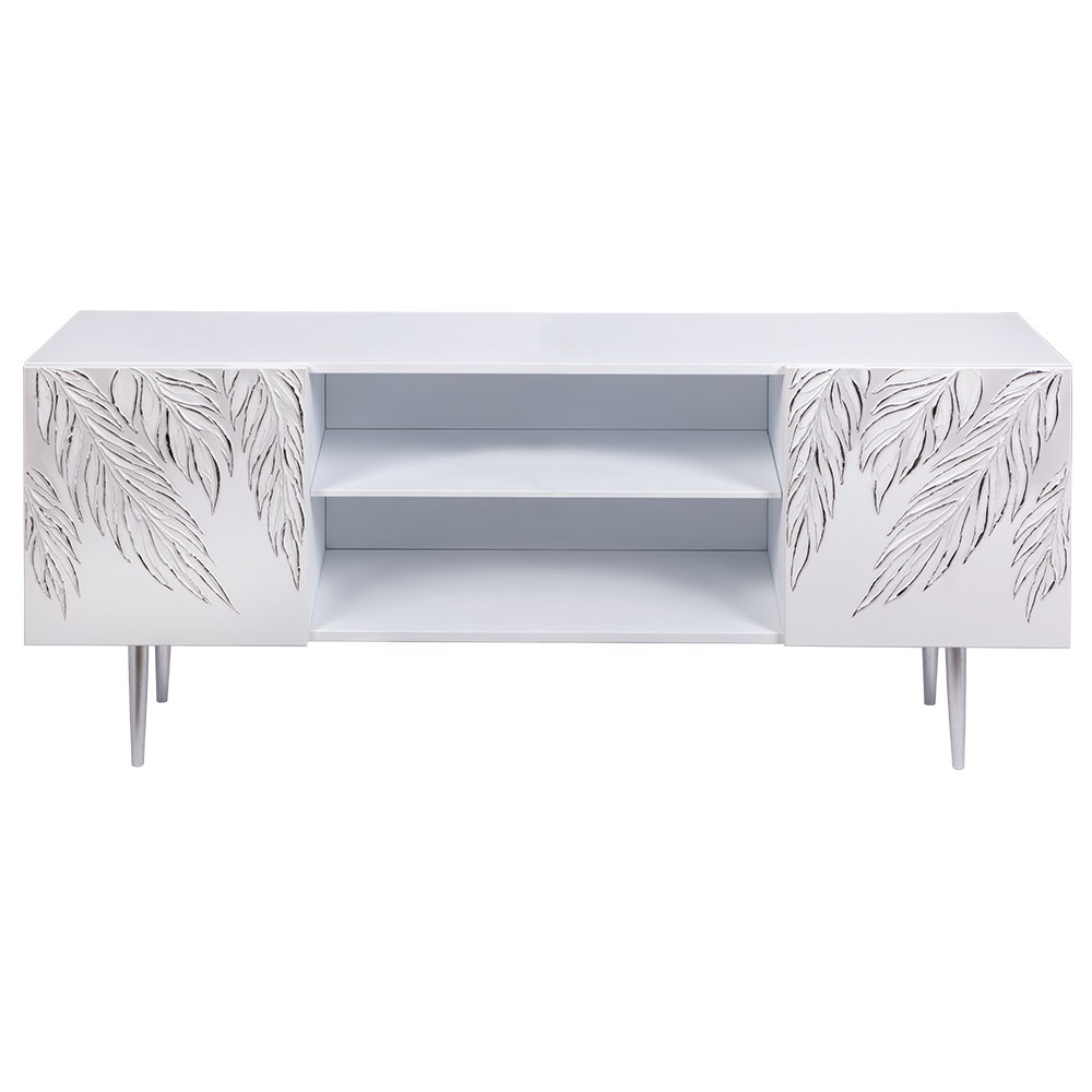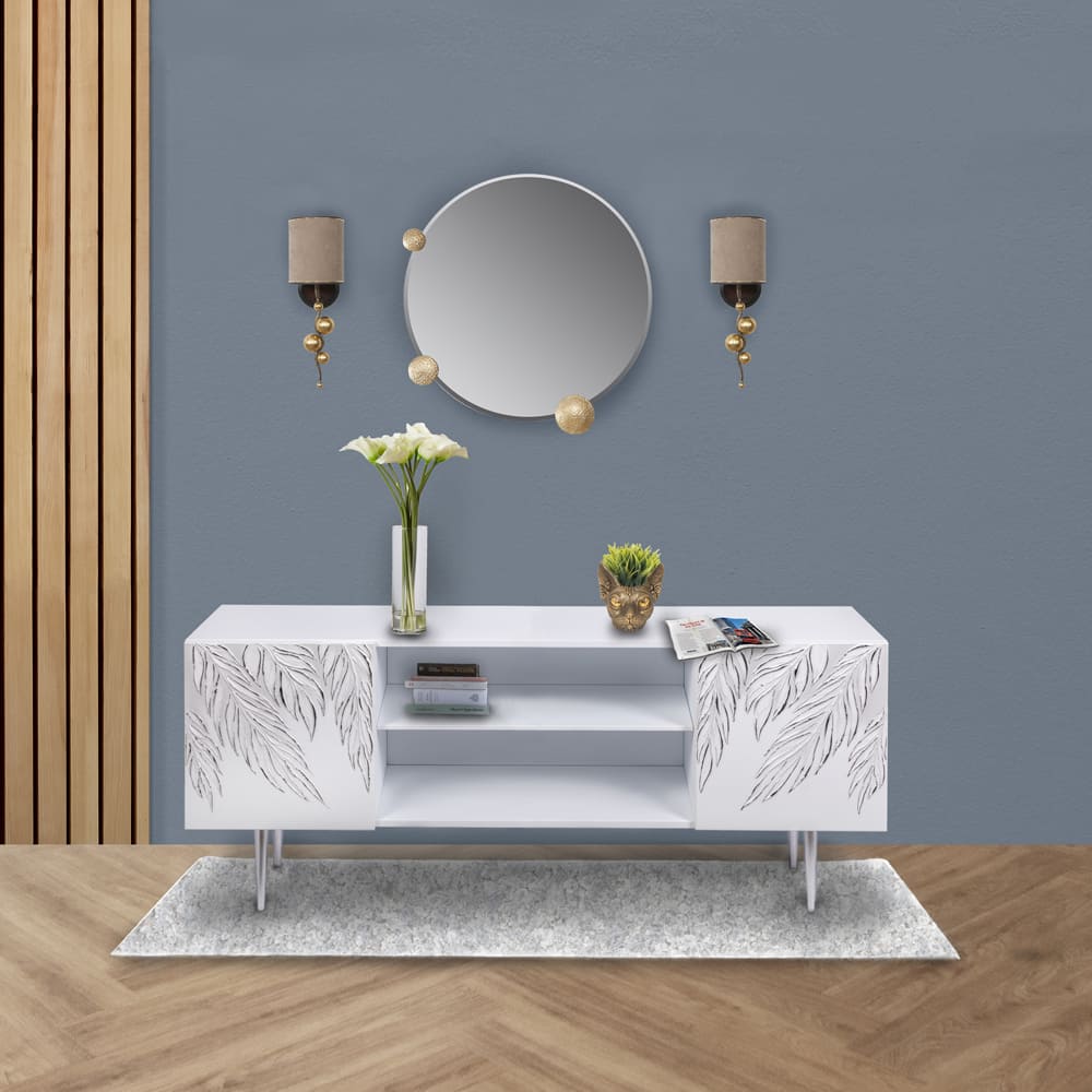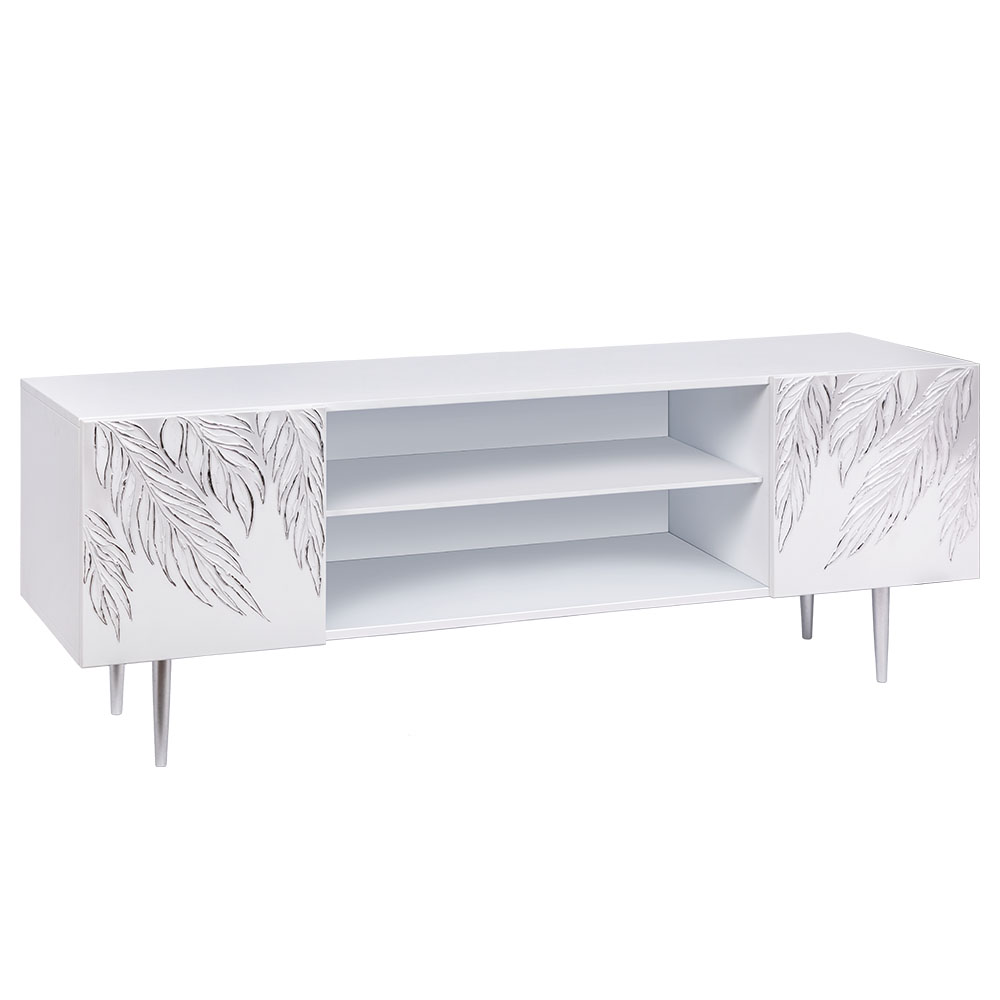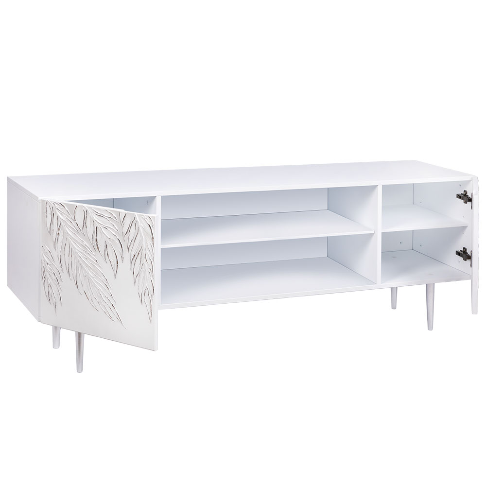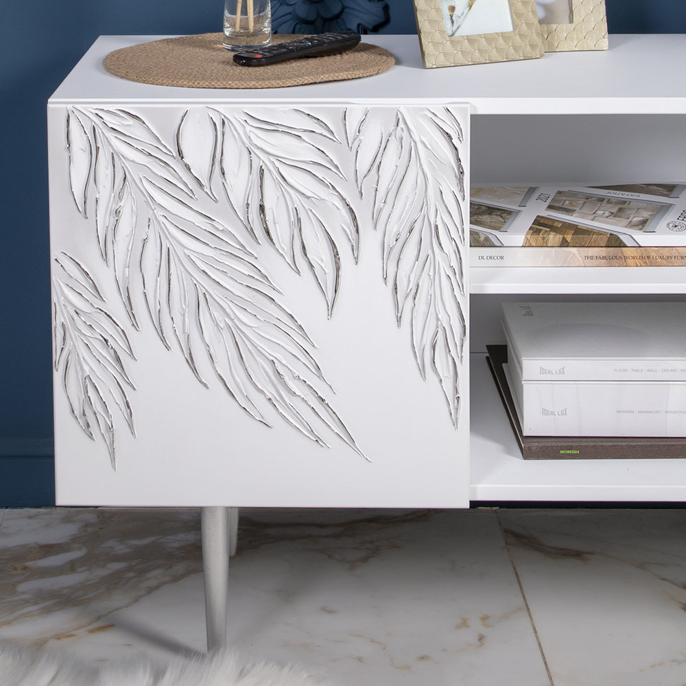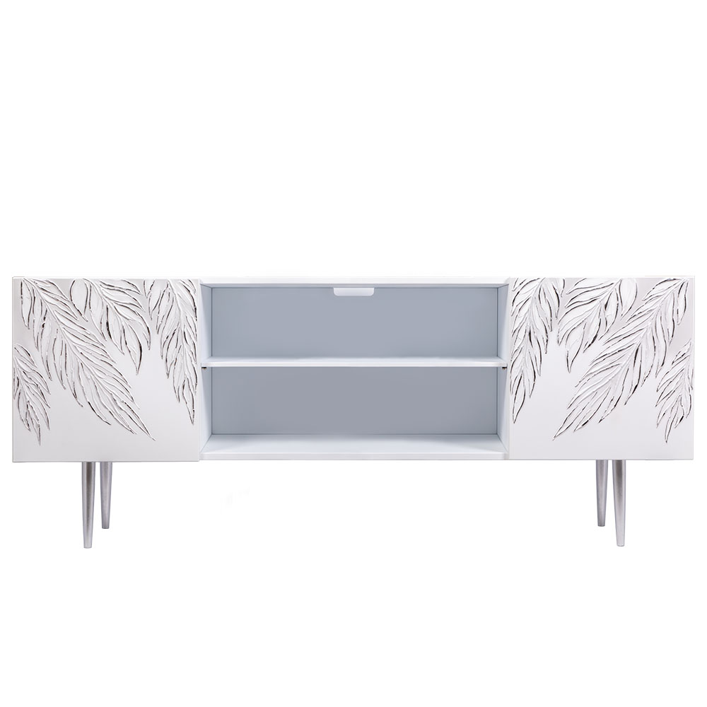 Деревянная тумба под ТВ представлена в двух цветах: белая и серая. Авторская роспись фасадов мраморной пудрой, на изящных ножках, создающих эффект парения, – все это делает этот предмет мебели настоящим украшением в гостиную.