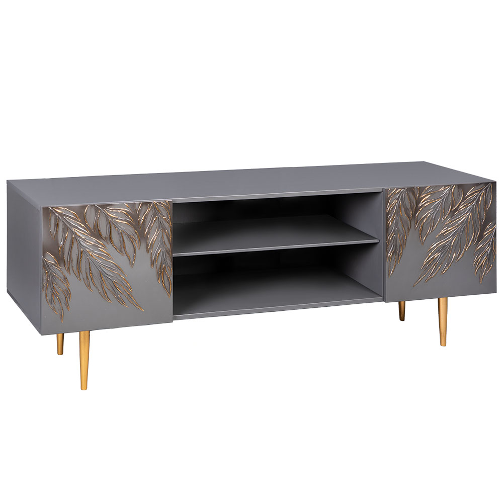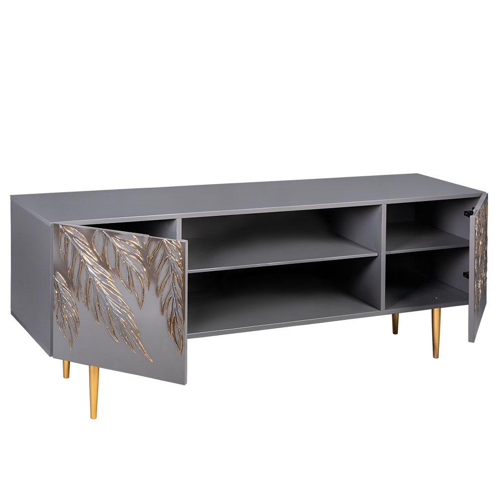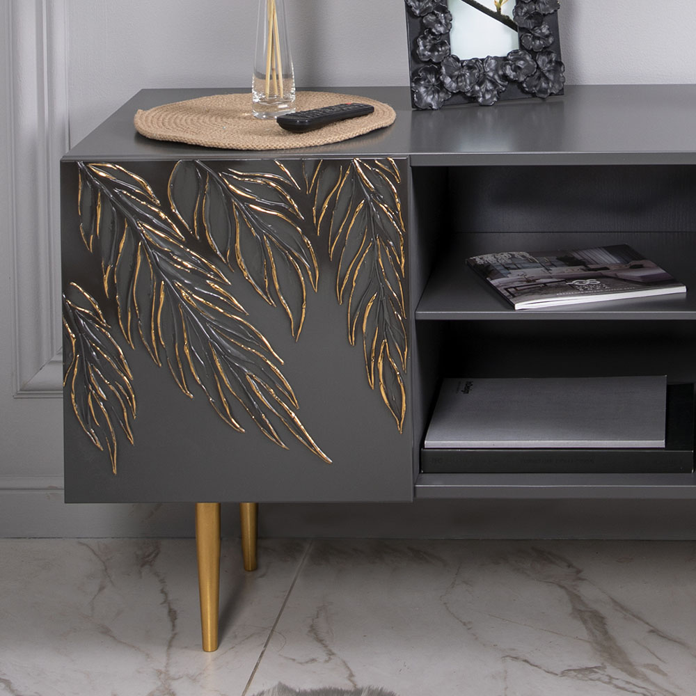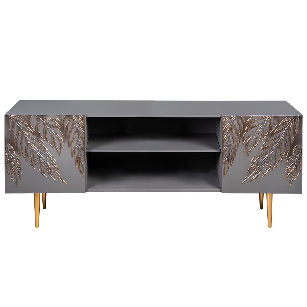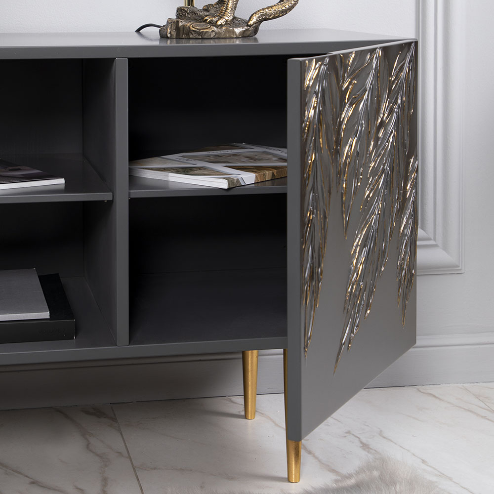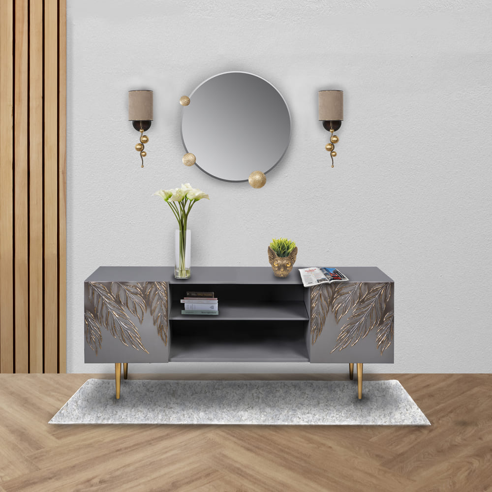 Деревянная тумба под ТВ представлена в двух цветах: белая и серая. Авторская роспись фасадов мраморной пудрой, на изящных ножках, создающих эффект парения, – все это делает этот предмет мебели настоящим украшением в гостиную.